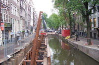 Вода в каналах четыре раза в неделю по ночам частично выкачивается и заменяется свежей. На фотографии показан ремонт канала в районе красных фонарей, на улице, где был расположен мой отель: на барже расположена сваезабивочная машина, укрепляющая берега.