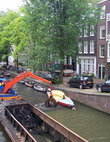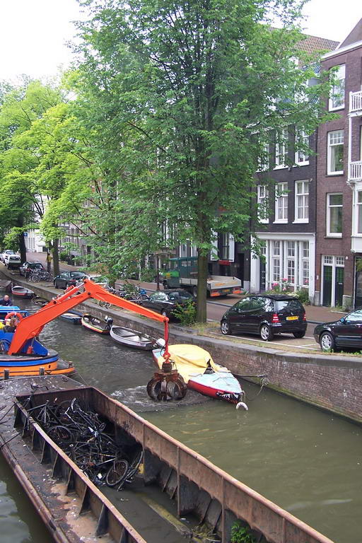 Дрезденом гораздо хуже и старее, они зачастую напоминают больше развалюхи, чем средство передвижения, это связано, наверное, и с тем, что тут развита привычка использовать чужие велосипеды. Велосипеды в Амстердаме повсюду, как видно и из приведенных выше фотографий, особенно их много около железнодорожного вокзала. Множество велосипедов заканчивают свой век в каналах. Так много, что в городском хозяйстве завели специальный подъемный кран, чтобы вылавливать велосипеды из воды. Я немного понаблюдал за работой такого крана - особенно много велосипедов было им выловлено около моста через канал, к парапетам небольших мостов в Амстердаме очень часто паркуют велосипеды, поскольку стоянки для них предусмотрены далеко не везде.