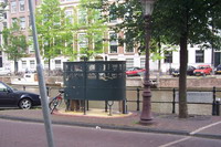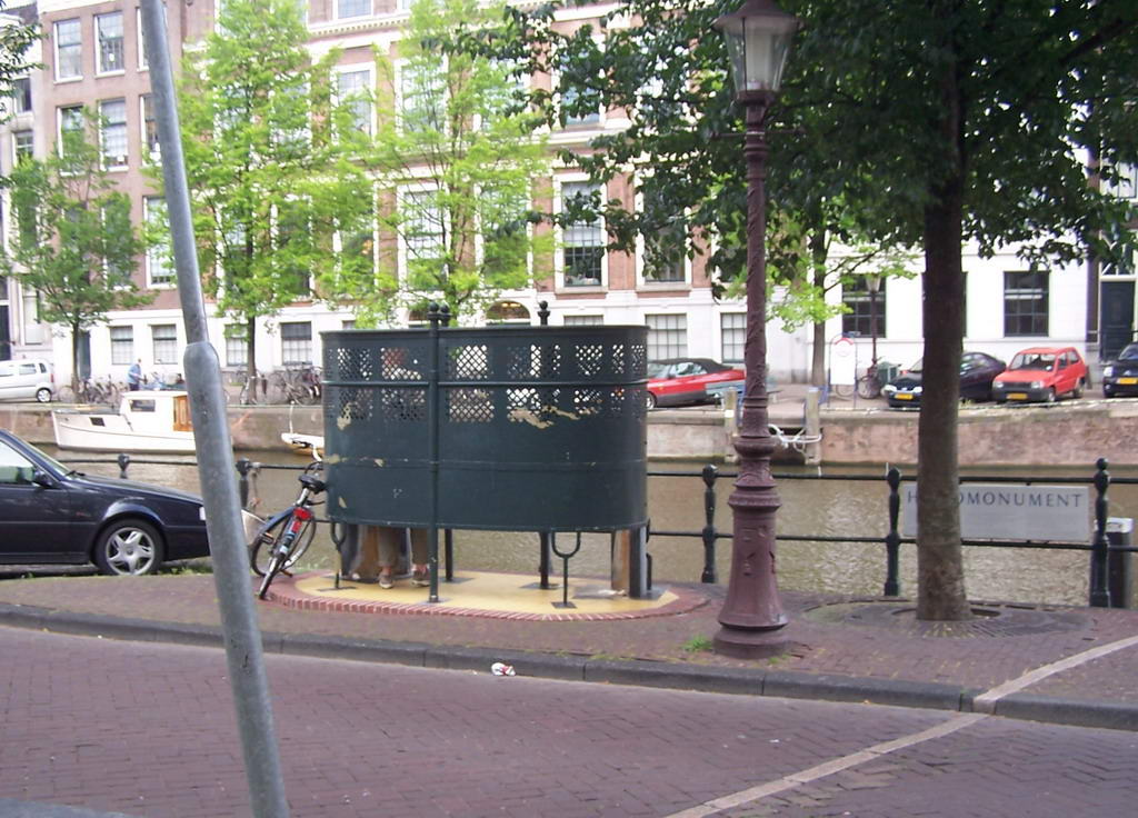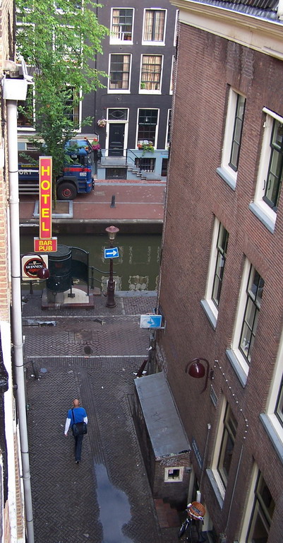 Бурная жизнь в этом квартале начинается, когда начинает темнеть - толпы туристов снуют по двум улицам и прилегающим к ним проулкам, образующим этот квартал, и в таком виде жизнь в квартале кипит далеко за полночь. Жил в отеле я на четвертом этаже, было жарко, поэтому приходилось открывать окно, а с открытыми окнами уснуть там сложновато. Окна моего номера выходили в переулок, на котором в здании напротив в свете красных ламп стояли девушки древнейшей профессии, соответственно, весь процесс приобретения "любви" был как на ладони. Он до боли напомнил мне отечественный всем известный фильм Э.Рязанова с фразами "Цигель-цигель, ай-лю-лю, ай-лю-лююю!" Это все примерно так и выглядело, когда весьма пышных форм девица пыталась затащить клиента, открыв окно, при этом цыкая и маня пальцем, а когда клиент срывался, она очень нервничала, и вслед клиенту с резкими жестами сыпалась "непереводимая игра слов с использованием местных идиоматических выражений". Тебя, мой юный друг, наверное, интересует порядок цен в этом квартале?:-) Так вот, стоит это сомнительное удовольствие платной любви около 50 евро, и красавиц там, объективности ради, не много. Я сфотографировал этот переулок ночью и утром, как видно на второй фотографии, рядом с каналом расположено металлическое сооружение - это такой амстердамский общественный бесплатный туалет, в который ты можешь зайти и, так сказать, при всем честном народе, справить свою малую нужду.
