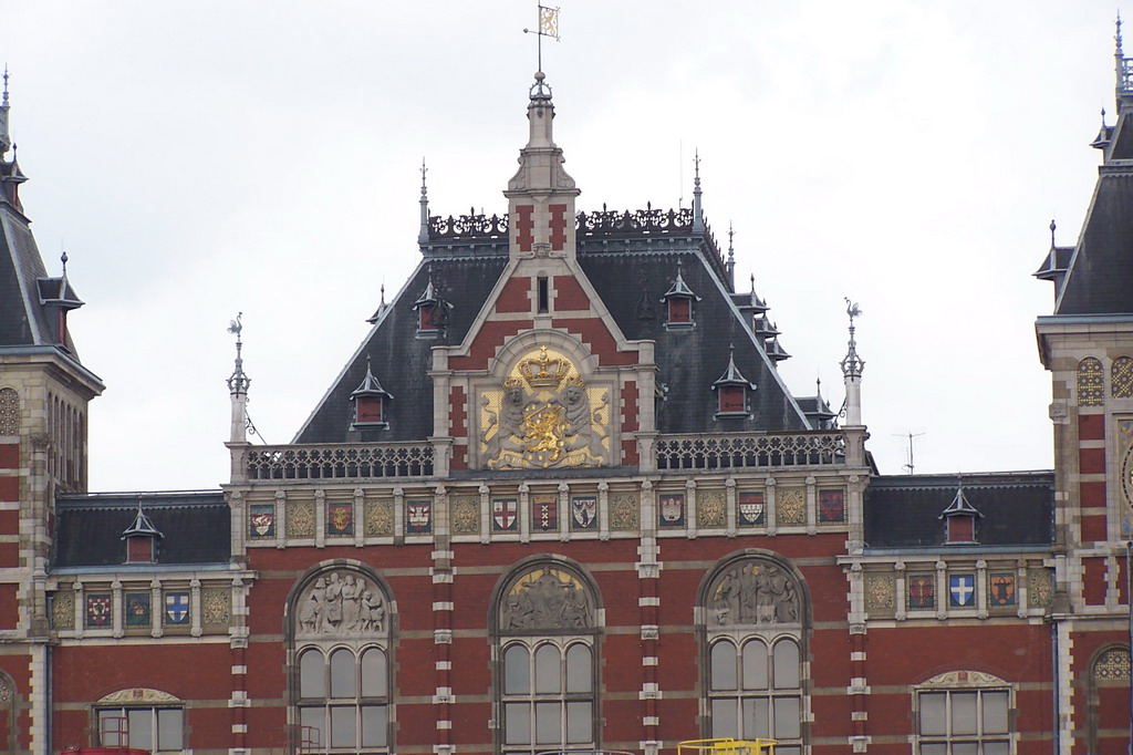 В центре переднего фасада между двумя львами изображен герб Амстердама, под ним гербы Берлина, Санкт-Петербурга, Парижа и других городов, всего 14 гербов. Они символизируют города, в которые можно доехать по железной дороге с этого вокзала.