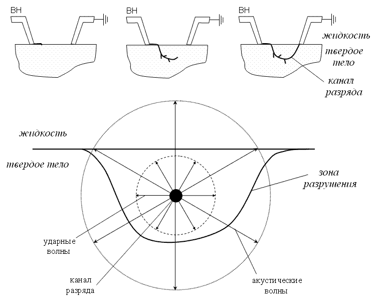 Разрушение твердого тела осуществляется за счет суммарного действия напряжений, создаваемых вокруг канала электрического пробоя вследствие высокого давления, развиваемого в нем, и напряжений, возникающих в среде при распространении ударных и акустических волн. Инструментом, разрушающим твердое тело, является расширяющаяся плазма канала пробоя. Электродная система при этом практически не изнашивается. Таким образом, вместо специальных абразивных материалов для рабочего инструмента можно использовать обычную сталь. Кроме этого к достоинствам способа можно отнести и то, что нагружение твердого тела происходит изнутри, т.е. с преобладанием напряжений разрыва и сдвига, а не сжатия, как в традиционных способах разрушения, а прочность материалов на разрыв и сдвиг существенно (в 10-30 раз) ниже прочности на сжатие; разрушение импульсное, что устраняет значительный расход энергии на пластическую деформацию и позволяет концентрировать большие мощности при невысоких исходных количествах энергии; отсутствуют промежуточные трансформации энергии, связанные со значительными ее потерями; возможно регулирование степени измельчения, устраняющее затраты энергии на излишнее обнажение поверхностей. К недостаткам способа можно отнести то, что для работы с высоким напряжением необходим специально подготовленный персонал, и должны соблюдаться требования по электромагнитной совместимости (например, если работы ведутся в городской черте). Исследования электроразрядного (электроимпульсного) разрушения проводились, в общем-то, уже давно, многие работы в советское время были закрытыми, но промышленная установка, в частности, для резания этим способом так и не была создана. В ранее проведенных исследованиях электроразрядного резания в воде использовались многоэлектродные системы [2,3], которые из-за их низкого сопротивления требуют применения генераторов с импедансом порядка или меньше единиц Ом, при этом происходят большие потери в предпробивной стадии и деформация импульса, и, как следствие всего, необходимы большие напряжения и энергии генератора (они обуславливают его массогабариты).