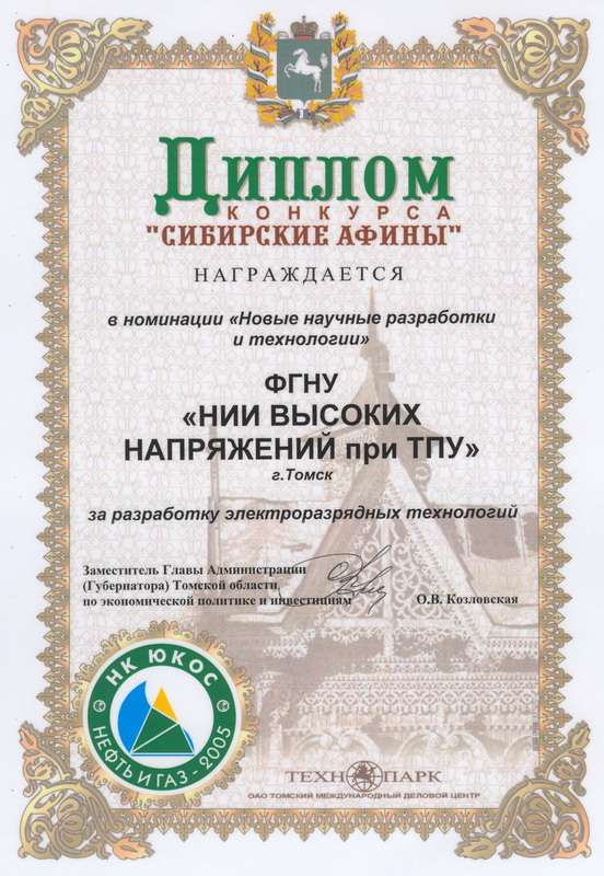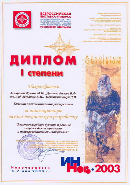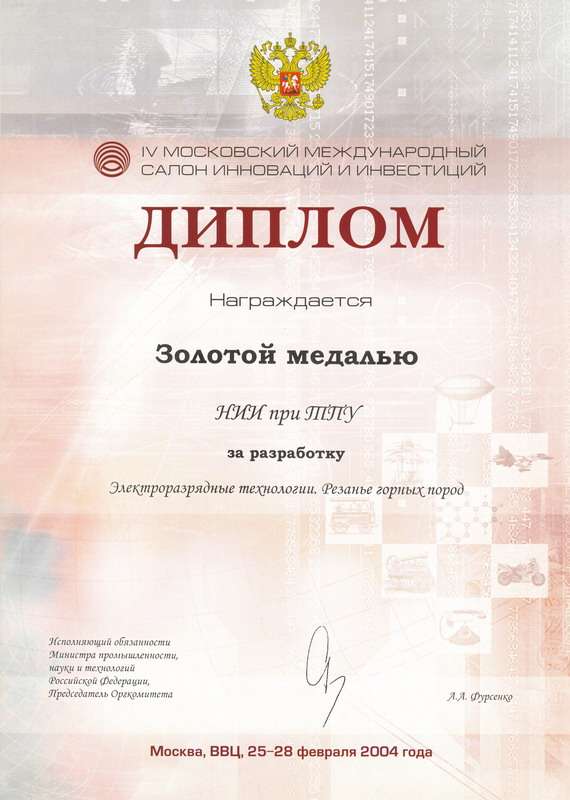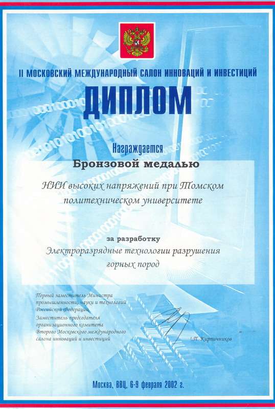 Если Вам необходима какая-либо дополнительная информация по данной тематике или по различным применениям электроразрядного способа (бурение/Electric Pulse Boring/Plasma Channel Drilling, снятие поверхности, очистка трубопроводной арматуры, разрушение негабаритов и т.п.), то Вы можете обратиться к нам в Институт физики высоких технологий Национального исследовательского Томского политехнического университета, лаборатория 11, адрес: 634028, г. Томск, пр. Ленина, 2а, ауд. 122 (высоковольтный зал), телефон: +7 (3822) 60-61-71. ![]() В 2011 году лаборатория принимала участие в Петербургской технической ярмарке с разработкой "Высоковольтная импульсная буровая установка" и получила за нее диплом I степени и золотую медаль. В связи с этим ГТРК "Томск" делала репортаж про инновационную разработку - снимали много и долго (больше часа), а все в итоге уместилось в 2 минуты. В кадрах, что вышли в новостной программе, можно увидеть в т.ч. и меня:)) Видеосюжета на сайте телекомпании почему-то нет, но запись пока можно скачать здесь. В 2013 году телеканал Russia Today снял неплохой ролик про электроимпульсное бурение, а следом и Томская государственная телерадиокомпания сделала репортаж во время приезда иностранных партнеров. Посмотреть можно здесь (смотреть с 6-й минуты, на английском языке) и здесь соответственно.Список использованных источников1. Воробьев А.А., Воробьев Г.А., Чепиков А.Т. Закономерности пробоя твердого диэлектрика на границе раздела с жидким диэлектриком при действии импульса напряжения. Свидетельство на открытие №А-122 от 29.04.1998 с приоритетом от 14.12.1961.2. Семкин Б.В., Усов А.Ф., Курец В.И. Основы электроимпульсного разрушения материалов. - СПб.: Наука, 1995. - 276 с. 3. Goldfarb V., Bundy R., Dunton A., Shneerson G., Krivosheev S., Adamian Yu. Removal of surface layer of concrete by pulse-periodical discharge // Digest of Technical Papers 11th IEEE International Pulsed Power Conference - USA, Baltimore, 1998. - V.2. - Р. 1078-1085. 4. Jgun D., Jurkov M., Lopatin V., Muratov V., Vajov V., Gubsch I., Kunze G., Neubert M. Application of pulsed discharges for materials cutting // Digest of Papers European Pulsed Power Symposium 2002. - French German Research Institute of Saint Louis, France. - P. 22/1-22/4. 5. Важов В.Ф., Журков М.Ю., Муратов В.М. Электроимпульсный способ разрушения горных пород. Патент RU2232271 МПК7 Е21С37/18 / Заявл. 25.02.2003; Опубл. 10.07.2004, Бюл. №19. 6. Важов В.Ф., Журков М.Ю., Муратов В.М. Эффективность резания горных пород электроразрядным способом перемещающейся электродной системой // Известия Томского политехнического университета. - Том 307. - №6, 2004. - С. 72-75. 7. Vazhov V., Zhurkov M., Lopatin V. and Muratov V. Electric-discharge cutting of rocks // Journal of Mining Science. - Springer New York, 2008. - №2. - V.44. - P. 176-182. 8. Адам А.М., Важов В.Ф., Журков М.Ю., Муратов В.М. Устройство для разрушения поверхностного слоя изделий из искусственных материалов и природного камня. Патент RU81258 МПК E21C37/18 / Заявл. 29.10.2008; Опубл. 10.03.2009, Бюл. № 7. 9. Адам А.М., Муратов В.М., Журков М.Ю. Устройство для резания горных пород. Патент RU2393349 МПК E21C37/18, E21B7/15 / Заявл. 1.04.2009; Опубл. 27.06.2010, Бюл. № 18. 10. Адам А.М., Муратов В.М., Журков М.Ю. Устройство для подрезания блоков горных пород электрическими разрядами. Патент RU2427711 МПК E21C37/18 / Заявл. 1.04.2010; Опубл. 27.08.2011, Бюл. № 24. Ссылки на информацию по электроразрядному способуhttp://www.kolasc.net.ru/spark/index.html - Сайт А.Ф. Усова по электроимпульсному способу разрушения.http://www.springerlink.com/content/e54p71v4q3pl3236/ - Vazhov V., Zhurkov M., Lopatin V. and Muratov V. Electric-discharge cutting of rocks // Journal of Mining Science. - Springer New York, 2008. - V.44. - №2. - P.176-182 http://www.springerlink.com/content/t180p1337236n735/ - Vazhov V., Gafarov R., Datskevich S., Zhurkov M. and Muratov V. Electric-pulse breakdown and the breakage of granite // Technical Physics. - Springer New York, 2010. - V.55. - №6, - P.833-