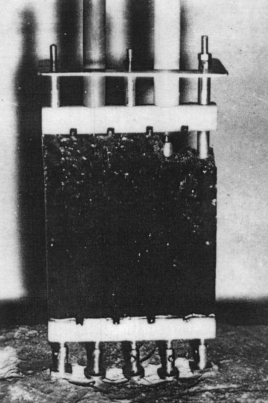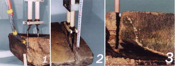 - экологически безопасный и практически безотходный процесс разрушения; - малый износ и очень низкая стоимость режущего инструмента; - любая заданная траектория резания. ![]() Достигнутая глубина резания электроразрядным способом составляет 200-300 мм (хотя в принципе без каких-либо затруднений она может быть увеличена до метра и более), длина резания - до нескольких метров. Ширина реза от 15 мм. Поверхность после обработки неровная, т.е. требует дальнейшей обработки, в случае, если надо получить гладкую поверхность. Однако она "ослаблена" разрядами, поэтому после электроразрядной обработки ее обрабатывать традиционными механическими способами значительно легче. В 2004-2005 гг. в Германии по гранту Deutsche Bundesstiftung Umwelt и при содействии государственного фонда Herbert-Quandt-Stiftung нами совместно с немецкими коллегами в высоковольтном зале Института высоковольной техники Дрезденского технического университета смонтирован и запущен электроразрядный стенд с целью апробации электроразрядного способа (Elektro Impuls Verfahren) применительно к резанию саксонского песчаника и других очень крепких горных пород. Деньги на исследования выделил фонд окружающей среды - дело в том, что в Германии особое внимание обращают на экологичность технологии: в данном случае способа (при электроразрядном способе отходов и пыли практически нет) и использующихся строительных материалов, в частности, плитки для мощения дорог. Асфальт является неэкологичным материалом, поэтому в немецких городах очень много дорог, в т.ч. и для машин, вымощено природным камнем. Кроме того саксонский песчаник в Германии издавна используется для строительства зданий, из него сделаны все барочные шедевры Дрездена. Сам электроразрядный способ в силу вышеописанных преимуществ весьма перспективен для получения различного вида дорожных плит и обработки крупных массивов горных пород, поэтому кроме проведения натурных экспериментов на немецком камне, стенд был создан и для демонстрации способа различным немецким камнеобрабатывающим компаниям с целью привлечения инвестиций на создание первого технологичного электроразрядного резака.К сожалению, в России пока не нашлось инвесторов, готовых финансировать НиОКР по созданию электроразрядного резака, хотя разработка демонстрировалась на различных выставках и салонах, и была удостоена различных дипломов и медалей, одна из них - золотая на IV Международном салоне инноваций и инвестиций в 2004 г. в Москве.