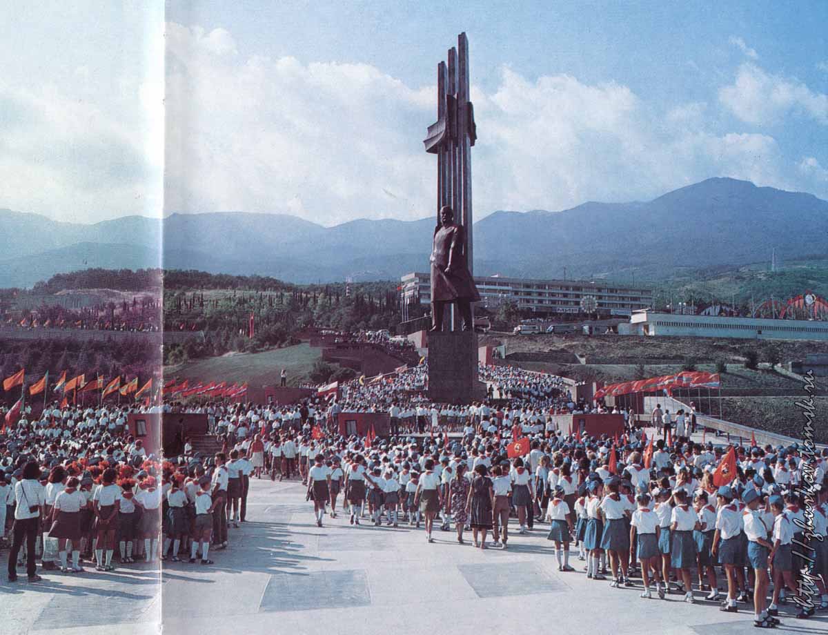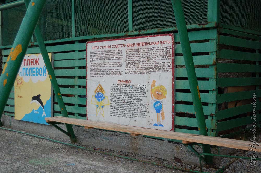 Вертолет приземлялся прямо на площадку перед статуей Ильича. Позже еще и салют устраивали. Вот так вот, а я уж подумал, что какие-то детские соревнования проводятся, потому и пусто в Артеке, т.к. все отдыхающие дети на стадионе собрались, а здесь вот оно как... Пожалуй, самое большое впечатление на меня произвел тогда, весной 90-го открытый бассейн, наполненный очищенной и подогретой морской водой, куда нас водили несколько раз. Он находится недалеко от стадиона. Точнее - находился, т.к. в настоящее время он не функционирует, и что когда-то в нем купались дети, тут уже мало что говорит. Вроде бы есть второй открытый бассейн, но мы ходили именно в этот.Надо сказать, что, несмотря на обилие коммунистической символики и памятников в Артеке, фотографии которых приведены и здесь, нас не пичкали советской пропагандой, что как бы подразумевалось в пионерлагере №1 "Страны рабочих и крестьян". В Артеке, вообще, очень осторожно относились ко всему, что связано было с идеологией, хотя, может быть, это было только в последнее десятилетие существования СССР - их еще называют "золотые годы" Артека, не знаю. Некоторые говорят, что Артек был самый несоветский лагерь из всех пионерлагерей в Советском Союзе. Очень похоже на правду. После него все томские пионерлагеря стали невыносимо скучными и убогими, в них просто было нечего делать, кроме как кормить комаров.
