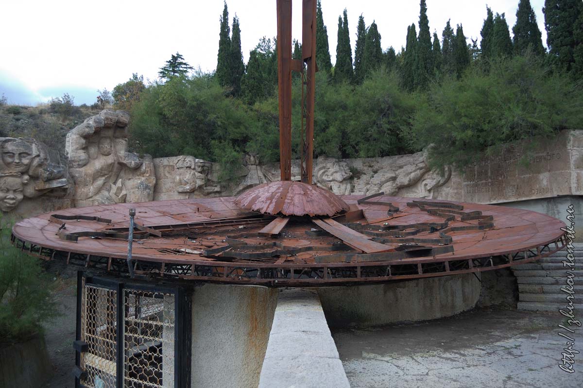 Рядом с панно расположена "Комната Мира", крыша которой представляет собой чашу, олицетворяющую Землю, в ее центре солнце, лучами озаряющее континенты, на поверхности солнца расположены корпуса Артека.Предо мной монумент предстал в весьма неприглядном виде, все проржавело, куски композиции отвалились. Само по себе символично то, что "Комната Мира" зарешечена, а ее стеклянные стены разбиты. Данный памятник расположен в сердце Артека - лагере "Морской", который есть на всех открытках, и который обычно всем и демонстрировали. Море очень близко - небольшие корпуса расположены прямо на набережной. В мой приезд весной 1990 года этот лагерь был пустой, он работал только в летнее время. Но помню, что хотелось побывать в этом лагере, поскольку рядом море и корпуса выглядели более привлекательно:)