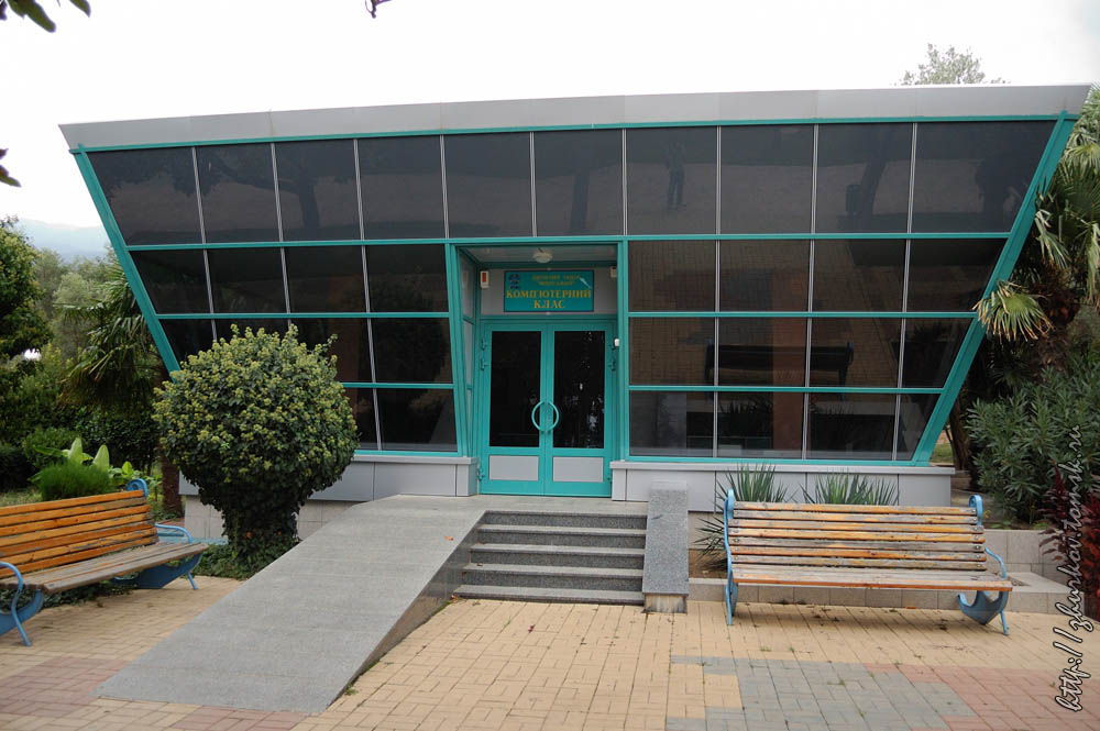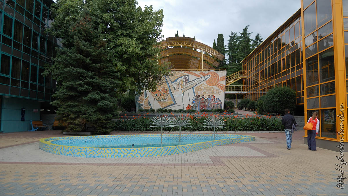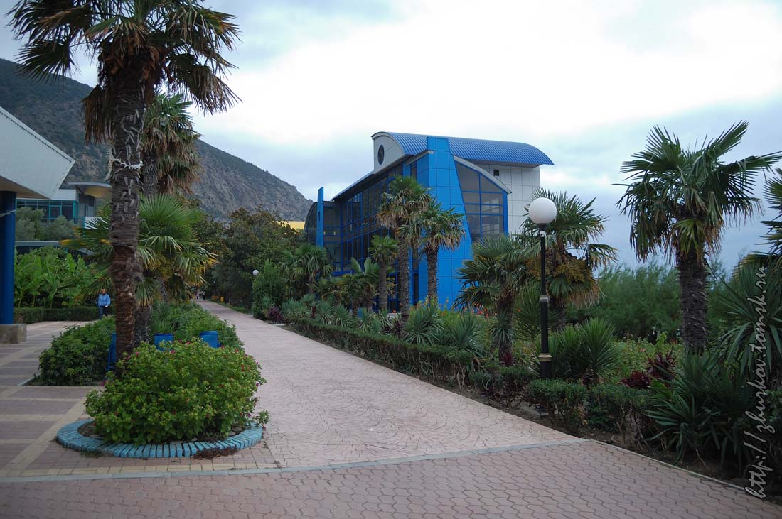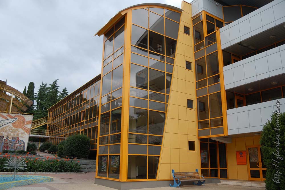 За панно находился обязательный атрибут советского пионерлагеря - "Ленинская комната", теперь там еще приделали навес над площадкой, что расположена на плоской кровле этой комнаты. А комната уже не "Ленинская", а "Дружбы".Слева от "Площади Дружбы" расположен корпус "Изумрудный", справа - "Оранжевый", на лестнице которого мы также тогда фотографировались. Сейчас все заделано сайдингом цветов, соответствующих названиям корпусов. Выглядит ухоженно, но открытости и свободы не чувствуется.Посмотрев "Морской", я пошел по дорожкам вверх, туда, где должны располагаться корпуса лагеря "Горный", в котором, собственно, и был я. Сейчас это не лагерь, а "комплекс лагерей", поскольку лагерями стали именовать то, что раньше называлось "дружинами". Вскоре увидел знакомые квадратные здания закрытого бассейна, спортзала и столовой с расположенной в центре между ними "ракушкой" - это площадь "Рукопожатий" лагеря "Горный". В спортзале, помню, показывали кино "До первой крови" (сценарий Г. Остер, режиссер В. Фокин, 1989 г.) про то, до чего может довести военно-патриотическая игра "Зарница". По приезде в Артек вожатыми был проведен опрос, кто во что хочет поиграть, большинство написали, что хотят поиграть в "Зарницу", - ведь это была самая распространенная игра в советских пионерлагерях.