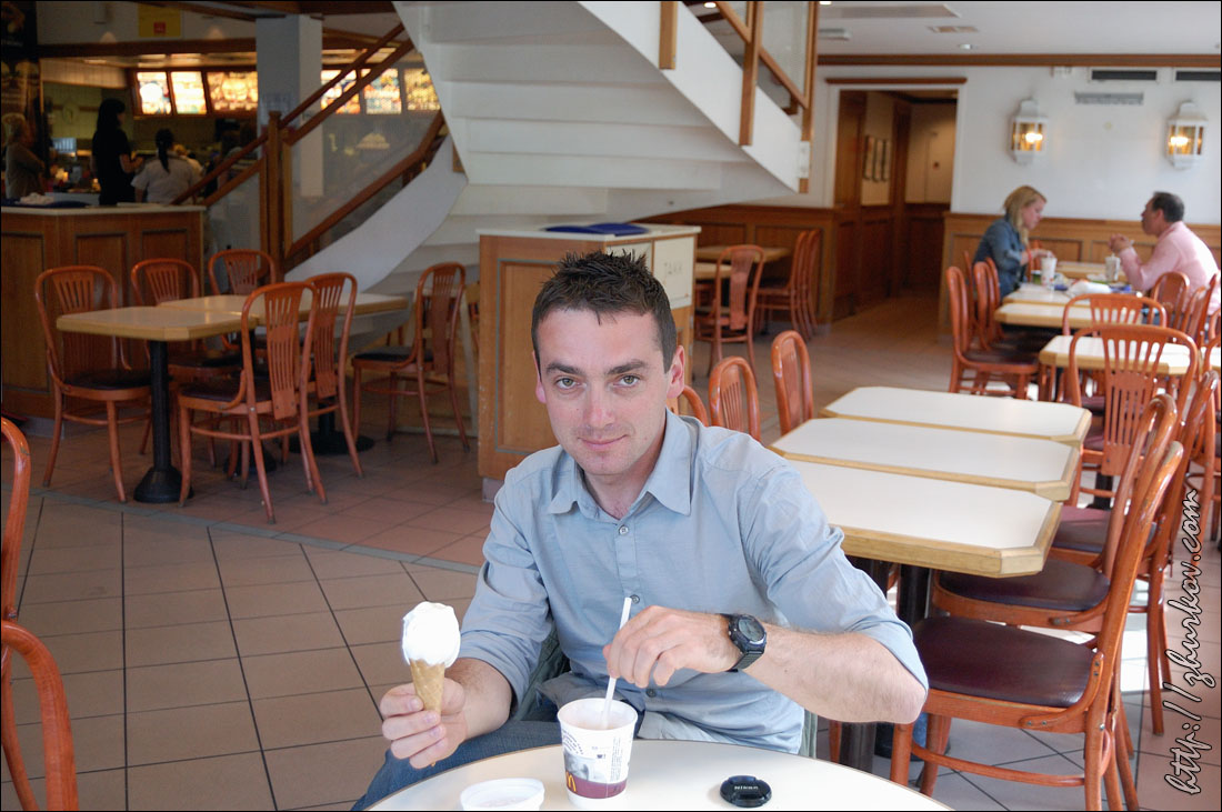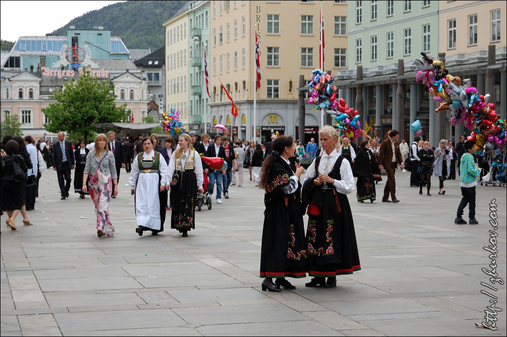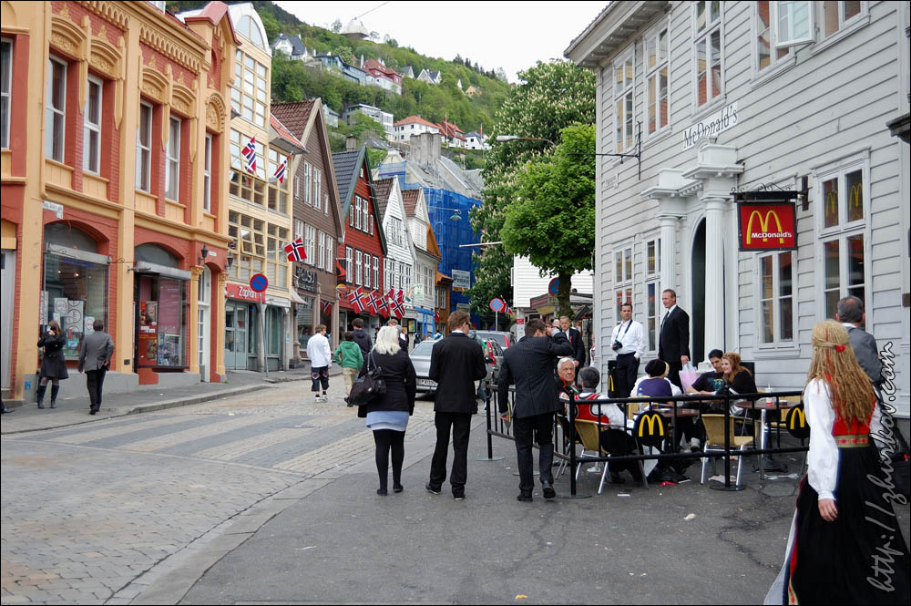 Т.к. гора относительно невысокая, то спускаться лучше всего пешком, многочисленные дороги выведут прямо к центру города.Центральная площадь Бергена Torgallmenningen - на ней и прилегающих улицах расположены бутики и несколько больших магазинов-универмагов, но выбор там довольно-таки скудный, по сравнению с теми же Франкфуртом/Дрезденом или даже Дармштадтом, где мне приходилось подолгу бывать. В магазинах Бергена везде, в общем, одно и то же. Цены же выше раза в полтора-два, чем в Германии, короче, Норвегия - явно не лучшее место для шоппинга. К тому же, т.к. Норвегия не входит в зону Евро, то там в ходу норвежские кроны, потому теряешь еще и на обмене валюты. Также, как и в Германии, за приобретенные в Норвегии товары можно получить возврат НДС, чуть подробнее написал про это здесь. В Бергене и окрестностях есть несколько МакДональдсов, - и тут стоит отметить, что настолько плохого обслуживания для МакДональдса я еще не встречал - везде обслуживают ну очень медленно, а иногда в заведении может быть и не совсем чисто. Причем, как оказалось, не только в Бергене такая ситуация, в Ставангере столкнулись с тем же самым. Здесь фото из одного ресторана, расположенного рядом с местечком Лагунен, где мы часто бывали, т.к. там находится большой торговый центр (Lagunen Storsenter, второй по величине в Норвегии). Сделана фотка после стрижки в одной из парикмахерских недалеко от ж/д вокзала Бергена, там стригли недорого (по норвежским меркам) какие-то курды, их попросили как-нибудь покороче подстричь, они и подстригли, как могли:) 17 мая - главный национальный праздник Норвегии - День Конституции, это же День независимости. Это, конечно, нерабочий день, празднуют его с размахом, все украшается норвежскими флагами, у каждого дома поднимается на флагшток большой национальный флаг (см. фото) вместо обычно находящихся там вымпелов (Norsk vimpel), проходят парады, люди наряжаются в национальные костюмы.