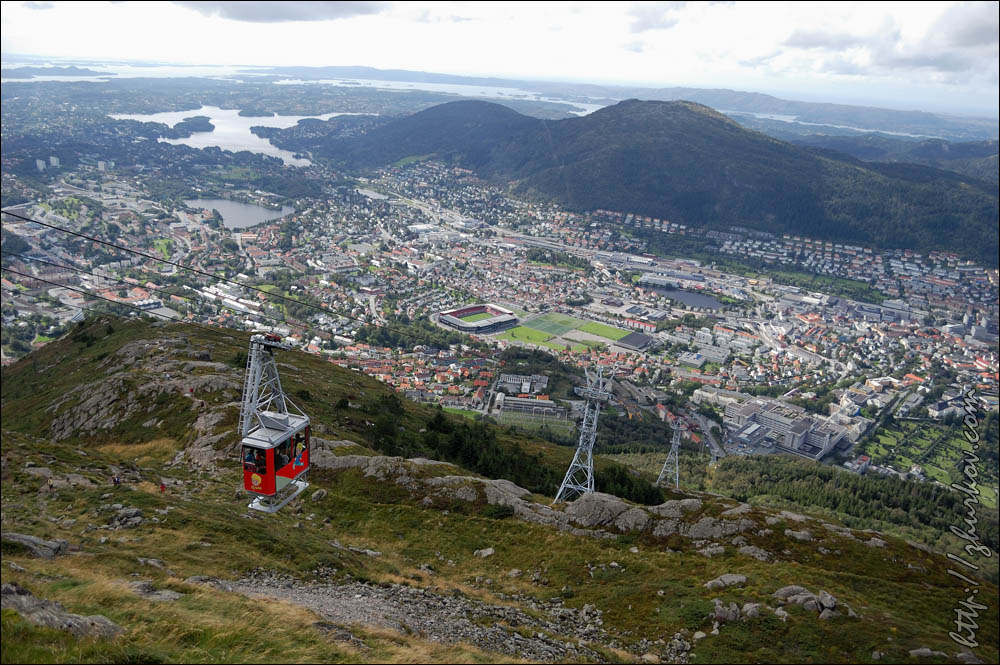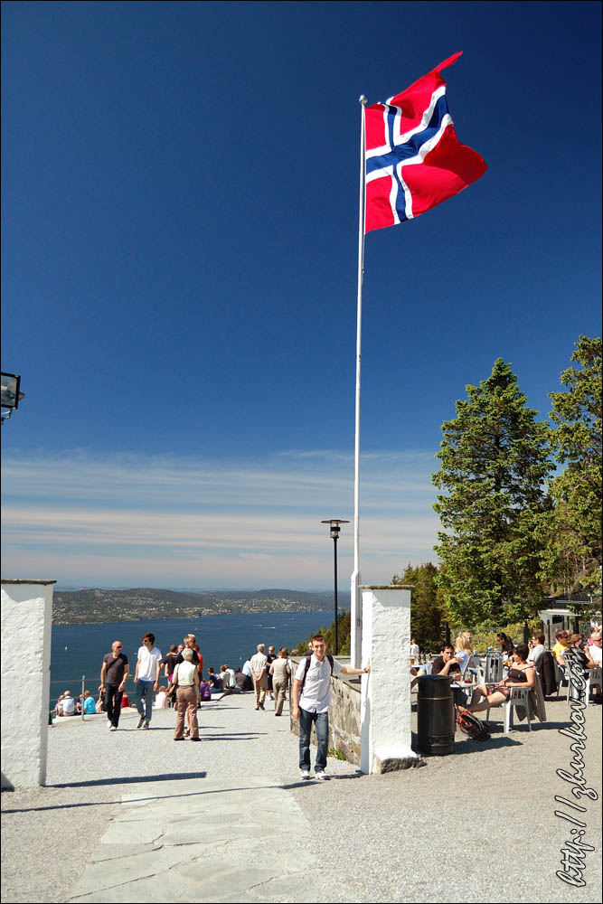 Подъем стоил 80 крон, оплатить можно было только банковскими картами, т.к. кассы не было. На вершине расположена телебашня, а также кафе. Конечно же, установлен норвежский флаг, и вид оттуда на Берген открывается потрясающий, и не только на Берген - для этого стоит отойти от кафе и пройтись по тропинкам. В горах бегают зайцы, и растет много брусники и голубики, много ручьев. С горы можно спуститься пешком, хотя этот путь будет не настолько простым, как, например, спуск с другой горы - Флейен. Флёйен (норв. Fløyen) - очень известная у туристов гора, до нее можно подняться на фуникулере Fløibanen, который расположен в непосредственной близости от набережной. С Флейен лучше всего обозревать центр Бергена, т.к. возвышается она как раз над ним. Там есть большая обзорная площадка, кафешки, естественно, в наличии большой норвежский флаг.