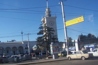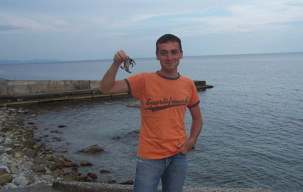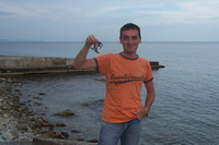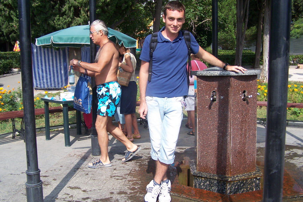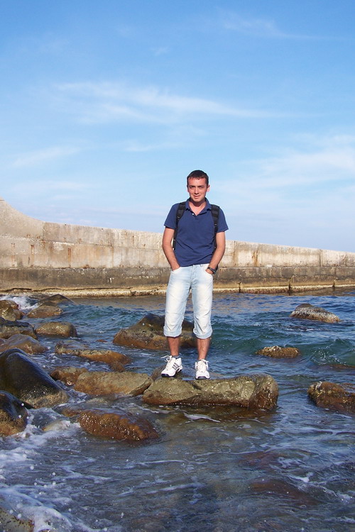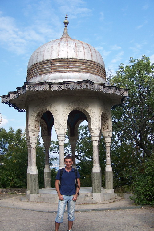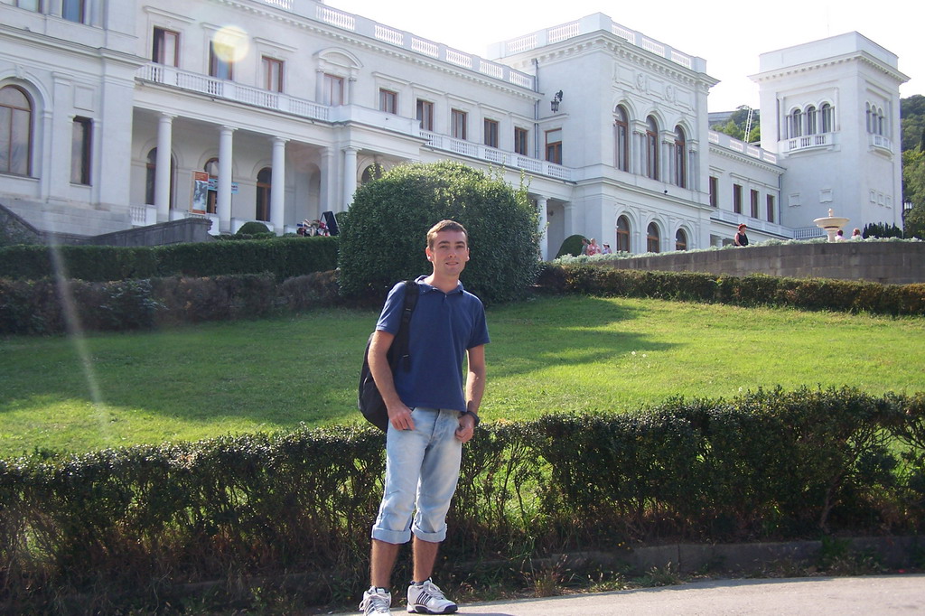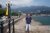 Он известен прежде всего тем, что здесь 4-11 февраля 1945 года прошла Крымская (Ялтинская) конференция глав правительств трех союзных держав во 2-й мировой войне: Сталина (СССР), Рузвельта (США) и Черчилля (Великобритания). Участники Крымской конференции заявили о своей цели - уничтожить германский милитаризм и нацизм, были приняты решения о создании в Германии зон оккупации 3х держав (а также Франции, в случае ее согласия) и общегерманского контрольного органа союзных держав, о взыскании с Германии репараций, о создании ООН и др. Ранее дворец был летней резиденцией последнего русского императора Николая II. Ливадийский дворец сооружен в 1910-11 гг. по проекту русского архитектора Краснова в подражание стилю итальянского возрождения из белого инкерманского камня, добываемого под Севастополем. Расположен он в живописном парке на склоне горы Могаби, этот парк площадью 40 га - один из лучших на южном побережье Крыма. По дороге в Ливадию в Приморском парке расположен бювет питьевой минеральной воды из которого я, конечно же, утолил жажду:) Открыт он был в 2004 году, по химическому составу вода из него схожа с "Ессентуками". Уже на обратном пути к троллейбусному вокзалу и кассам, идя по ялтинской набережной - народу там много, мне вдруг подумалось: "вот, сейчас кто-то из Томска наверняка же тут есть..." Поднимаю глаза и вижу - идет корреспондент телекомпании ТВ2 О. Юдин, ну и ну - правильно говорят, что земля круглая:) Там же попробовал ялтинский квас, он мне не понравился - очень кислый был. Хорошо, что пошел на троллейбусную остановку пораньше, ибо народу было много и билеты расходились влет, а по дороге в Алушту троллейбус проезжал мимо большинства остановок. Когда приехали через час в Алушту, там было уже темно - вообще, темнеет в Крыму рано и быстро. В оставшееся время я не смог справиться с ленью и поэтому никуда больше не поехал, а остался загорать на пляже. С каждым днем по набережной Алушты все отчетливей было заметно, что сезон заканчивается - людей, гуляющих тут, становилось все меньше и меньше, часть палаток свернули торговлю. Пляжи пансионатов были почти пустые, а свет в их корпусах по вечерам горел лишь в единичных окнах. Но было солнечно и тепло, поэтому загорел я в целом очень хорошо, и, вообще, хотя прошло всего-то 9 дней, отдых меня удовлетворил полностью - я чувствовал себя отдохнувшим на все 100%:) Давно не было такого ощущения. На прощание, немного поорудовав камешками, оставил надпись на одном из пляжей, аналогичную оставленной в прошлый раз, мол, и мы тут были:) В последний день перед отъездом ловили крабов, которые в избытке водились в расщелинах бун и камнях около берега. Одного-таки удалось поймать:)Утром следующего дня сходил в Массандровский магазин и закупил различных крымских вин, чтобы угощать знакомых в Томске, по прошлому опыту знал, что все будут в восторге от этого вина. Домой добрался без каких-либо опозданий и задержек, только в Домодедово меня и мой багаж оформили как совершенно другого человека, я прошел все проверки и уже перед посадкой посмотрел на свой посадочный талон, где стояла фамилия Журавлев:)В копилку самолетов, на которых я летал, в этот раз добавились Аэробус А319-100 и Боинг B737-500. Томск меня встретил по-настоящему осенней прохладой, градусник на ж/д вокзале показывал -3 градуса, в то время как в Крыму, когда улетал, было +26. Сам г