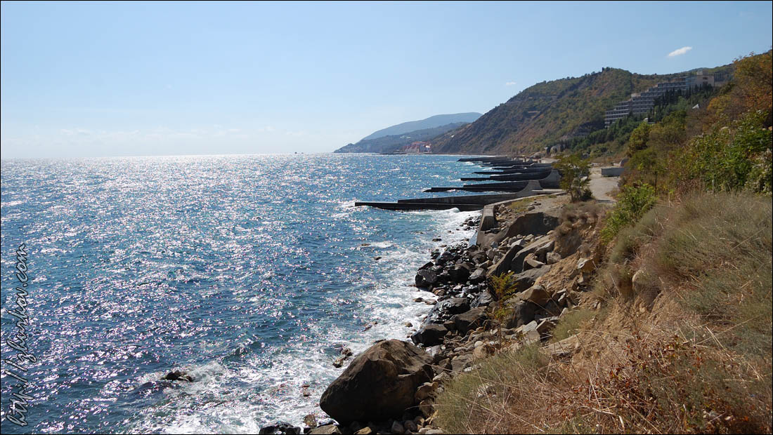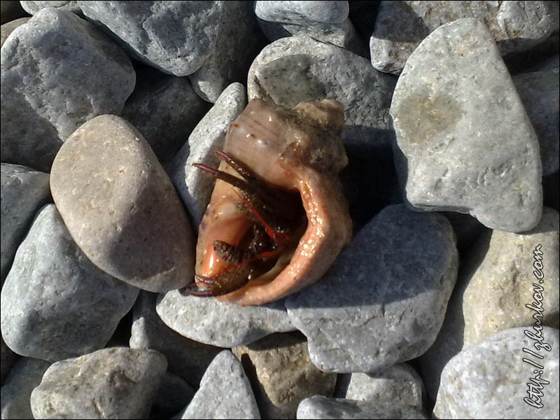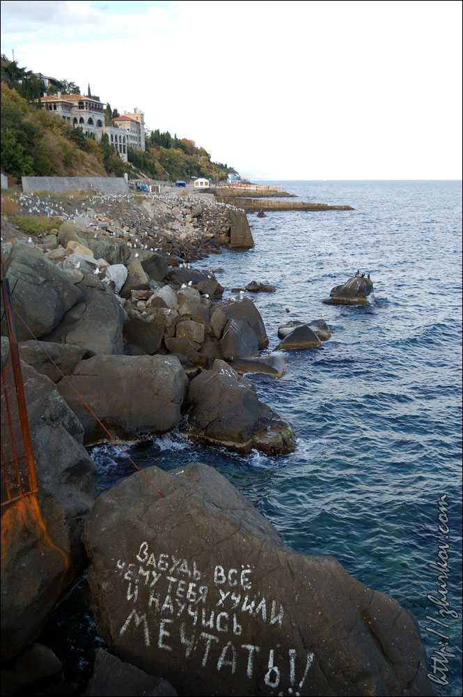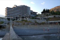 Якобы она "снимала в море мужа", а я тут "фак ю" показываю (мне, как человеку, много фотающему, такую лапшу на уши навесить трудно, ведь из такой дали увидеть мое "приветствие" на буне при ненаправленной в упор на меня камере просто физически невозможно), мол, это частная территория и она "платит междупрочим по 5 тыс. гривен за каждую из бун...(многозначительно) в бюджет!"... Что ж, остается констатировать, что увы, и это некогда девственное место у недостроенного пансионата, обнаруженное мной случайно в далеком 2003 году, "опопсело", и к нему стали прикладывать свои ручонки такие вот горе-предприниматели, каким-то непонятным образом прихватизировавшие огромную площадь в охраняемой зоне, оградив все это железным забором, перекрыв дорогу, взимая плату за доступ к тому, что еще было построено не ими в советские времена, а что они там себе построили, так это "всего лишь" такой вот милый особнячок. На протяжении последних лет я наблюдал, как на пляжах в Лазурном сначала появился деревянный забор (увидел в 2006 г.), ограждавший только склоны, а с 2008 г. и по настоящее время металлический забор уже преграждает и доступ к морю и есть вероятность, что вам предъявят претензии некие смотрители, необремененные интеллектом, но зато с большим гонорком:) Ладно бы от них польза была, а то все кусты, пардон, засраны, пляжей уже не видно, а на один из них, самый протяженный от большого видимо ума навалили гору кубовидного щебня, который используют при строительстве дорог, пляжи же вообще-то отсыпают гравием. А они (пляжи) мне там нравились, круглые камешки, кристально прозрачная вода, редкие отдыхающие, которые сумели дойти сюда по Набережной из Алушты или остановились тут в палатках, отсутствие омерзительных пляжных торговцев, единение с природой, тишина и спокойствие. Несмотря ни на что в этом году вдоволь там позагорал, поплавал в ластах и маске и однажды достал со дна такую вот ракушку с раком-отшельником:) "Голубовские камни", кстати, тоже уже "не смотрятся", если на них я фотался в 2003-м, то сейчас это уже вряд ли возможно - рядом с ними вырос другой забор, по ту сторону которого строят какую-то не то виллу, не то частный пансионат, что осталось, как там написано, действительно, только мечтать:) Да, очевидно, у Алушты нет хозяина, который бы пресек весь этот балаган, ведь в первую очередь страдают сами жители Алушты - ну какой же курорт без доступного пляжа?! Не говорю уже про набережную, хоть и большую, но с которой моря не видно, а говорят еще и фекалии в море в городской черте... оттого, похоже, отдыхающие и не задерживаются в Алуште долго (по статистике среднее время пребывания 9 дней), а из отдыхающих в основном непритязательные украинцы (около 82%), россиян очень мало (менее 14%), оно и понятно, с такими-то нравами и отношением к приезжающим. К недостаткам Алушты можно также отнести отсутствие Интернета, точнее, его наличие только в одном-двух местах на целый город - в Укртелекоме на Набережной и 3 компьютера этой же организации в отделении недалеко от автовокзала по цене 9 гр/час, говорят, в Рабочем уголке тоже было, но в сентябре уже все закрылось.
