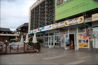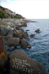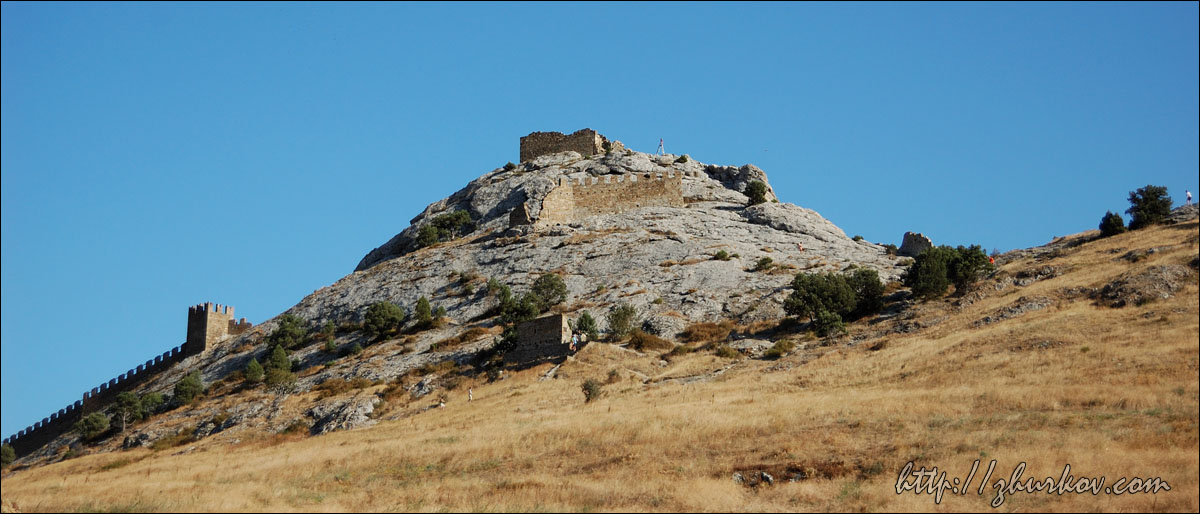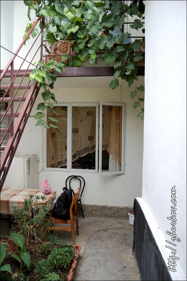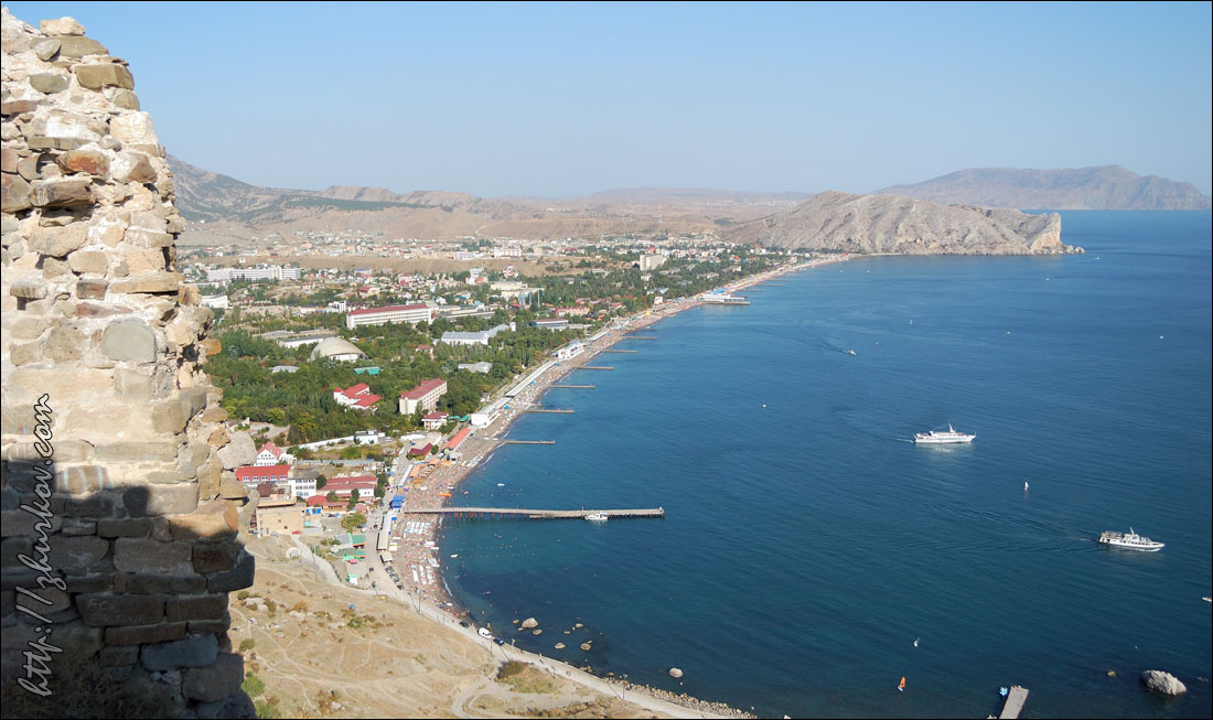 Рядом расположено дерево, все увязанное цветными ленточками, типа "загадай желание и повяжи", ленточки продают в киоске прямо рядом с деревом за 2 гривны.На самой вершине горы расположен комплекс Дозорной башни крепости, и вход туда закрыт. Однако, конечно же, любители залезть на вершину находятся, хотя это небезопасно и для этого надо немного постараться, ибо гора очень скользкая. Мы, естественно, залезли, ибо иначе быть и не могло. С крепости открывается хороший вид на Судак и его окрестности.По дороге к крепости на одном из домов увидели такую вот табличку, вообще, что касается всяких рекламных и не очень надписей в Крыму, то их уже накопилось на отдельную страницу:) Сам Судак мне показался довольно небольшим, при этом с дорогами что-то там оказалось совсем туго, и т.к. у моего чемодана клиренс маленький, то пока ездил от автовокзала до жилья и обратно он весь поободрался. Также цены в заведениях общественного питания довольно высокие, столовых как таковых фактически нет, фрукты тоже оказались дороже, чем в Алуште. Зато в Судаке хорошо с Интернетом, хоть и не дешево, зато на каждом углу. На следующий день предстоял переезд в Алушту, все же она гораздо более доступна с точки зрения транспорта, потому для путешествий останавливаться там удобнее.При подборе жилья столкнулись с хамством некоторых алуштинцев, я и раньше здесь натыкался на то, как морщат нос сдающие жилье частники и часто любят выбирать постояльца, как будто они делают какое-то одолжение, даже сдавая иной раз халупы-сараи. В Судаке я с этим, к слову, не встретился, хотя долго жилье и не пришлось искать, и более того, хозяйка на прощание даже угостила свежесваренным кофе, что было неожиданно и приятно, несмотря на то, что я у нее остановился всего на пару ночевок. В Алуште же что-то цены на жилье были выше, и многое занято, несмотря на вторую половину сентября и начавшийся отток отдыхающих. Сначала разместился недалеко от автовокзала в номере типа "люкс" в доме на ул. Первомайской, 8, но там по утрам лаяла хозяйская собака, потому я в этом месте оставаться не стал и снял за ту же цену ($15/сутки) двухкомнатную квартиру в пятиэтажке на ул. Виноградной, 20, заодно посмотрел, как живут местные. В домах горячая вода получается при помощи газовых колонок, почти у всех лоджии застеклены и объединены с комнатами, слышимость поразительная, а в подъезде свет отсутствовал перманентно, т.к. "что-то не так было подключено к учету, потому общее освещение отключили". Также в этот приезд мной было замечено, что в Крыму массово ставят китайские "железные" двери, которые у нас наоборот побыстрее меняют на нормальные, при этом во многих квартирах входные двери вообще деревянные. Раньше как-то не приходилось, а нынче впервые побывал на городском пляже Алушты в дневное время - это просто пипец. Даже в сентябре мы там не нашли ни одного свободного места, чтобы позагорать, не понимаю, как там отдыхают в пик сезона, хотя даже если бы было немного свободнее, отдыхом я бы это не назвал. На такой сравнительно большой город фактически бесплатные пляжи отсутствуют (трудно назвать 2 полоски побережья длиной в несколько десятков метров в центре рядом с ротондой и в Рабочем уголке городскими пляжами), отнести это можно только не иначе как на полный идиотизм местных властей. При этом на окраинах - на восточной набережной и в 