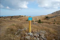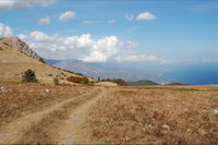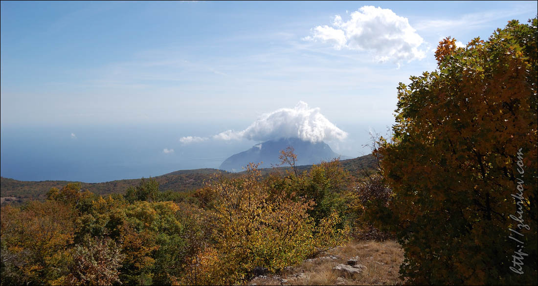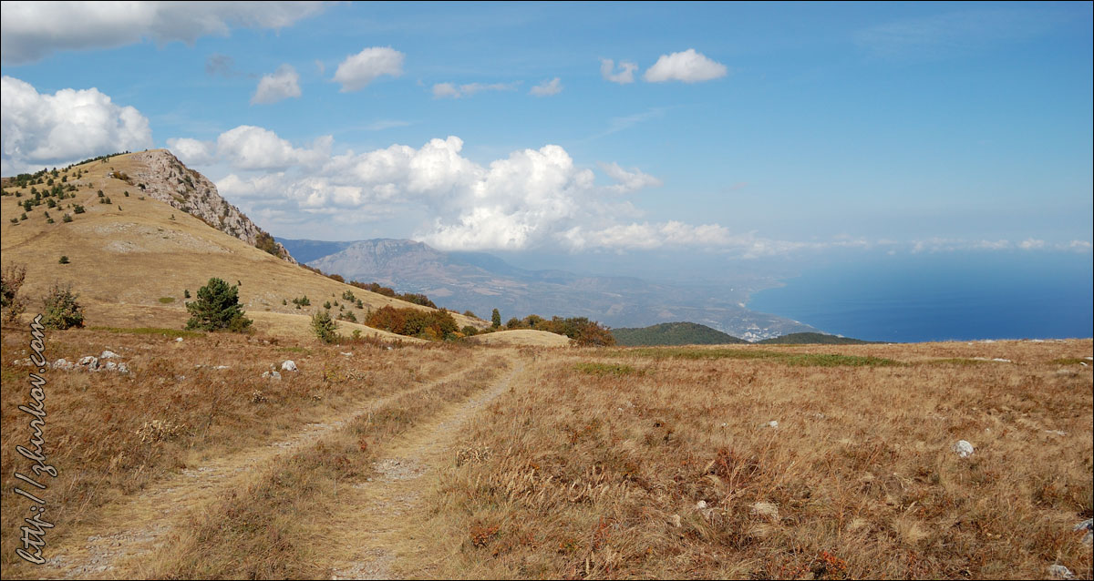 Пробовал выйти в сеть из инет-кафе, которое еле нашел на ул. Ленина, да что-то там половина сайтов не грузилась, в общем, инет вполне соответствует всему остальному антуражу Алушты - не для "продвинутых" людей. Зато с погодой в этом году повезло, ни разу раньше в сентябре не получалось так, чтобы каждый день светило солнце, обязательно пара дней как минимум были облачные. А тут получилось, что и на улице солнечно и тепло, и море теплое. Объелся крымских персиков и вкусных помидор сорта "сливка", а также винограда и других южных полезных продуктов:) Все это запивалось массандровскими винами, соками и изгнанной из РФ минералкой Боржоми, которая стоит на прилавках вместе с грузинскими винами без каких-либо нареканий:) В предпоследний день пребывания, как и хотел, совершил довольно продолжительный поход в горы. Забрался на горный массив Бабуган-Яйла и находящуюся там "вершину Крыма" - самую высокую на полуострове гору Роман-Кош (1545 м). Пускай, быть может, Роман-КошНа Эверест и не похож, Но это наша первая вершина…(с) На самом деле это уже вторая вершина в Крыму, на которой я побывал, первой был Аю-Даг во времена Артека, т.е. 20 лет назад. Из мелких были также скала Дива в Симеизе в 2008-м и гора Кыз-Кулле-Бурун (Крепостная) в Судаке в этом году. Восхождение начали от троллейбусной остановки между Виноградным и Малым Маяком, где-то в 11:30, поначалу приходилось почти все время идти круто вверх, светило солнце, потому было жарковато, постоянно липли какие-то непонятные пауки-мухи.До горы Парагильмен, пользующейся интересом у альпинистов, дошли примерно часа через 2, затем еще час-полтора подъема до относительно ровной дороги, судя по показаниям навигатора, ведущей по Бабуган-Яйле в сторону к Роман-Кош, но куда конкретно непонятно.