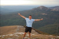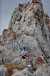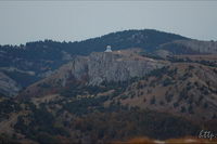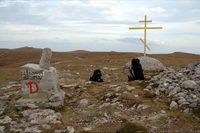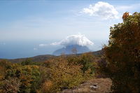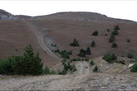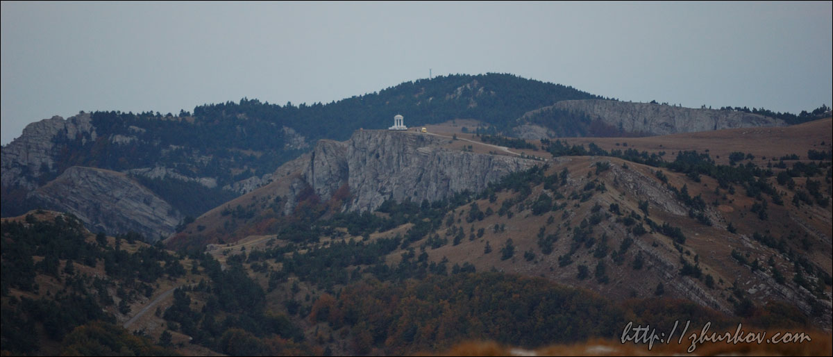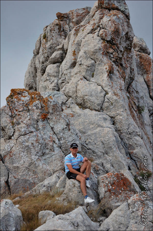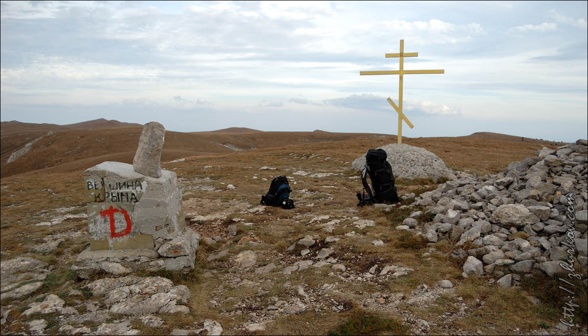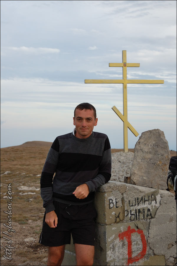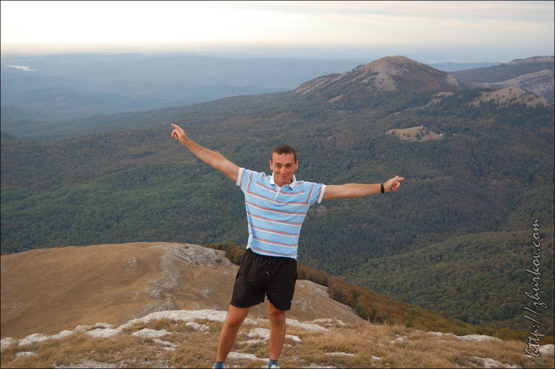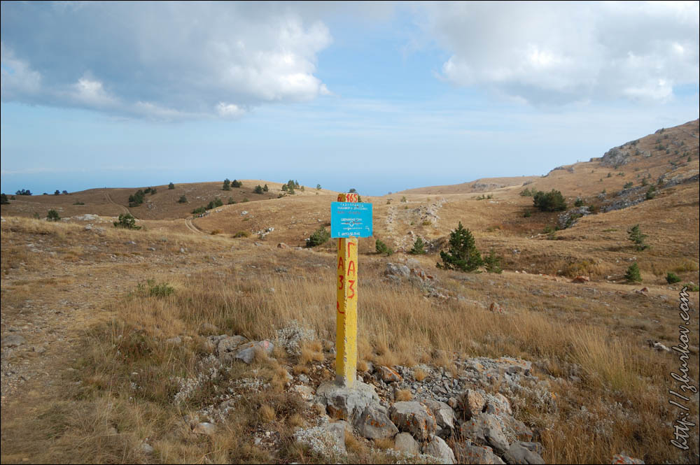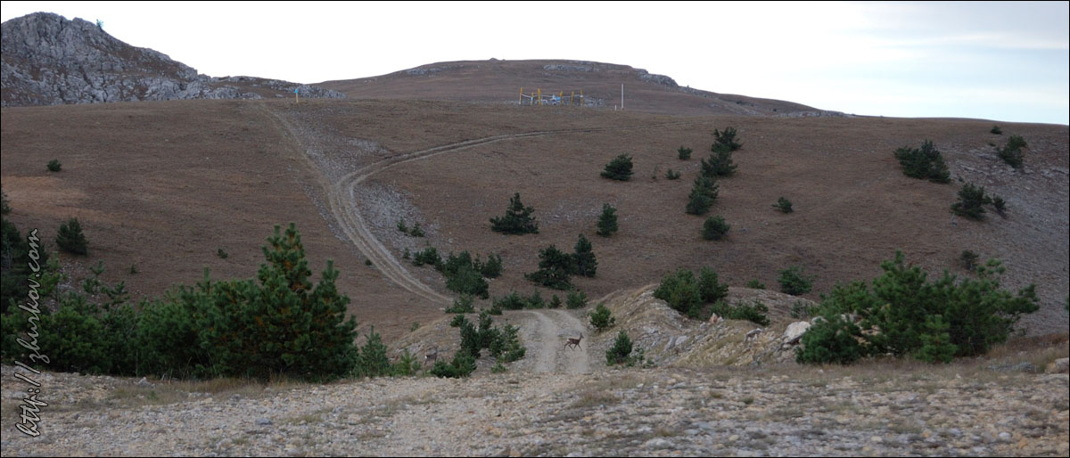 Рядом с дорогой под землей проходил газопровод Ялта-Алушта, удивительно, кому пришло в голову его прокладывать в таких условиях, т.е. в горах, наверное, стоило это недешево. Т.к. почти вся территория Яйлы является Крымским природным заповедником, вход в который официально запрещен, то были опасения, что могут не пустить, но все как-то обошлось, - видимо, не сезон. Разок даже увидели свободно бегающих косуль. Растительность в горах весьма скудная, типичная для гор, здесь уже вовсю чувствовалась осень. В горах было облачно, прохладно и дул ветер, потому немного замерз, несмотря на то, что брал легкую кофту. На Роман-Коше оказались в 17 часов, минут на 10 раньше туда дошли двое украинцев - отец с сыном с рюкзаками, из Донецка, которые с утра поднимались со стороны Гурзуфа и думали, что будут единственными, поскольку, действительно, в этот день вокруг не было ни души, их радостные крики после подъема были услышаны только мной на подступах к вершине:)