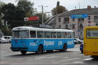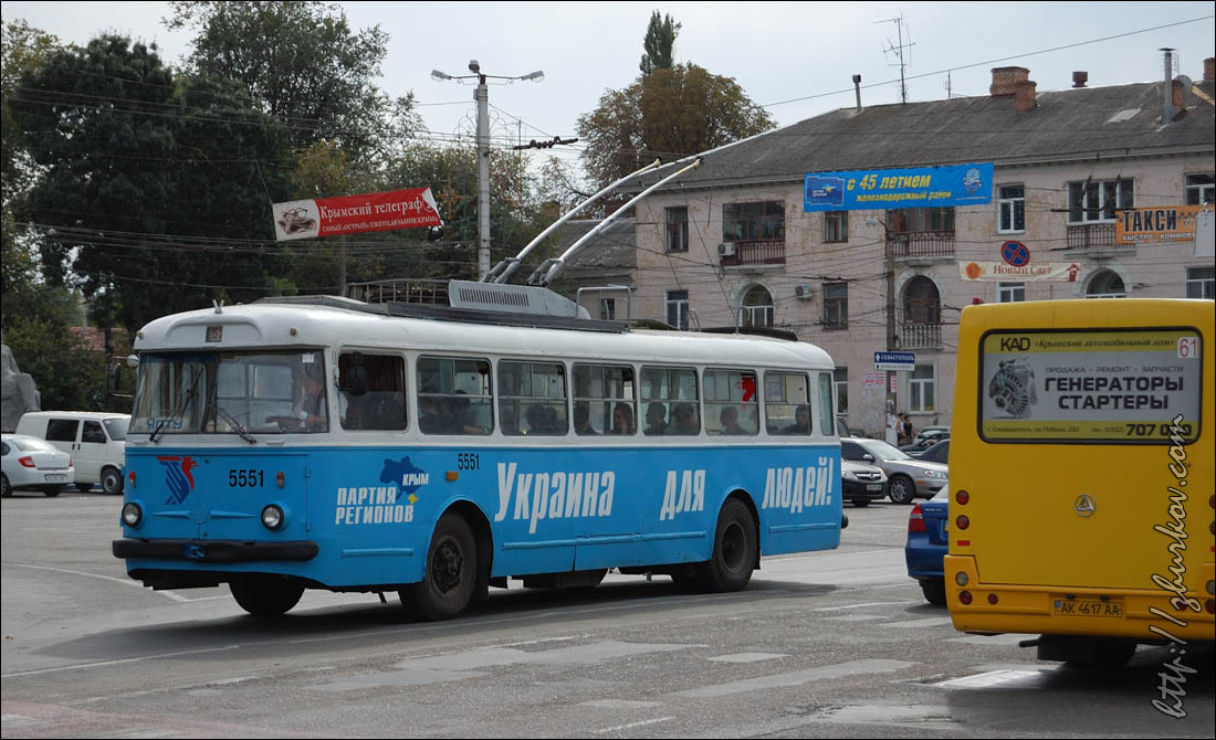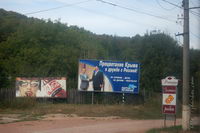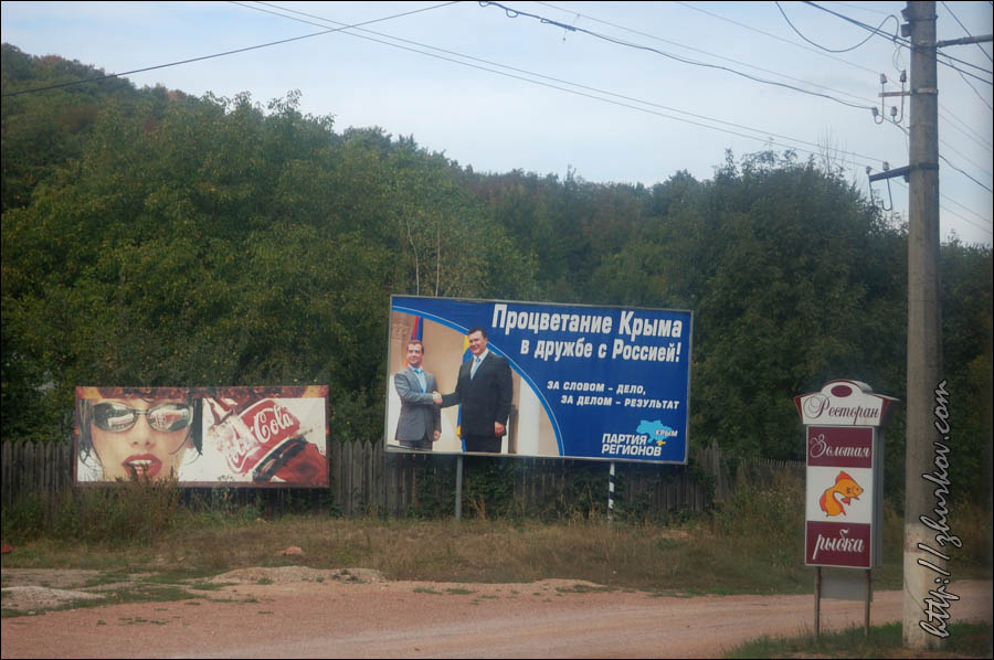 Красивых видов на море и побережье с этой горы нет, только на соседние горы, но все равно панорама прекрасная, издалека видна "Беседка ветров" на скале Шаган-Кая.Спускались через "Гурзуфское седло" (понижение между Бабуган-Яйлой и Никитской Яйлой, самый высокий горный перевал Крымских гор, высота 1388 м.), что заняло около 2х часов, при этом шли, часто срезая извилистую дорогу через лес, иной раз передвигались полубегом, ибо старались успеть засветло, т.к. в Крыму очень быстро темнеет, ночи очень темные, потому идти по лесу в таких условиях совершенно некомфортно, да и опасно (не видно, что под ногами, GPS-навигатор разрядился, можно заблудиться, телефон не ловит соту, палатки нет, а ночи осенью все-таки прохладные). Все равно до темноты полностью спуститься не удалось и пришлось бродить по тропам в потемках. К заброшенному карьеру и затем в Краснокаменку уставшие, но довольные вышли около 20 часов вечера. Я бы назвал этот поход одним из самых нелегких, что у меня были, сложнее был разве что многодневный поход с рюкзаком в детстве (1990 год) на Алтае (на Каракольские озера).К концу отдыха нормально загорел, и, несмотря на самое продолжительное пребывание в Крыму из всех, уезжать как-то не тянуло, хотя планы на отдых были выполнены:) В день отъезда погода резко изменилась, полил дождь, какого я в Алуште ни разу не видел, так что оказалось, что с отъездом подгадал вовремя:) Как и в прошлые годы сильно чувствовалась активная политическая жизнь на Украине, в дверь снимаемой квартиры регулярно долбились агитаторы за одного из кандидатов, трасса Симферополь-Алушта-Ялта была увешана билбордами типа "Процветание Крыма в дружбе с Россией!" и "Янукович - надежда Крыма!", а по местному телевидению шли весьма жесткие передачи, эти "надежды" методично развенчивающие:) В Симферополе увидел даже такой вот троллейбус, с весьма непонятной агиткой, наверное, сюда часто рвутся еще и какие-то нелюди, что им эта партия дает отлуп таким древним траликом:)В этот приезд Симферополь удивил тем, что, несмотря на кризис, все светофоры снабдили таймерами, как на красный, так и на зеленый сигналы для водителей и пешеходов, а не как в Томске, где это скорее редкость. В аэропорту Симферополя, как и в 2008 году, столкнулся с украинской службой безопасности, которой опять не понравилось перевозимое мной в багаже вино в пластиковых бутылках, купленное на разлив в Алуште в Массандровском магазине. Никаких запретов и ограничений ни по правилам авиационной безопасности, ни по таможенным правилам на этот счет не было, но, видимо, надо сделать вид, что работают. Не понимают бедолаги, что своими бредовыми требованиями наносят в первую очередь урон своему государству и Крыму в частности. В следующий раз навряд ли уже куплю и повезу вино, а кто-то и от поездки сюда откажется после таких разборок, ведь претензии, судя по списку на первичном досмотре, возникли еще к багажу десятка пассажиров, подобного не видел еще ни в одном из аэропортов, а тут уже столкнулся дважды, что говорит о системе.
