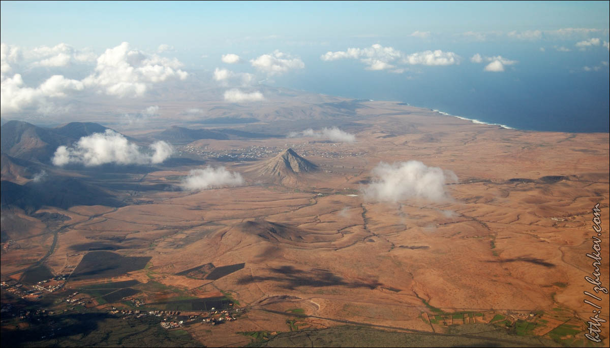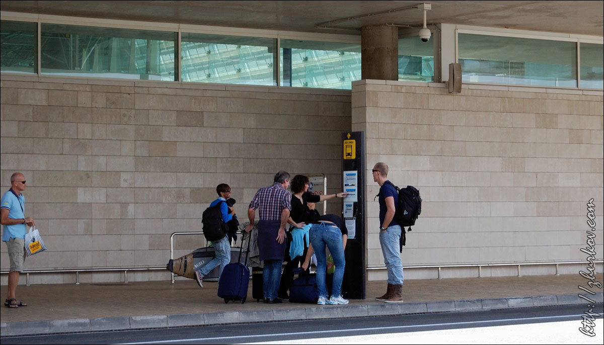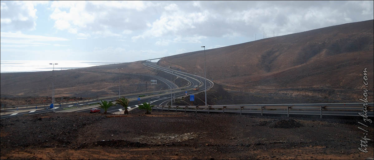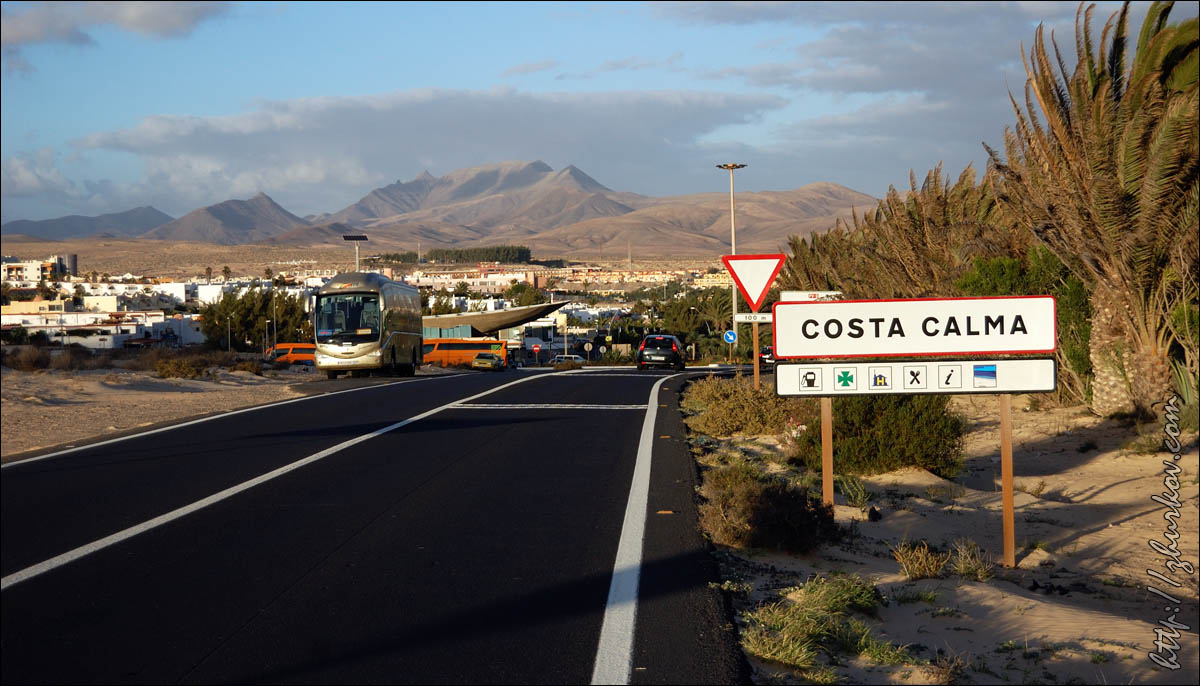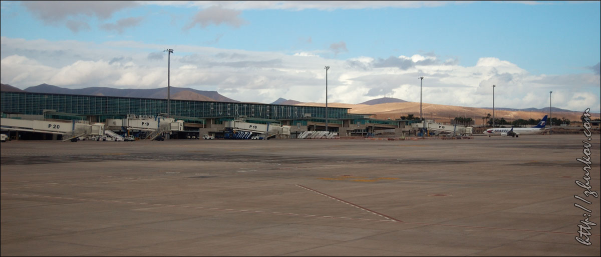 Из Дюссельдорфа, конечно, авиаперевозчиков на Канары превеликое множество, и на этот раз я летел опять на Condor Flugdienst (Thomas Cook Group), это были большие Боинги 757-300. Билеты вышли сравнительно недорогими, хотя RYANAIRом бы они вышли в 2 раза дешевле, но, поскольку билеты надо предъявлять при оформлении визы, опыта получения которой у меня не было, то я так рисковать не стал. Перелет занял чуть менее 5-ти часов, кормили один раз, при этом кормят в Condor весьма и весьма скромно, каким-то вегетарианским ужином. Аэропорт Фуэртевентуры Aeropuerto de Fuerteventura (FUE) огромный, ничуть не меньше аэропортов других островов, хотя туристов тут бывает значительно меньше. Первое, с чем пришлось столкнуться в аэропорту, так это с тем, как добраться до Коста Кальмы (Costa Calma), где был забронирован отель. На остановке около аэропорта висит расписание автобусов, и согласно ему прямой автобус из аэропорта до Коста Кальмы (№10) должен был быть через несколько часов. Позже оказалось, что в расписании указано время отправления автобуса не от остановки, на которой оно висит, а из конечных пунктов, один из которых расположен в доброй сотне километров пути:) Т.е. к указанному времени надо добавлять неопределенный интервал:)