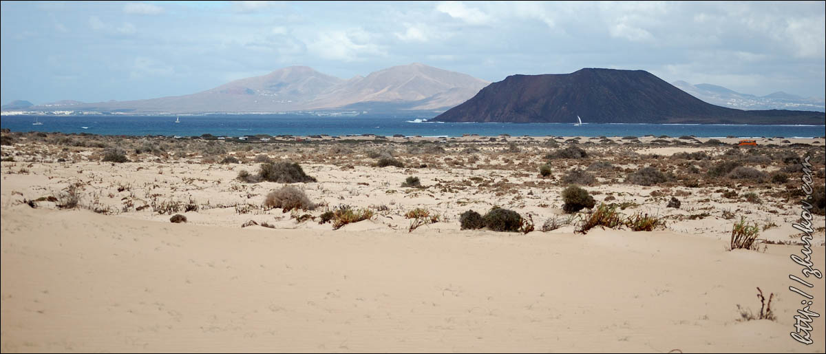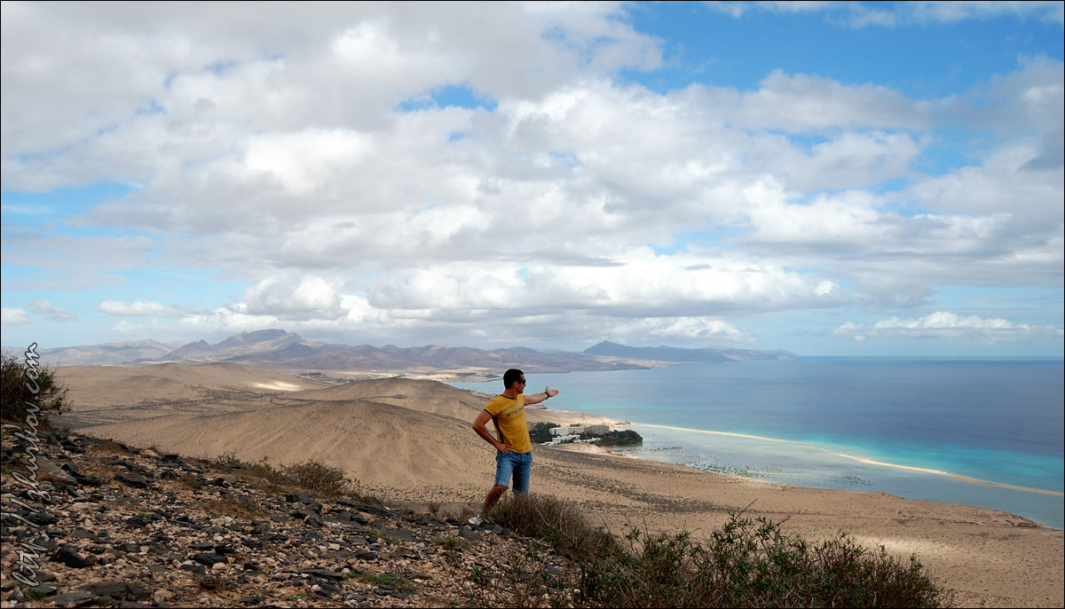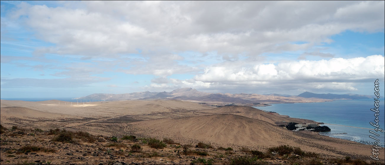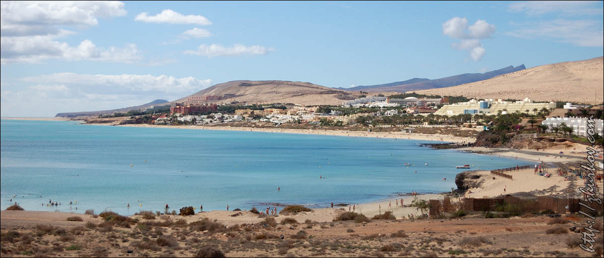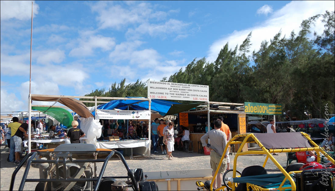 Когда я приехал, то первое время мне казалось, что вокруг одни немцы, уже позже стал замечать и другие национальности: испанцы, поляки, шведы, но их, конечно же, гораздо меньше. Потому с немецким языком тут проблем нет, и в магазинах, и в отелях вы с ним не пропадете. Русских я видел всего пару раз, плюс позже в мой отель вдруг заселилась пара русскоговорящих, так что, думаю, не ошибусь, если скажу, что наших на Фуэртевентуре отдыхает менее 1% от общего числа. Путеводителя по Фуэртевентуре на русском языке в магазинах нет, и не бывает. Сама Коста Кальма (карта) - это небольшой поселок, расположенный на юго-востоке Фуэртевентуры в самом узком месте острова. Курортной ночной жизни тут как таковой нет, есть несколько продуктовых супермаркетов, немного кафешек, различные лавки с сувенирами. Большую часть поселка занимают отели разного класса и бунгало. По воскресеньям и средам неподалеку от отеля "гудел" расположенный в чистом поле "рынок", решил посмотреть, что ж это такое - оказалось, там в основном негры торгуют всякой шнягой - кошельками, бусами и ремнями, и во всех трех рядах рынка одно и тоже, это же самое можно купить в разных сувенирных лавках в течение недели:) С интернетом ощущалась напряженка, все Wi-Fi сети запаролены, но во многих кафешках можно бесплатно посидеть в инете за чашечкой невкусного испанского кофе.Над пляжем Сотавенто недалеко от Risco del Paso возвышается гора Montaña Rayada (высота 258 м). Вид на Сотавенто оттуда открывается просто шикарный. В день, когда я туда пошел, было облачно, а когда я забрался на гору - и вовсе пошел дождь из зависшей в этом месте тучи (вообще, заметил, на Фуэртевентуре тучи какие-то "зависающие", могут висеть часами на одном месте:), не сильный, и не долгий, но все же.