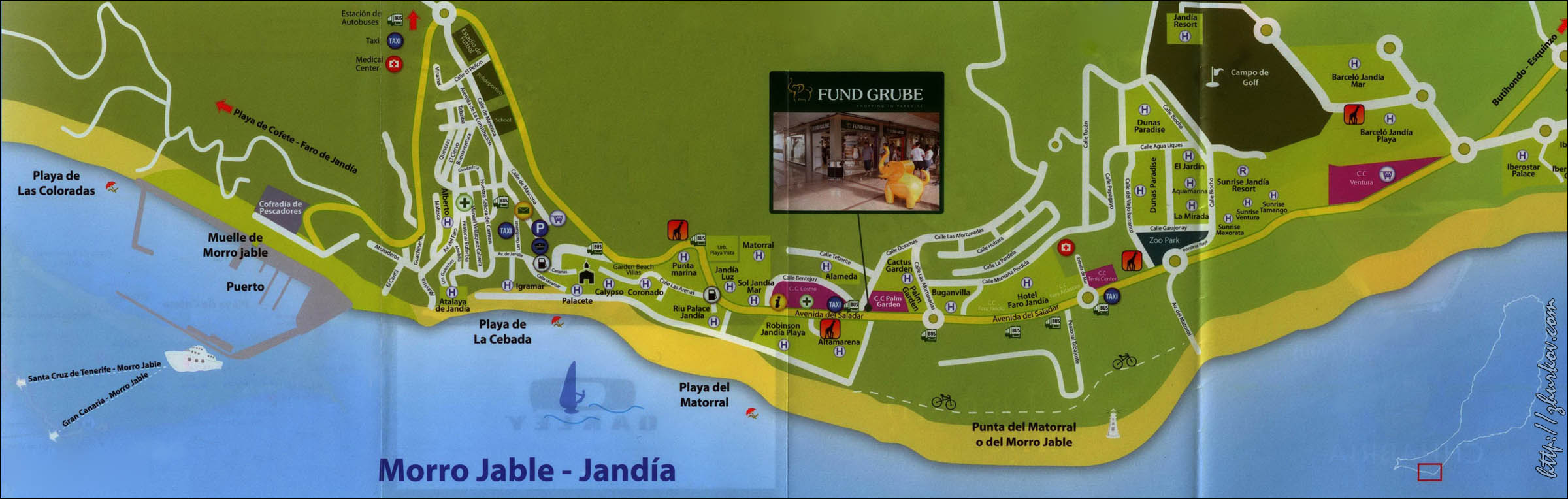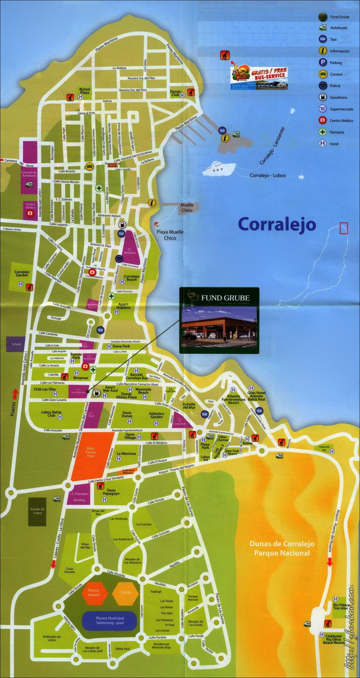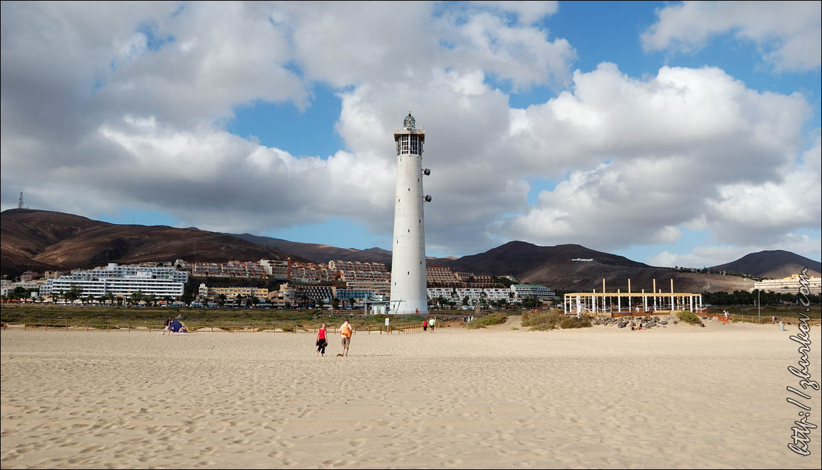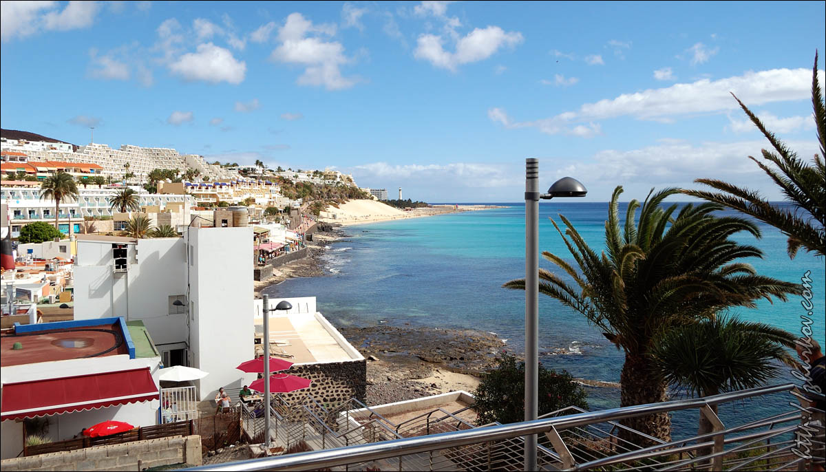Обустроена набережная и очень красивый пляж Playa del Matorral, доминантой здесь является маяк Faro del Matorral (высота 58.6 м, 1905 г). В городе есть порт, отсюда до Гран Канарии ходят паромы. Т.к. было воскресенье, то некоторые магазины и супермаркеты (в частности, Spar-Padilla) не работали, однако кое что себе я там прикупил:) Думал, там можно взять Такс фри, спросил по этому поводу, однако, продавщица мне сказала, что "Канары - это все Дюти Фри", там особый режим налогообложения. И это, на самом деле, видно по ценам - на Фуэртевентуре чуть ли не половина магазинов это те, которые торгуют парфюмерией и сигаретами, цены на парфюм в 2 раза ниже, чем в российских магазинах, на сигареты - в 2 раза ниже чем в Германии. Тогуют они своеобразно, например, на туалетную воду на ценнике указана одна цена, но тут же к тебе подходят с калькулятором и делают скидку 30-50% от указанной:)