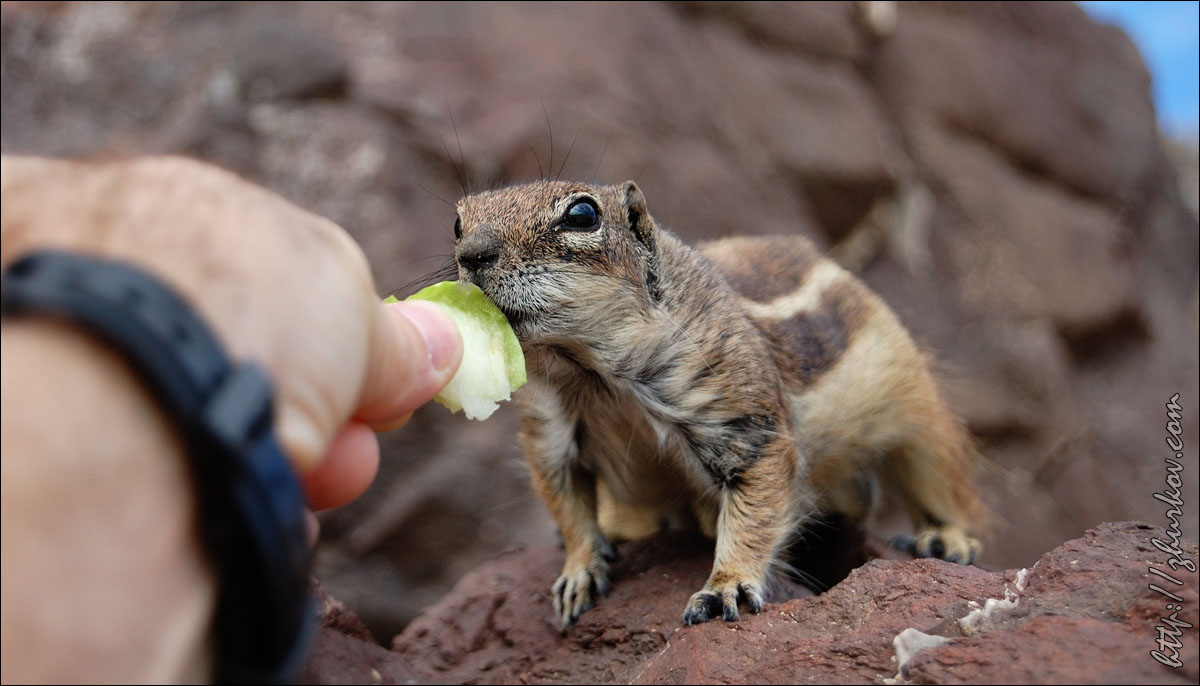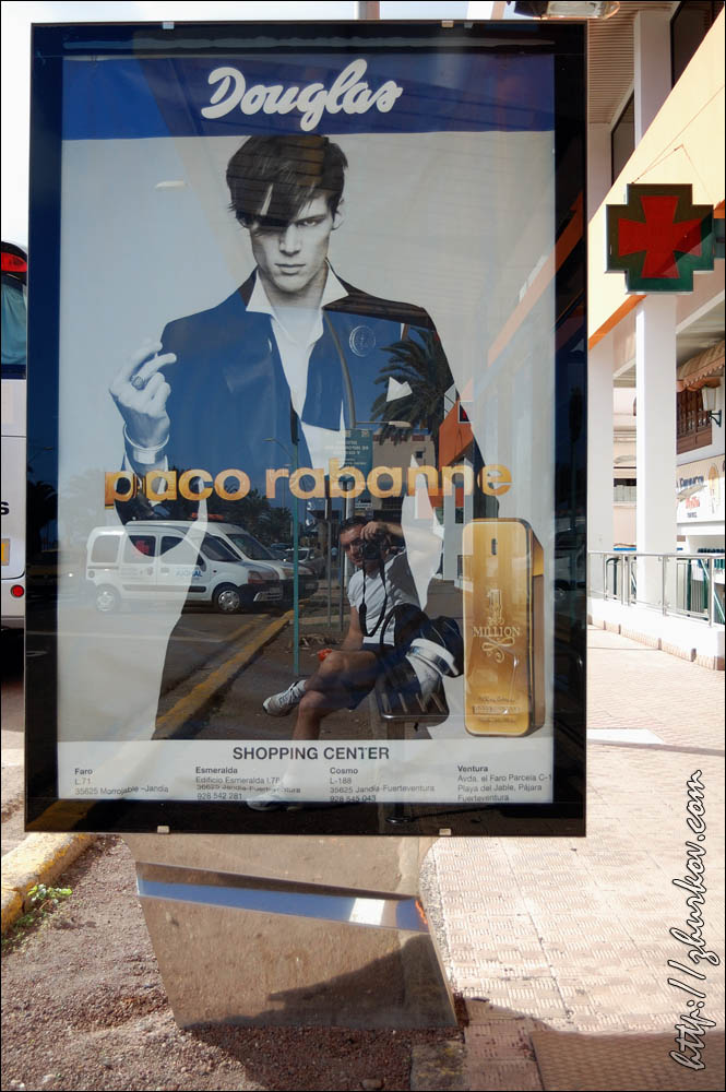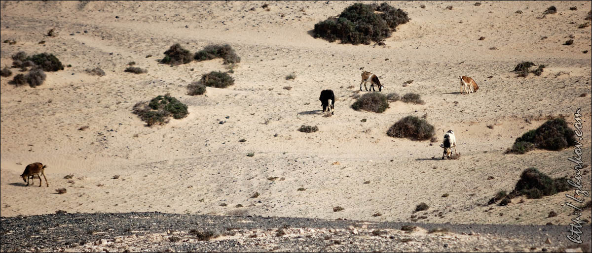 Тут чувствуется сила природы, с которой маленькому человеку совладать просто невозможно. Вокруг видны были следы обитания диких коз, и вскоре я их увидел уже живьем - они спокойно паслись среди песка и редкой пустынной растительности. Коза - символ Фуэртевентуры, наклейки с козой и надписью FUERTE можно увидеть на многих машинах и сувенирах. Кроме коз на Фуэртевентуре можно встретить ящериц, а также бурундуков, которые не прочь чего-нибудь покушать, например, фрукты:) Их можно увидеть в местах, где есть камни и какая-нибудь тропа, где ходит достаточно людей, регулярно угощающих чем-нибудь вкусненьким. Коз я видел также по пути в Морро Хабле (Morro Jable), куда я съездил в один из дней пребывания."Морро Ябле" - так называют это место все немцы, согласно произношению на немецком языке, в отелях к этому привыкли и объясняют им также:) Это основной туристический центр полуострова Хандия (Jandia) (карта). Туда раз в час из Коста Кальмы ходит автобус №5, стоимость проезда с картой Bono Bus составила 1.8 €, время в пути около получаса. В данном городке жизнь более интенсивная нежели в пляжной Коста Кальме, есть хорошие торговые центры, множество кафе и ресторанов.