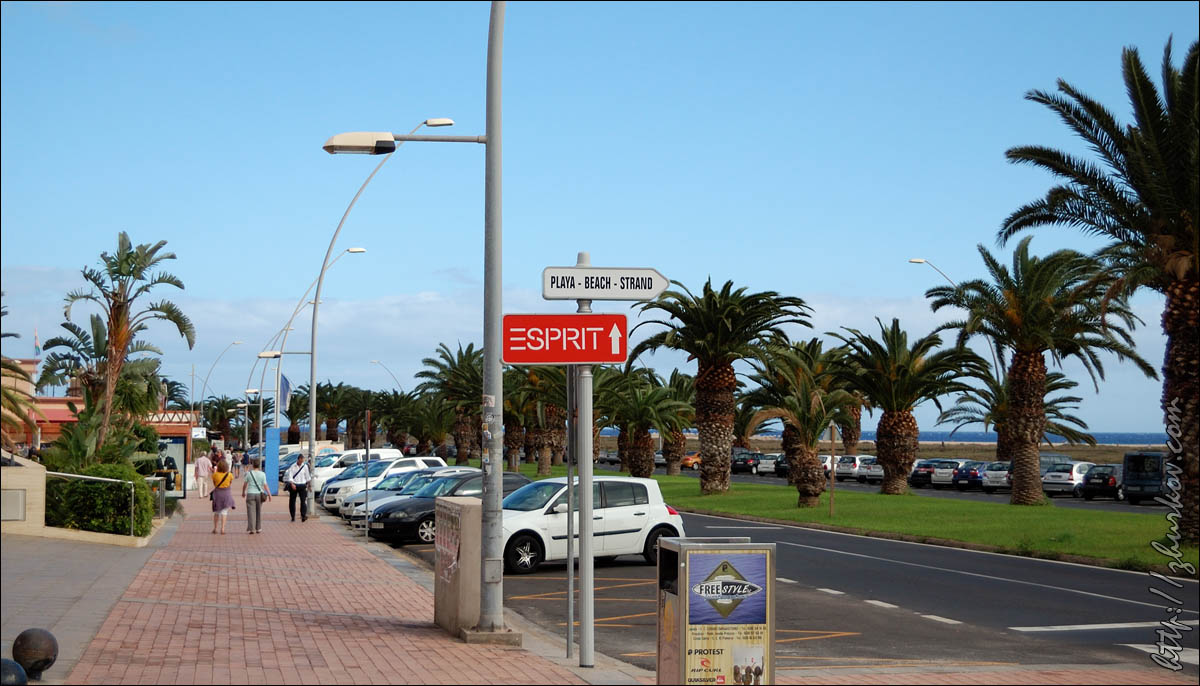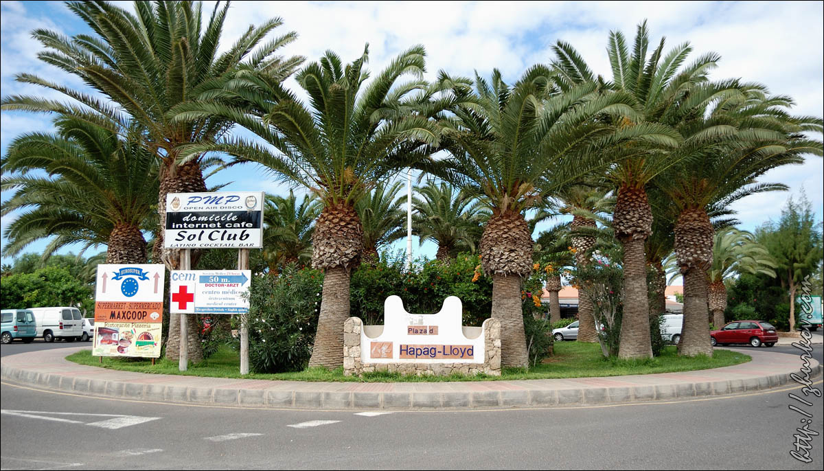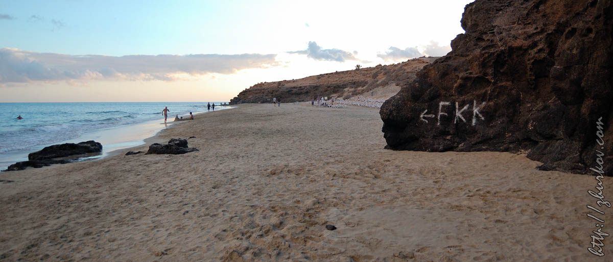 Если идти от пляжа Коста Кальмы на юг, то увидим нарисованные краской на камнях буквы FKK, это аббревиатура от немецкого Freikörperkultur, а по-нашему - нудизм. Конечно, под палящие лучи канарского солнца свои тела подставляют в основном немецкие пенсионеры, кои и составляют большую часть отдыхающих на Фуэртевентуре. Еще в начале 2000х, когда Фуэртевентура начала активно осваиваться отдыхающими, около 90% отдыхающих тут составляли немцы. Центральная улица Коста Кальмы (идущая параллельно проходящей рядом дороге FV-2, связывающей север и юг острова) имеет совсем не испанское название - Avenida Jahn Reisen (одна из немецких тур фирм), другая большая улица и площадь неподалеку от моего отеля называлась Hapag-Lloyd - по имени круизной компании, входящей в туристический концерн TUI, и т.д.