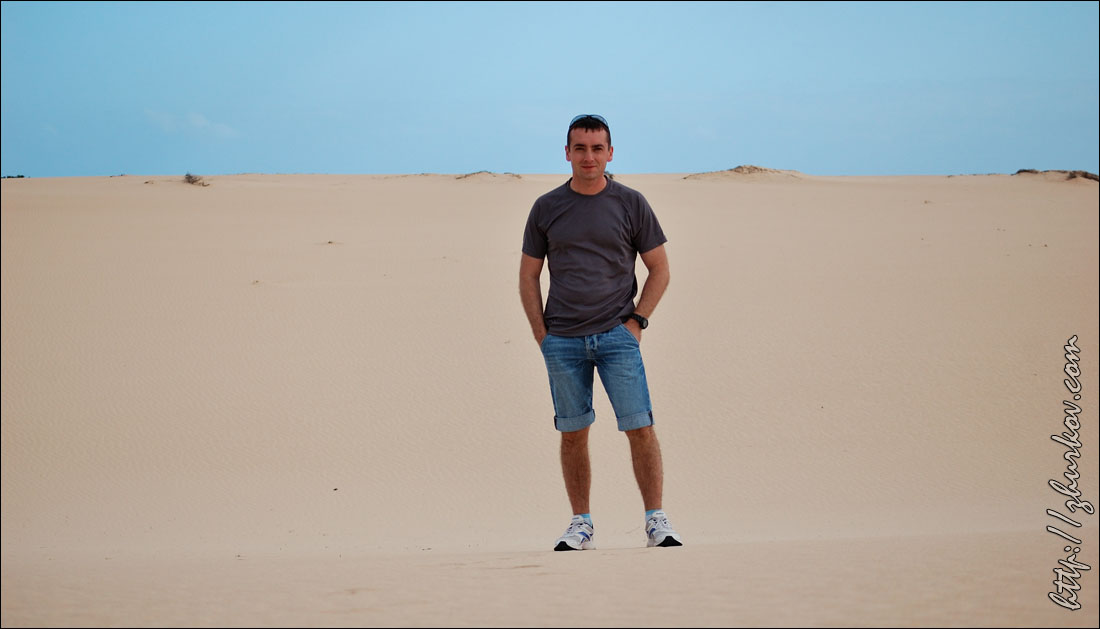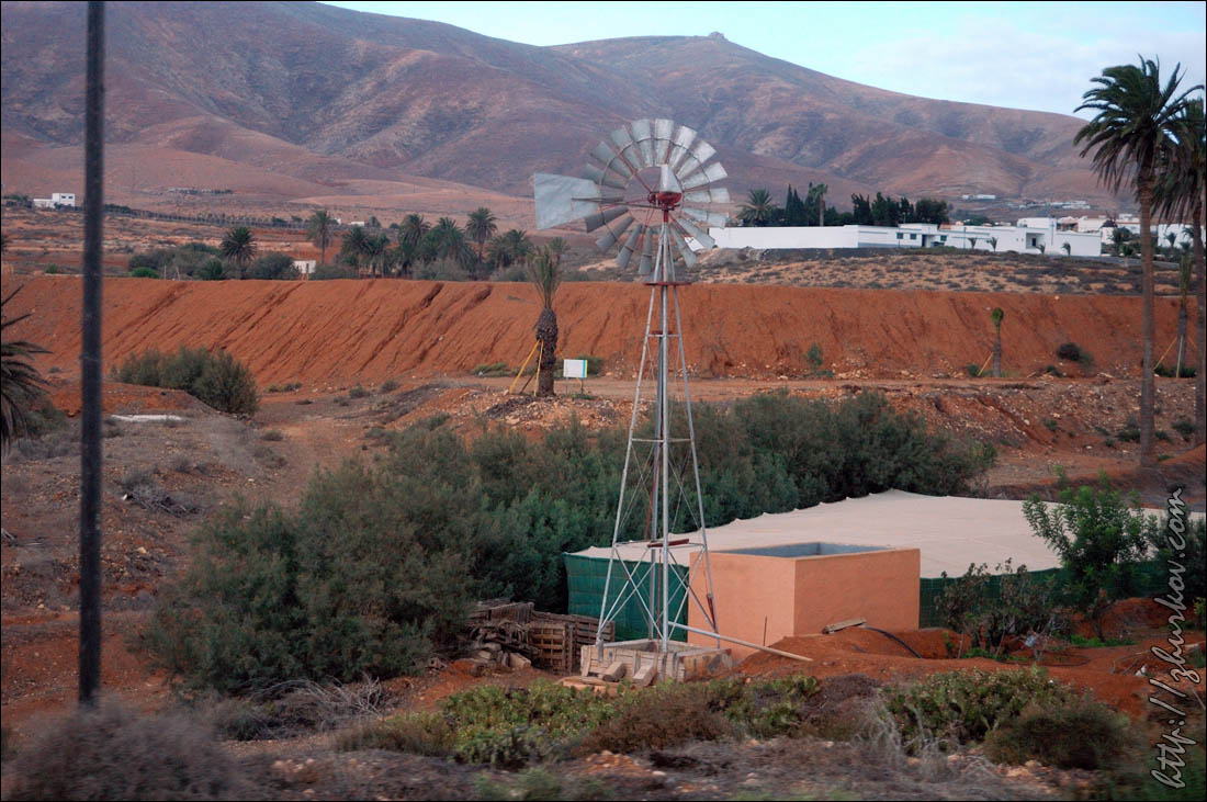 Путешествуя по острову, можно увидеть что-то типа добывающих вышек с ветряной мельницей наверху - это устройство не для добычи нефти, а для выкачивания воды, вода тут - главная ценность, после туристов, конечно же:) На Фуэртевентуре есть и другие населенные пункты, говорят, даже с относительно старинными зданиями, но мне было лень куда-то еще ездить смотреть, и я всему предпочел пляжи и океан:) Погода была иногда облачной, причем, иной раз с утра пасмурно, а после 11-12 тучи куда-то расходились. Ни разу не видел такого, когда несколько дней стоит непонятная дымка, как было и на Гран Канарии, и на Тенерифе. На Сотавенто океан очень мелкий можно пройти не один десяток метров и будет "по пояс", ветер же дует почти всегда, иногда ветер очень сильный, что заносит песком напрочь:)
