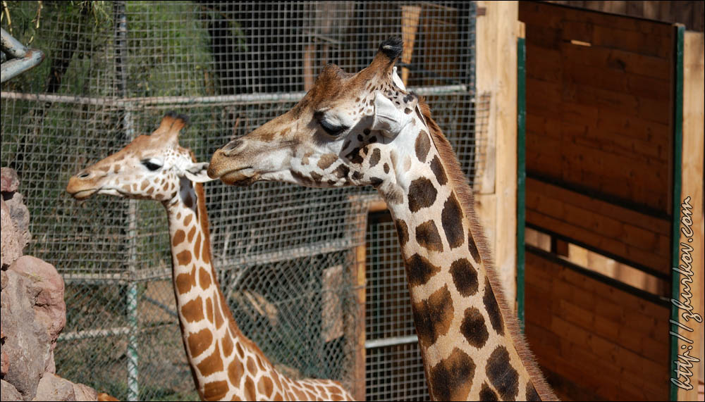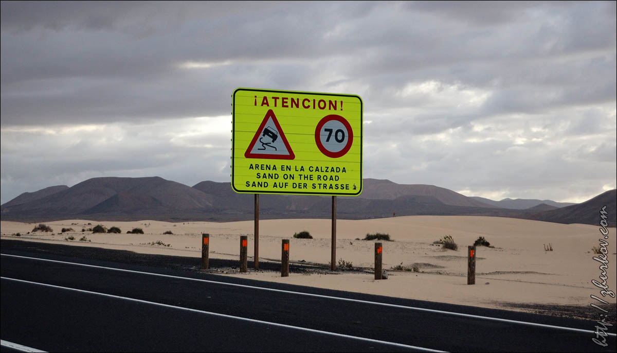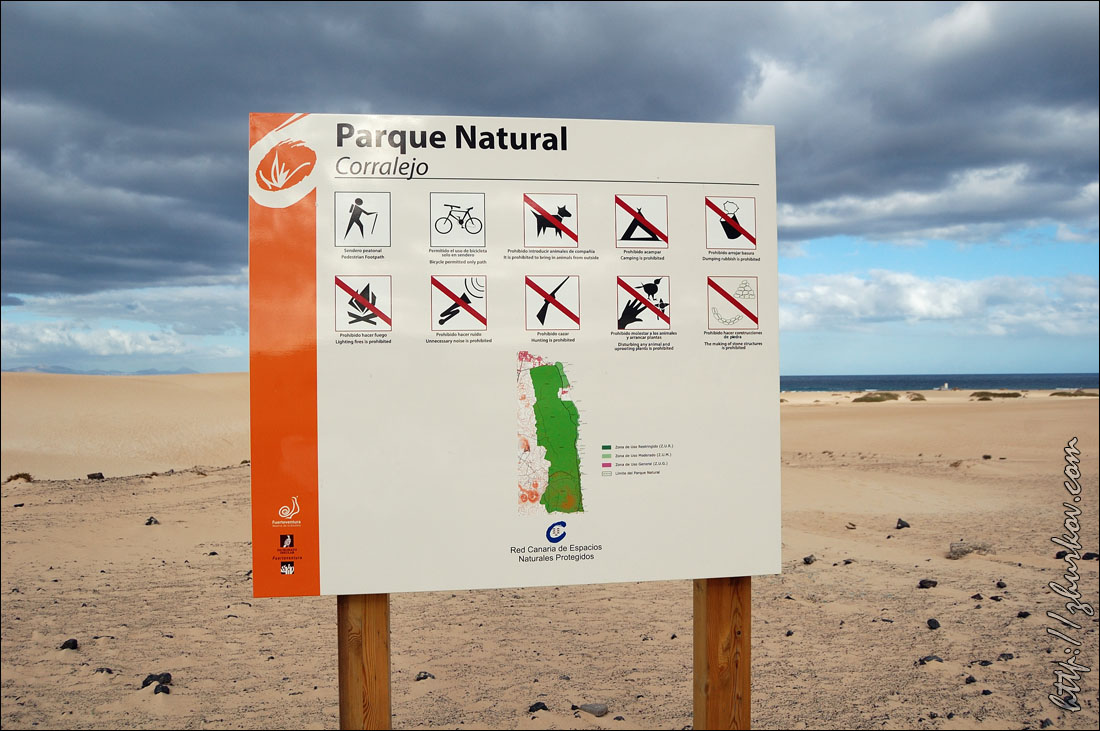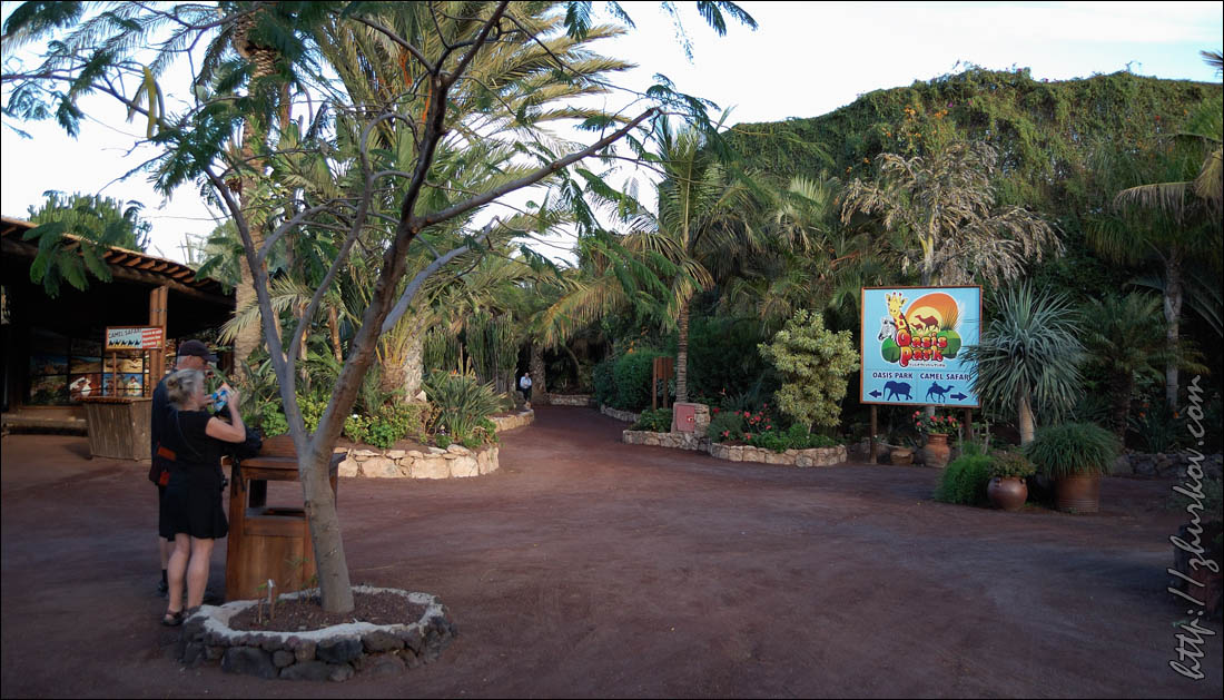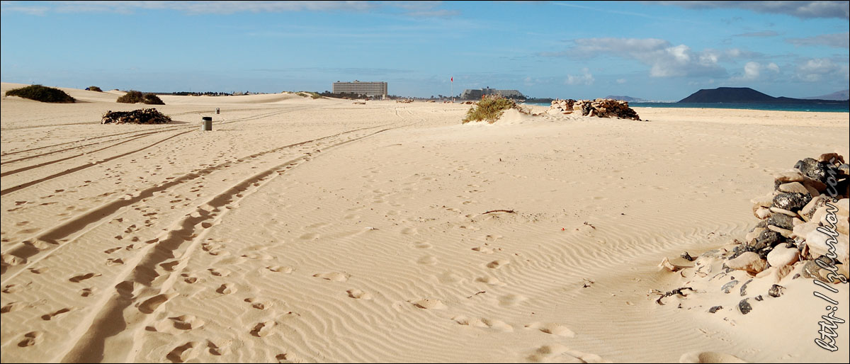 И так во всех подобных магазинах, за исключением разве что магазина Fund Grube, где можно взять карту Фуэртевентуры с расписанием автобусов и картами населенных пунктов, ее выдают также в отеле. Разговорился с продавцом в бутике Jack&Jones по поводу Фуэртевентуры, сказал ему, что, мол, че-то у вас тут ветрено, он парировал, типа ветрено - эт в Коста Кальме, а в Морро Хабле - очень даже хорошо:) И, правда, надо сказать, что ветер тут почти не ощущался. Что касается шоппинга, то также следует отметить еще один важный момент - в магазинах/супермаркетах надо всегда пересчитывать сдачу, я и раньше на Канарах сталкивался с этим (см. Лоро Парк), но тут мне просто рекордно - трижды недодавали сдачу, а один раз пробили на кассе несколько пакетов вместо одного:) Другой известный курорт Фуэртевентуры - это Корралехо (Corralejo), расположенный на севере острова (карта). Добраться туда можно через Пуэрто дель Росарио, пересев там на автобус №6. Приехав в Корралехо, я не увидел никакой разницы в климате по сравнению с югом острова, которая в аналогичном случае хорошо ощущалась на Тенерифе. В Корралехо также есть порт, откуда ходят паромы на Лансароте (Lanzarote) и близлежащий необитаемый островок Лобос (Isla de Lobos), в городе много магазинов и кафе.Основная достопримечательность Корралехо - дюны (Dunas de Corralejo), которые являются национальным парком и занимают пространство в 24 км2. Конечно, в Маспаломасе на Гран Канарии дюны гораздо эффектнее, но и тут есть, где разгуляться, кругом песок, причем часто песок этот такой вот - с ракушками. Песка здесь так много, впрочем, как и везде на Фуэртевентуре, что ставят соответствующие дорожные знаки. Пройдя через дюны, можно выйти к отелям RIU, там находится очень красивый бело-песчаный пляж Playa del Moro, а чуть поодаль - запускают воздушных змеев:) Здесь же расположена автобусная остановка, с которой я и уехал назад в Пуэрто дель Росарио. От многих отелей острова 2 раза в день ходят бесплатные комфортабельные автобусы в Оазис Парк, расположенный рядом с Ла Лахитой (La Lajita), в 17 часов они развозят туристов обратно. Вход стоил 25 € (в рекламных распечатках писали на евро меньше). В парке можно посмотреть на слонов, жирафов, бегемотов, крокодилов, и кучу других животных поменьше, кроме того есть всякие шоу с попугаями, морскими львами, рептилиями, однако после Лоро Парка на Тенерифе лично для меня все это выглядит как-то вторично.