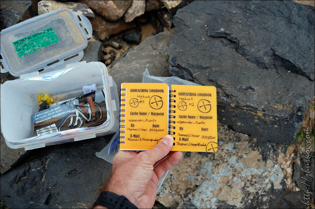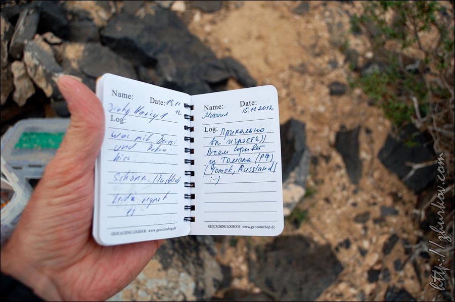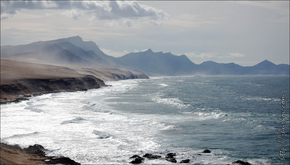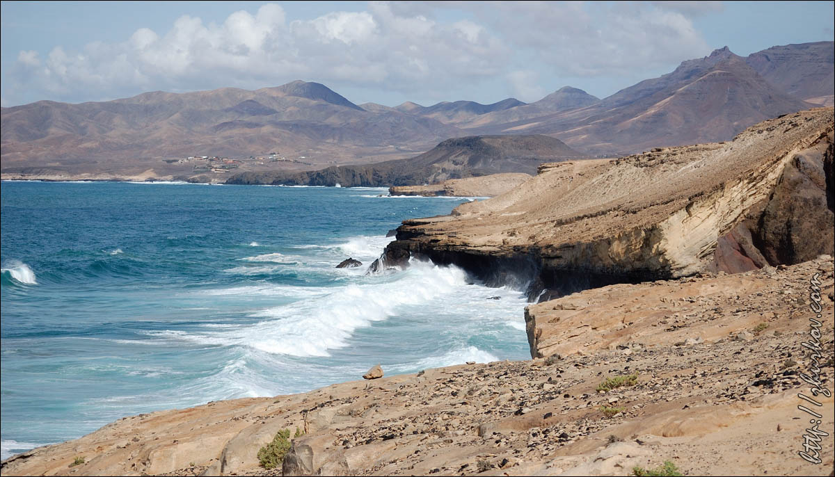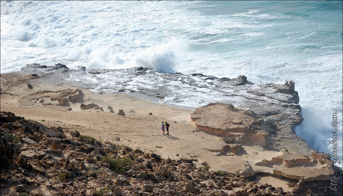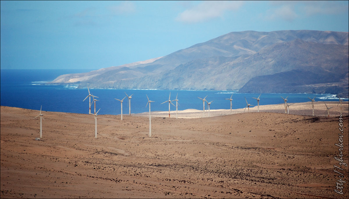 Позже я посмотрел его - он был заложен немцем под камнями в пластиковом контейнере. В гостевой книге №1 оставил там пару слов на русском языке для разнообразия:) Если повернуться на север, то с этой горы можно увидеть ветряные электростанции и то, насколько узка здесь Фуэртевентура, - видны западное побережье острова и океан с той стороны (на фото слева - западное побережье, справа - Сотавенто и Коста Кальма). Конечно, я не мог не перейти остров в его самом узком месте (около 5 км), благо, от моего отеля путь для этого был кратчайший, пешком вдоль дороги к населенному пункту La Pared он занял чуть более часа. На противоположном берегу предо мной предстала совсем другая Фуэртевентура - с единицами туристов, совершенно не пляжным побережьем и огромными волнами, разбивающимися о скалы.