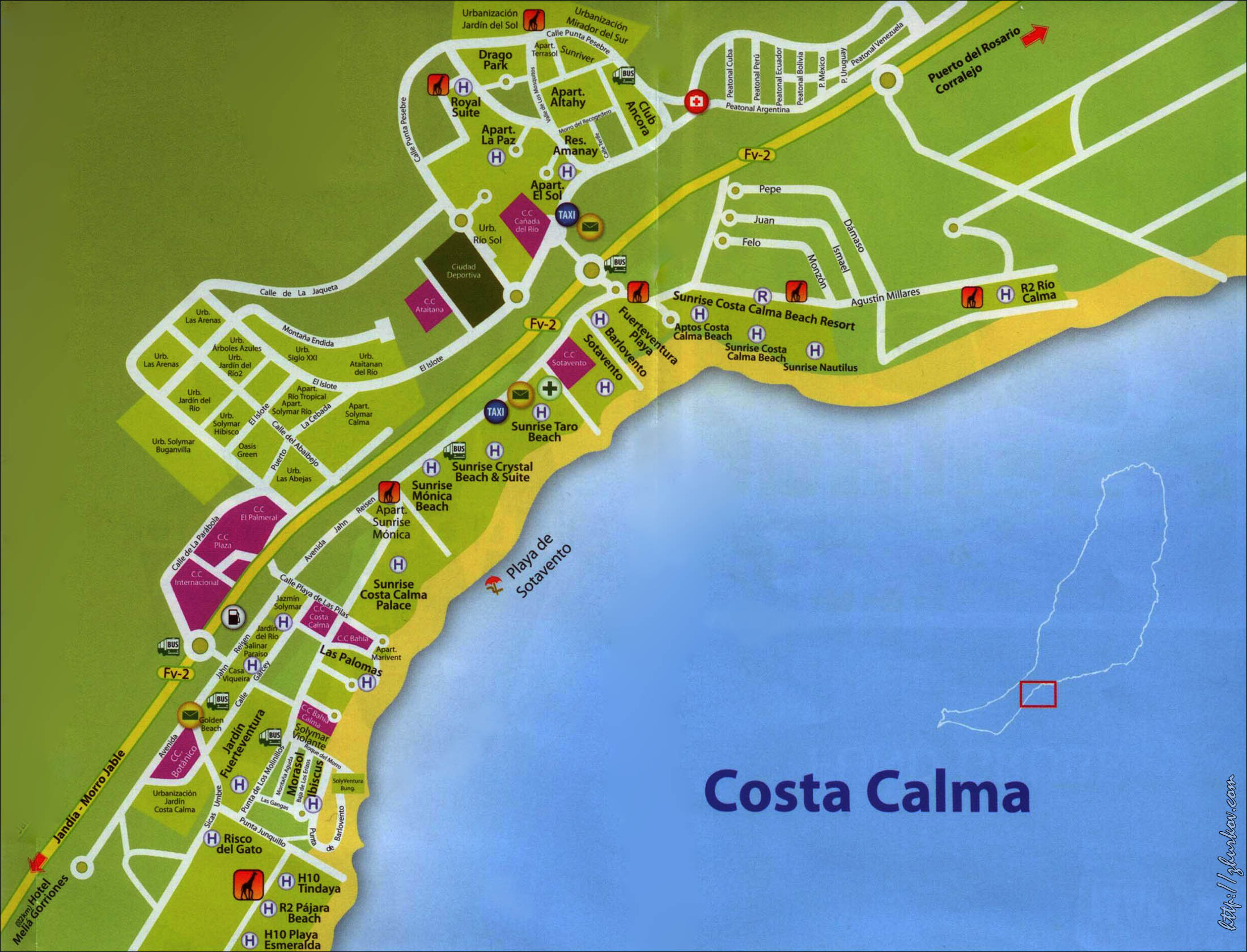 Потому загорать там без специальных ограждающих конструкций бывает не совсем комфортно. Однако, можно найти места, где и ветер совершенно не ощущается, и океан у пляжа глубже, - например, с противоположной стороны Коста Кальмы около отеля Rio Calma, где возвышенность закрывает от ветра побережье.