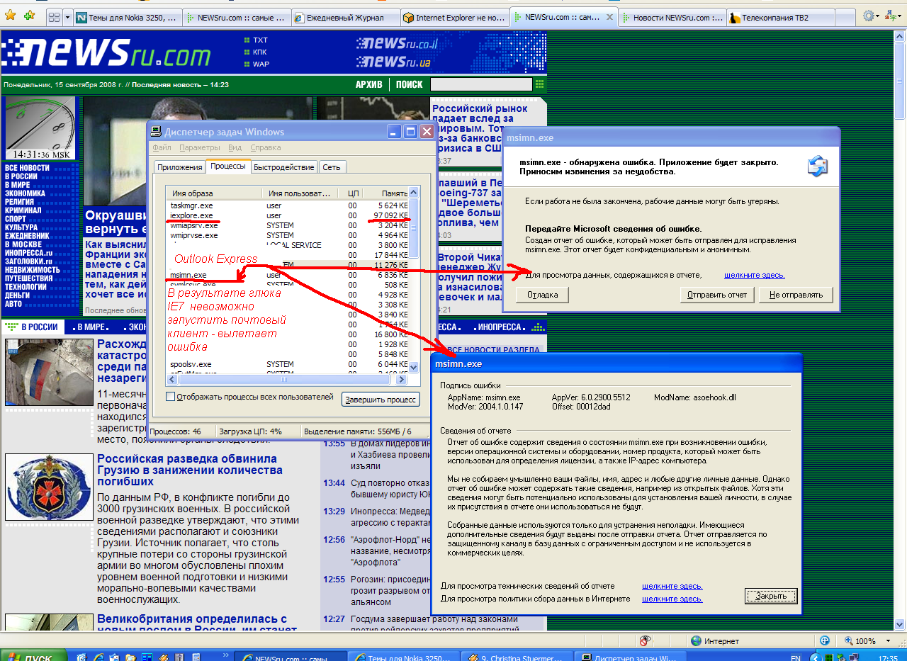 Избавление от Internet Explorer 7Меня окончательно достали глюки с Windows Internet Explorer 7, потому я решил от него отказаться, хотя пользовался этим детищем Microsoft довольно давно. Когда он только появился, конечно, скорость отображения страниц увеличилась, и появилось много удобных вещей (например, вкладки, которые, как говорят, на самом деле стащили из Оперы), но вскоре обнаружились и глюки, точнее даже глюк - зависание системы при длительном использовании этого браузера. Как оказалось, подобные проблемы не у меня одного и встречаются не только на Windows XP. В Интернете полно подобных отзывов, например, iXBT.com: Жуткий глюк IE7.0, и даже на сайте MS - Microsoft.com: Память + IE7 in Internet Explorer. Шло время, но обновлений, устраняющих сие, так и не появилось. Недавно, активно пользуясь интернетом, меня это совсем уж задолбало, когда по нескольку раз приходилось закрывать все окна, срубать процесс из Диспетчера программ, а потом заново запускать браузер. Конечно, я написал об этом в саппорт Microsoft, еле разобравшись куда писать на их донельзя перегруженном сайте: Sent : 4 сентября 2008 г. 11:35:44 UTC To : "Russia@microsoft.com" Subject : Проблемы с Internet Explorer 7 Здравствуйте, ![]() долгое время использую Вашу продукцию, в частности, сейчас у меня на рабочем компьютере установлена Windows XP и Internet Explorer 7 со всеми обновлениями, с начала использования Вашего браузера при длительной работе в Интернет и одновременном открытии/закрытии нескольких окон возникают проблемы с работоспособностью обозревателя и компьютера в целом. В определенный момент Internet Explorer 7 перестает открывать новые вкладки (в заголовке вкладки написано "Подключение.." и на этом процесс останавливается), на компьютере перестают запускаться различные программы, как будто программам не хватает ресурсов (памяти) для запуска. При закрытии окна IE7, память, занимаемая им, уменьшается, но он все равно остается висеть в списке задач (см. вложенный скриншот). При завершении IE7 через Диспетчер задач работоспособность компьютера восстанавливается, но бывает так, что и Диспетчер задач невозможно запустить, пока не будут закрыты какие-нибудь программы и не будет высвобождена дополнительная память для его запуска. Никакие дополнительные надстройки к обозревателю и прочее мной не устанавливались. На компьютере (AMD Athlon X2 4000+) установлено 1 ГБ оперативной памяти. Такие проблемы возникают не только у меня на рабочем компьютере, но и на домашнем, и у моих коллег, а также у других пользователей, чьи отзывы можно найти в Интернет, например, здесь описывается аналогичная проблема: http://www.softboard.ru/index.php?showtopic=48497 На Вашем сайте найти ответ по этой проблеме не смог, уж слишком он непонятно и нелогично устроен, на мой взгляд. Предлагают регистрироваться в службе Windows Live, зачем мне тратить свое время на это? Даже этот адрес электронной почты нашел не сразу. Ответьте, пожалуйста, можно ли избавиться от этих проблем с Internet Explorer 7? А то прошло два года и эта проблема до сих пор не устранена, в то время другие браузеры достаточно динамично развиваются, и нет уже смысла использовать такой глючный продукт, с которым долго работать в интернет просто невозможно. С уважением, Привести скриншот того, что при нажатии правой клавиши мыши перестают выпадать меню, сложно, но то, что происходит вследствие проблем с ИЕ с запуском других программ, наглядно показывает еще один приведенный здесь скриншот - по