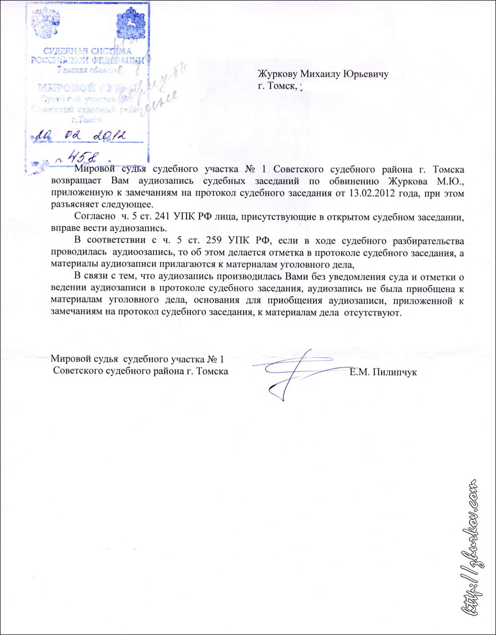 Новости20.03.2012 - История повторяется Идет рассмотрение моего дела в суде апелляционной инстанции, сегодня слушали диктофонную запись конфликта. Все повторилось, как и в суде первой инстанции: мы заявили ходатайство о проведении экспертизы записи, однако, нам в этом судьей Зуевым С.А. было отказано - нынче обоснованием стало то, что выводы эксперта касательно ударов будут являться предположением, а на предположении не может быть основан приговор. Если же внимательно взглянуть на УПК, то в соответствии с п. 4 ст. 302 УПК РФ и ст. 14 УПК РФ на предположениях не может быть основан обвинительный приговор, но не оправдательный. В данном же случае аудиозапись предъявлена стороной защиты в качестве доказательства лжи "потерпевшей" с ее свидетелем и отсутствия звуков ударов, но, видимо, наше "правосудие" это не интересует:) Прокурор Мартынова по поводу проведения экспертизы аудиозаписи теперь заявила, что (следите за руками) она не против ее проведения, но якобы это необоснованно затянет процесс:) Опять же она задавала вопросы "потерпевшей" так, что в вопросе сразу следовал и ответ. В конце заседания она ходатайствовала о вызове свидетеля Бондарчук, и суд ее ходатайство почему-то удовлетворил, нам же в этом ходатайстве суд на прошлой встрече отказал, - как говорится, почувствуйте разницу:) current music: DJ M.E.G., Сергей Лазарев, Тимати - Moscow to California 17.03.2012 - Новая гостевая книга К сайту прикрутил PHP-скрипт гостевой книги вместо ранее использовавшегося стороннего ресурса. Теперь гостевая расположена здесь. При портировании сообщений из старой базы из-за небольших проблем с кодировками (немецкие буквы с умлаутами) они немного закосячились. current music: Silbermond - Himmel auf 29.02.2012 - Преступники в мантии - реальность? Как я уже говорил, мы подали замечания к протоколу судебного заседания, поскольку данный протокол был сфальсифицирован чуть менее, чем полностью, т.е. вместо данных на суде показаний, туда вписаны нужные для обвинительного приговора "показания", необходимые вопросы и реплики, которых в действительности в судебном заседании не было. Сегодня пришел ответ, как и ожидалось, "судья" Е.М. Пилипчук отклонила большинство замечаний "в связи с их необоснованностью", удовлетворив только некоторые не важные с точки зрения приговора реплики "в связи с их правильностью":) Аудиозапись судебного заседания, конечно же, Пилипчук к материалам дела не приобщила, сославшись на ч.5 ст. 259 УПК РФ, якобы ее должны были уведомить о ведении записи. В этой связи удивляет юридическая безграмотность "судьи", которая не понимает, что данная статья относится к ведению записи секретарем суда, при этом в соответствии с ч.5 ст. 241 УПК стороны вовсе не обязаны уведомлять суд о ведении аудиозаписи. Если же должны были бы уведомить, то она была бы обязана разъяснить об этом перед началом судебного заседания, когда разъясняла права и обязанности. В общем, преподавателям ТГУ, выпускающим подобных "юристов", должно быть стыдно за то, что они выпестовали для томичей и страны. У меня же, можно считать, один пункт для жалобы в ЕСПЧ по поводу нарушения права на справедливое судебное разбирательство уже есть. current music: Jessie J - Domino (Myon & Shane 54 Remix) 21.02.2012 - Апофеоз пропаганды на Первом Канале Давно известно, что все центральные телеканалы РФ занимаются ничем иным, как откровенной пропагандой режима Путина. В последнее вре