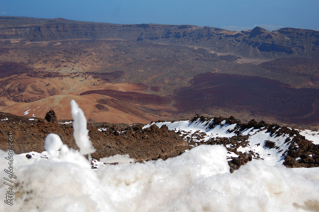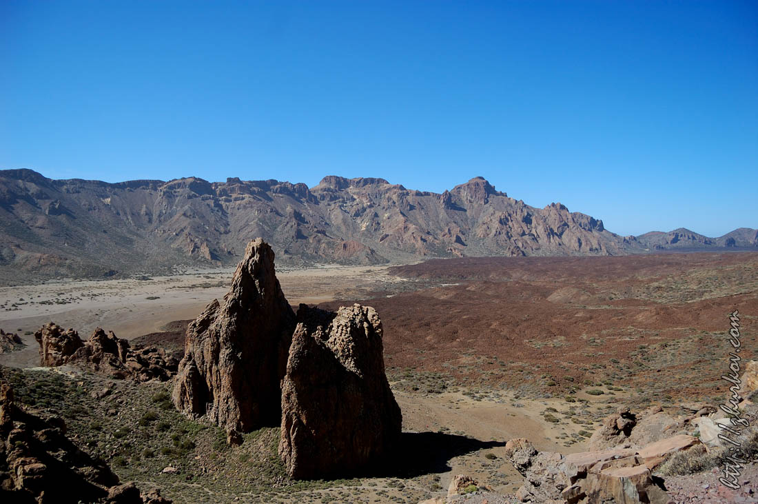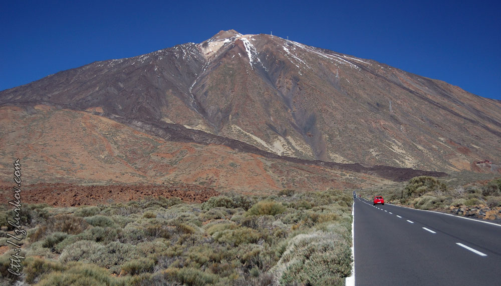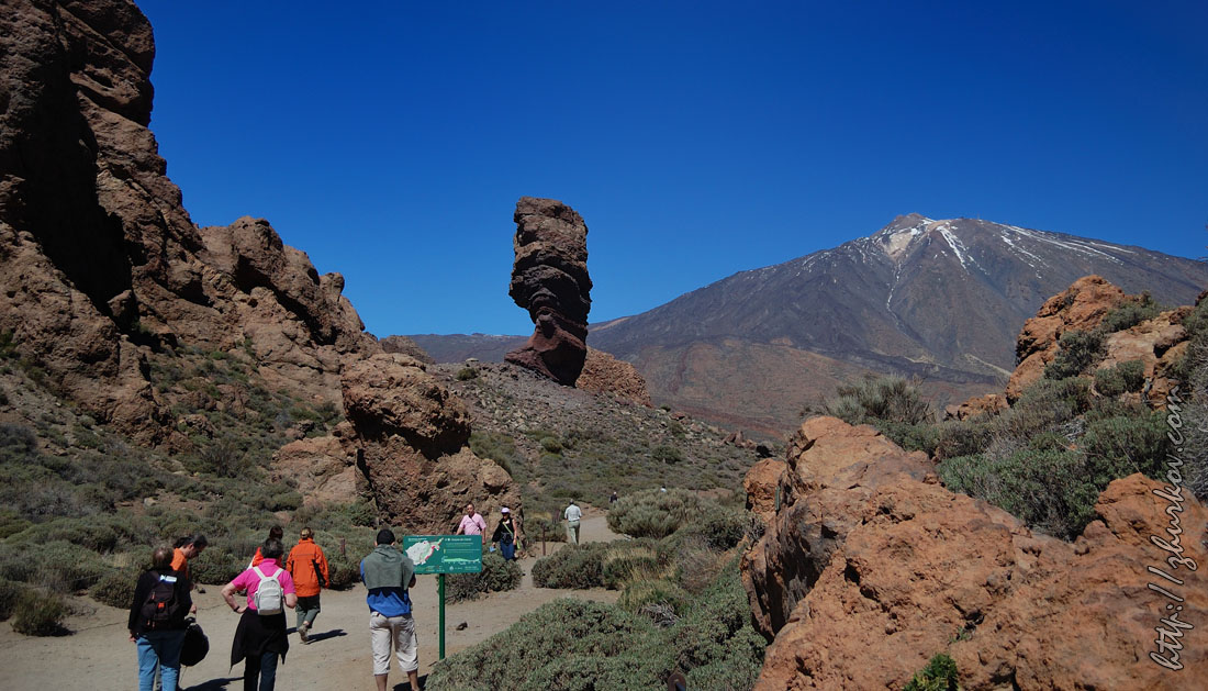 Пришлось идти в офис компании и разбираться, что было сделать очень сложно, поскольку испанцы плохо говорили на английском и совсем не говорили по-немецки, еле разрешилось, поставили штамп в билет и в автобус №111 меня посадили уже перед самым его отъездом:)![]() Следующая достопримечательность острова, куда многие хотят забраться - это вулкан Тейде, который и дал название этому острову (Тенерифе - "Белая гора"). Ранее вулкан был значительно выше, однако после извержений он разрушился, образовалась кальдера (Las Cañadas caldera, циркообразная впадина 16х9 км, т.н. "большой кратер"), которая сейчас образует Национальный парк Тейде (Parque Nacional del Teide). В ней расположены несколько вулканов, в т.ч. самая высокая точка Испании - Pico del Teide, ее высота составляет 3718 м. Из Плайя де Лас Америкас автобус №342 туда ходит раз в день (в 9:15), и один раз обратно (в 15:15 из El Portillo), время в пути по горному серпантину около 2х часов. В конце пути автобус сначала останавливается около гостинцы (остановка Parador de Turismo), расположенной на территории Национального парка, тут в основном все выходят, здесь находится ресторан и парковка. Отсюда проложены туристические маршруты по парку и, неспешно прогуливаясь, можно насладиться видами предстающего перед тобой пустынного пейзажа. Отсюда совсем недалеко находится выветренный кусок скалы, высотой 27 метров - Roque Cinchado, который есть на всех открытках с видами Тенерифе. Растительность скудная, повсюду куски застывшей лавы и песок.