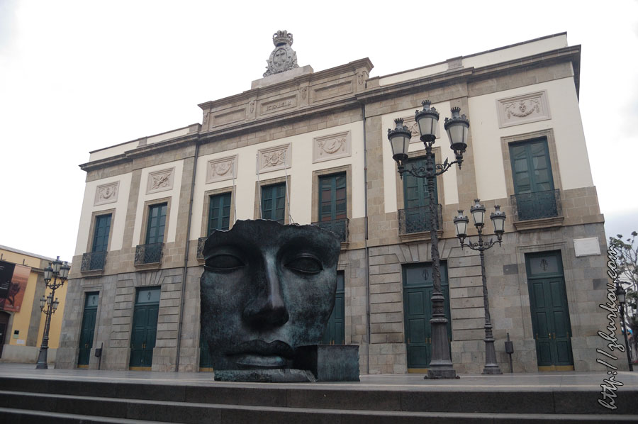 Так я запечатлел такую необычную картину - дворник, подметающий улицу, - у нас березки, у них - пальмы:)Из Ла-Лагуны поехал смотреть Санта Крус де Тенерифе - он в свое время начинался как порт Ла-Лагуны. Сейчас это крупнейший деловой и туристический центр Канарских островов. В нем тоже есть на что посмотреть, замки, площади, очень много различного рода красивых зданий особняков и дворцов, также впечатляют великолепные парки, расположенные прямо внутри кварталов. Рядом со зданием театра Guimerá, названного так в честь местного поэта, расположена большая скульптура Per Adriane (1993) известного польского монументалиста Igor Mitoraj, который разбросал свои "головы" по миру, где только можно. Недалеко от театра находится центр искусств La Recova, здесь проходят различные выставки, также здесь расположен городской рынок, о чем гласит расположенная на входе надпись. Здание в стиле неоклассицизма построено в 1944 году одновременно с ведущим к нему мостом, который проложен через ущелье Santos с пересохшей ныне рекой. Поскольку это большей частью новый город, то встречается много и современной архитектуры, включая многоэтажки.