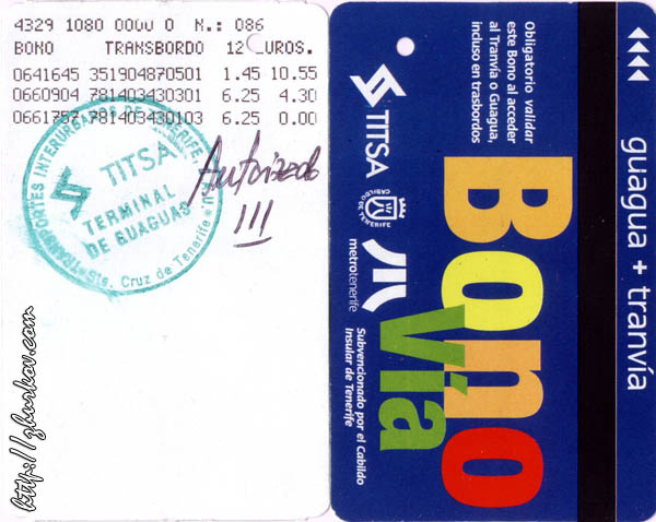 По этому билету меня водитель посадил на автобус до Санта Крус без проблем, сказав, что оттуда дальше поедешь по этому билету до Плайя де Лас Америкас, но там, конечно же, никто меня слушать не стал, поскольку это другой автобус и другой город, и никого не интересовало, почему я отсюда хочу уехать по карте, на которой не осталось денег:)
