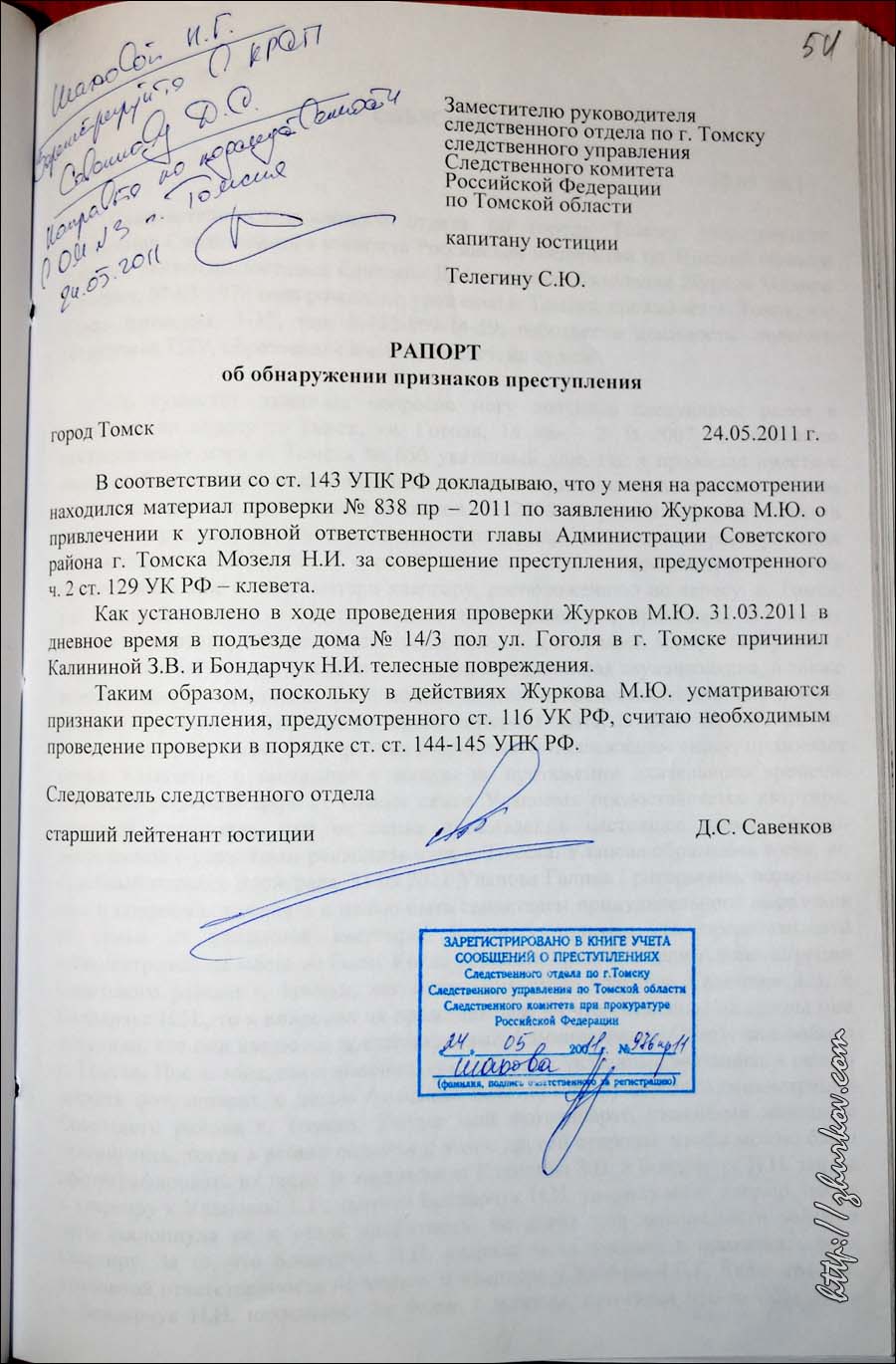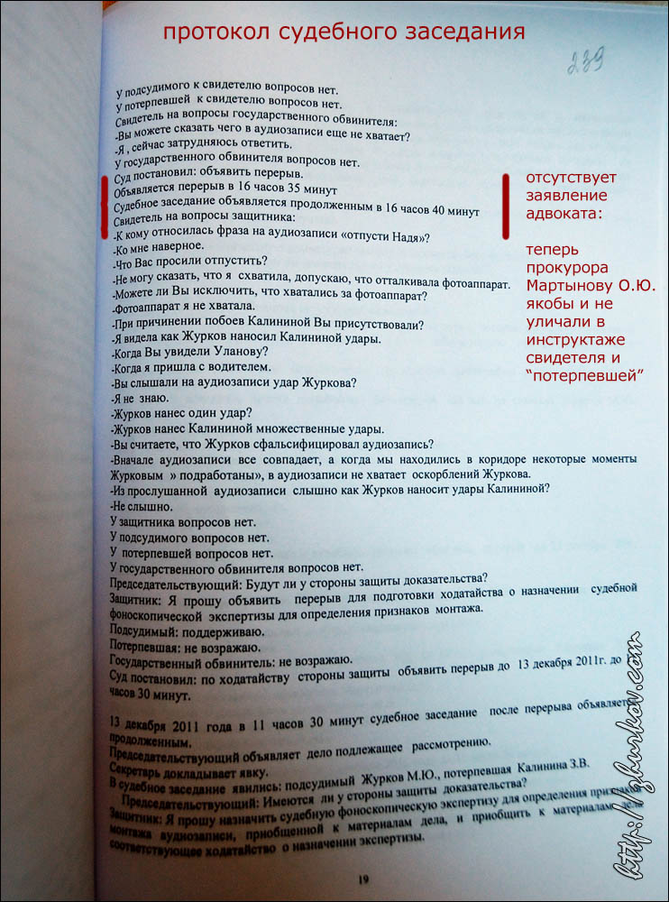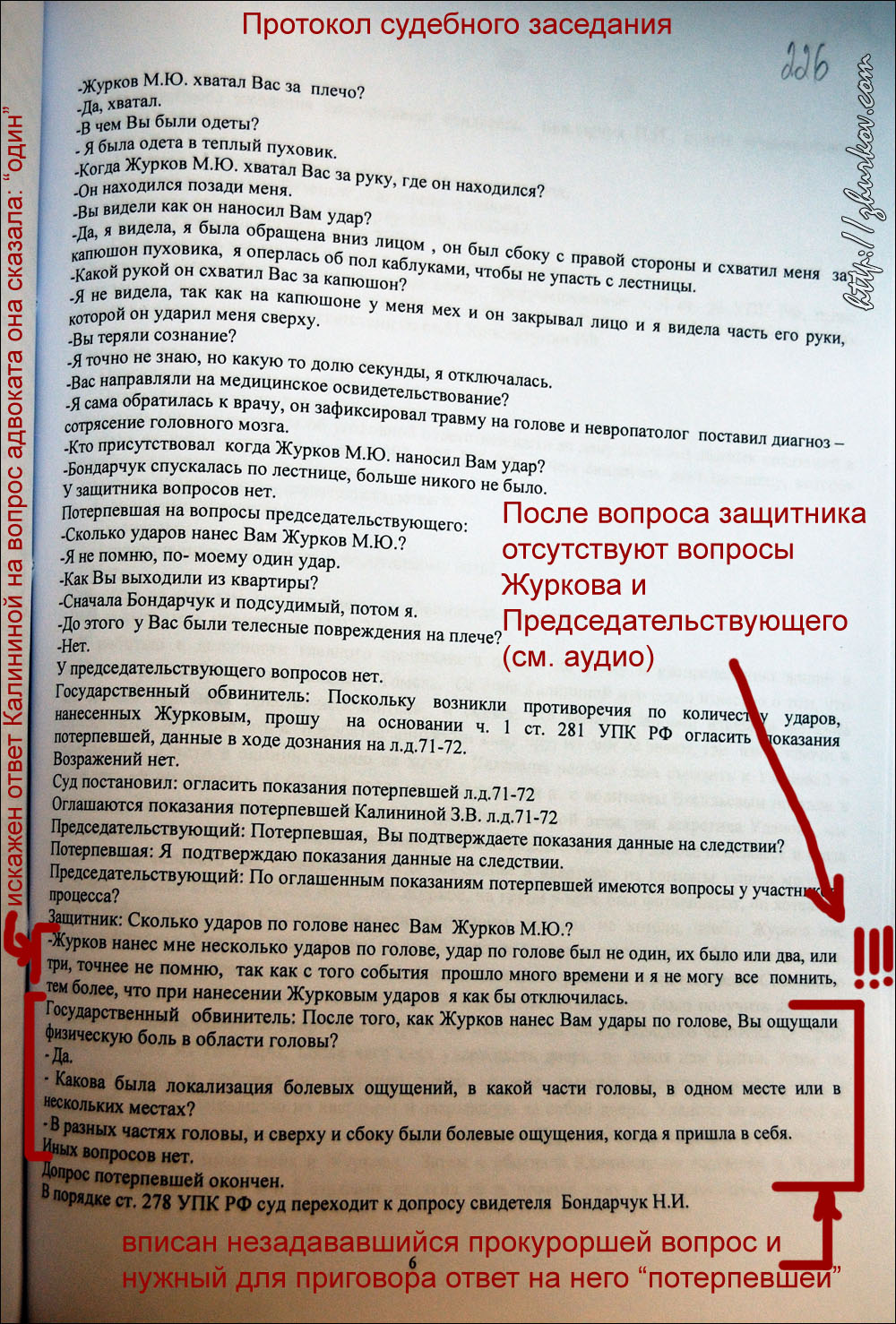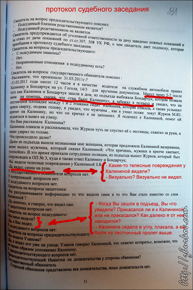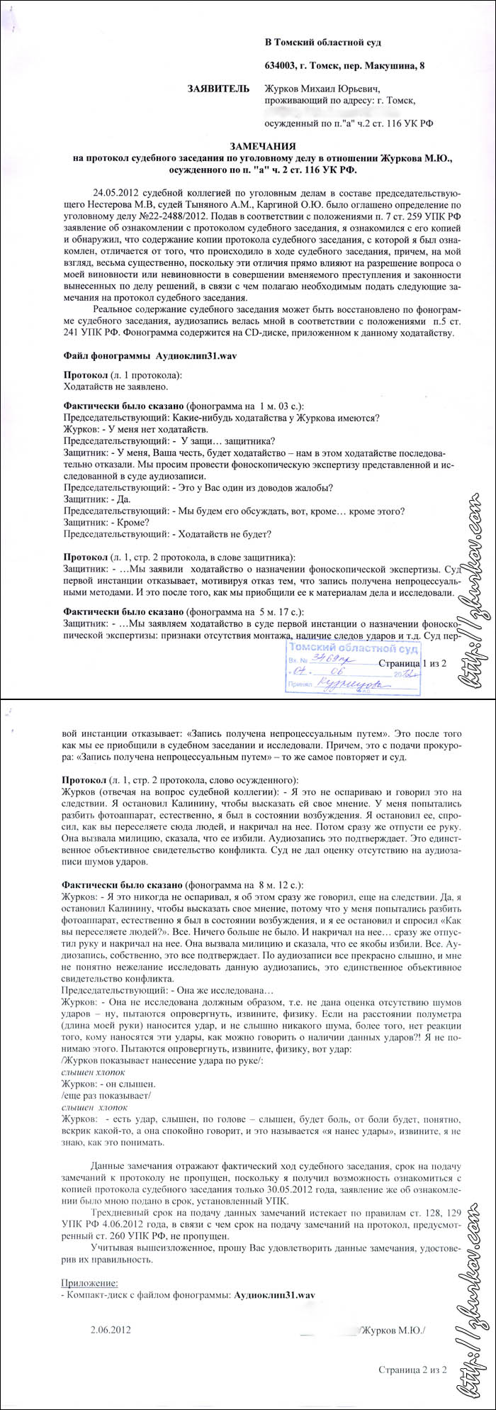 АннотацияДля тех, кому лень/некогда читать, коротко обо всем, что здесь на странице написано*.Я пытался сфотографировать работу чиновников из администрации Советского района в расселяемой квартире. Т.к. им это не понравилось, одна из них (Бондарчук) попыталась разбить мою зеркалку, но я этого не дал сделать. Отпустив камеру, она ударила меня по лицу, и они начали убегать, я на ходу остановил Калинину, схватив за руку, и эмоционально высказался по поводу ведомого администрацией расселения. Вызвав милицию, чиновницы сказали, что якобы я их оскорблял, пытался скинуть с лестницы и бил по голове кулаками. По данному поводу их начальник (Мозель - в то время управляющий делами мэрии) написал мне на работу письмо клеветнического содержания, что якобы я избил Калинину и у нее сотрясение мозга. Я написал в СК, чтобы Мозеля привлекли за клевету. Мне в этом отказали (Савенков), а в милиции завели дело наоборот на меня за побои. Следствие (Вильд) велось с нарушениями УПК РФ и даже с подлогом материалов уголовного дела. Все обвинение строилось на показаниях "потерпевшей" и ее свидетеля, а также синяке, что, оказывается, остался у нее на руке из-за моего неосторожного захвата. Никаких побоев и сотрясения мозга судебная экспертиза, естественно, не нашла. В мировом суде я предъявил диктофонную аудиозапись произошедшего. Вконец запутавшись в своих заведомо ложных показаниях, работницы администрации заявили, что якобы я все оскорбления и побои вырезал. Мы с адвокатом заявили ходатайство об экспертизе записи, однако с подачи прокурора Мартыновой судья Пилипчук отказала в ее проверке, сказав, что якобы аудиозапись получена непроцессуальным способом, хотя до этого она сама же ее в процесс и ввела. В итоге в своем решении признала меня виновным в совершении инкриминируемых побоев и иных насильственных действий из хулиганских побуждений, т.к. якобы это было в общественном месте, был нарушен общественный порядок, и некие посторонние лица это все наблюдали. После ознакомления с протоколом судебного заседания мы обнаружили, что в нем слова свидетелей, как и наши, искажены, в протоколе присутствуют нужные для обвинительного приговора реплики, вопросы и ответы, которых в действительности в суде не было, о чем свидетельствует аудиозапись судебного заседания, которую вел защитник. Подали замечания на протокол, но важные замечания, конечно, Пилипчук не удовлетворила. Указанное заведомо неправосудное решение обжаловали в апелляционном порядке в Советском районном суде. Сразу же судья Зуев отказал нам в вызове путающейся в своих ложных показаниях Бондарчук, а потом отказал и в экспертизе аудиозаписи, т.к. якобы выводы эксперта будут предположением, а на нем не может быть основан приговор, видимо, забыв, что мы требуем оправдания. Калинина в суд притащила некую выписку из больницы, где она якобы лежала, там указаны 2 кровоподтека на голове, и что она теряла сознание. Данная сфальсифицированная выписка прямо противоречит всем судмедэкспертизам. И, несмотря на это, апелляционную жалобу Зуев не удовлетворил, приговор оставил в силе. Постановление Зуева обжаловали в кассационном порядке в Областном суде. Коллегия (Нестеров, Тыняный и Каргина) отказала в удовлетворении кассационной жалобы, сославшись на доводы Зуева, и "забыв" внести в протокол ходатайство адвоката п