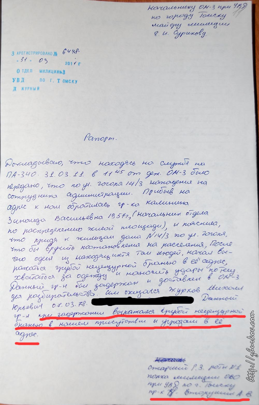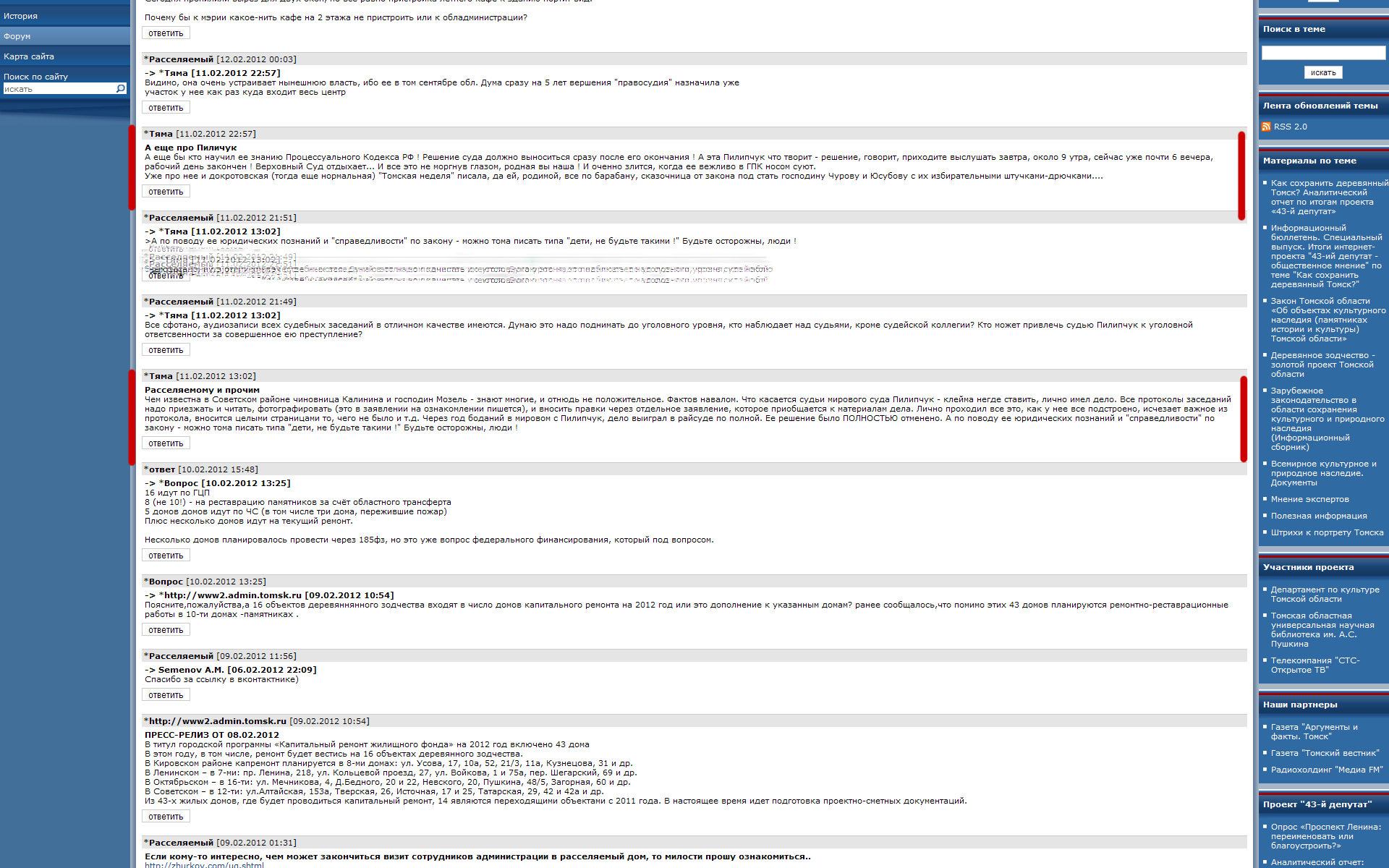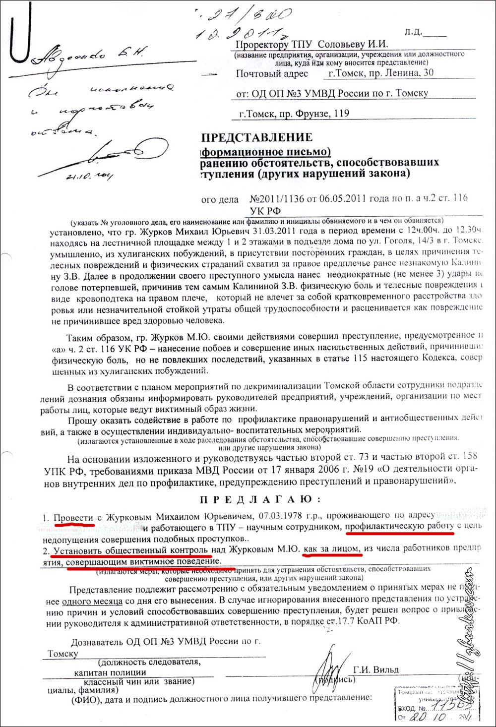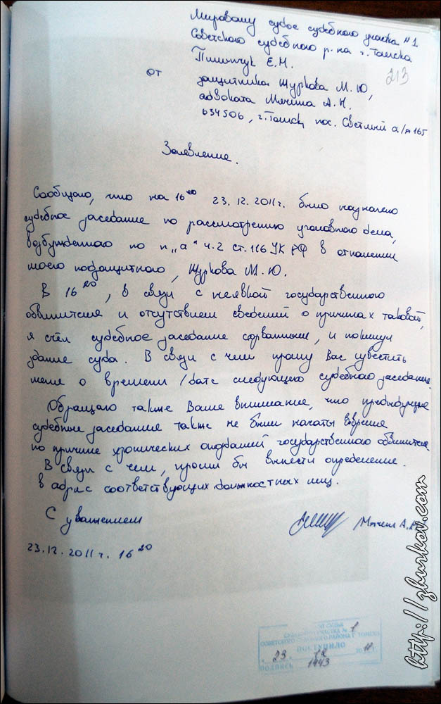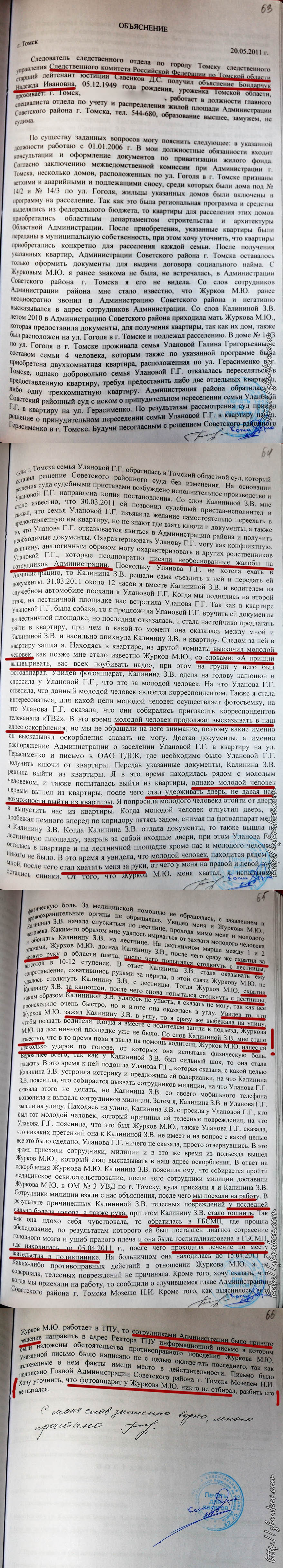 АннотацияДля тех, кому лень/некогда читать, коротко обо всем, что здесь на странице написано*.Я пытался сфотографировать работу чиновников из администрации Советского района в расселяемой квартире. Т.к. им это не понравилось, одна из них (Бондарчук) попыталась разбить мою зеркалку, но я этого не дал сделать. Отпустив камеру, она ударила меня по лицу, и они начали убегать, я на ходу остановил Калинину, схватив за руку, и эмоционально высказался по поводу ведомого администрацией расселения. Вызвав милицию, чиновницы сказали, что якобы я их оскорблял, пытался скинуть с лестницы и бил по голове кулаками. По данному поводу их начальник (Мозель - в то время управляющий делами мэрии) написал мне на работу письмо клеветнического содержания, что якобы я избил Калинину и у нее сотрясение мозга. Я написал в СК, чтобы Мозеля привлекли за клевету. Мне в этом отказали (Савенков), а в милиции завели дело наоборот на меня за побои. Следствие (Вильд) велось с нарушениями УПК РФ и даже с подлогом материалов уголовного дела. Все обвинение строилось на показаниях "потерпевшей" и ее свидетеля, а также синяке, что, оказывается, остался у нее на руке из-за моего неосторожного захвата. Никаких побоев и сотрясения мозга судебная экспертиза, естественно, не нашла. В мировом суде я предъявил диктофонную аудиозапись произошедшего. Вконец запутавшись в своих заведомо ложных показаниях, работницы администрации заявили, что якобы я все оскорбления и побои вырезал. Мы с адвокатом заявили ходатайство об экспертизе записи, однако с подачи прокурора Мартыновой судья Пилипчук отказала в ее проверке, сказав, что якобы аудиозапись получена непроцессуальным способом, хотя до этого она сама же ее в процесс и ввела. В итоге в своем решении признала меня виновным в совершении инкриминируемых побоев и иных насильственных действий из хулиганских побуждений, т.к. якобы это было в общественном месте, был нарушен общественный порядок, и некие посторонние лица это все наблюдали. После ознакомления с протоколом судебного заседания мы обнаружили, что в нем слова свидетелей, как и наши, искажены, в протоколе присутствуют нужные для обвинительного приговора реплики, вопросы и ответы, которых в действительности в суде не было, о чем свидетельствует аудиозапись судебного заседания, которую вел защитник. Подали замечания на протокол, но важные замечания, конечно, Пилипчук не удовлетворила. Указанное заведомо неправосудное решение обжаловали в апелляционном порядке в Советском районном суде. Сразу же судья Зуев отказал нам в вызове путающейся в своих ложных показаниях Бондарчук, а потом отказал и в экспертизе аудиозаписи, т.к. якобы выводы эксперта будут предположением, а на нем не может быть основан приговор, видимо, забыв, что мы требуем оправдания. Калинина в суд притащила некую выписку из больницы, где она якобы лежала, там указаны 2 кровоподтека на голове, и что она теряла сознание. Данная сфальсифицированная выписка прямо противоречит всем судмедэкспертизам. И, несмотря на это, апелляционную жалобу Зуев не удовлетворил, приговор оставил в силе. Постановление Зуева обжаловали в кассационном порядке в Областном суде. Коллегия (Нестеров, Тыняный и Каргина) отказала в удовлетворении кассационной жалобы, сославшись на доводы Зуева, и "забыв" внести в протокол ходатайство адвоката п