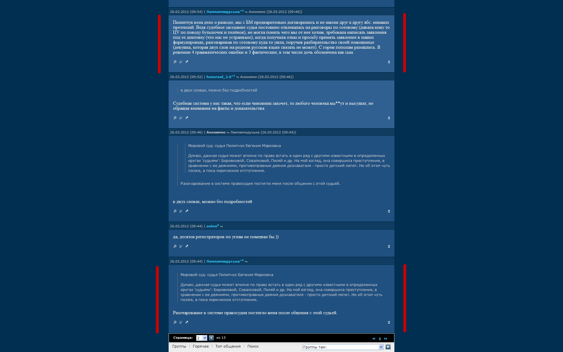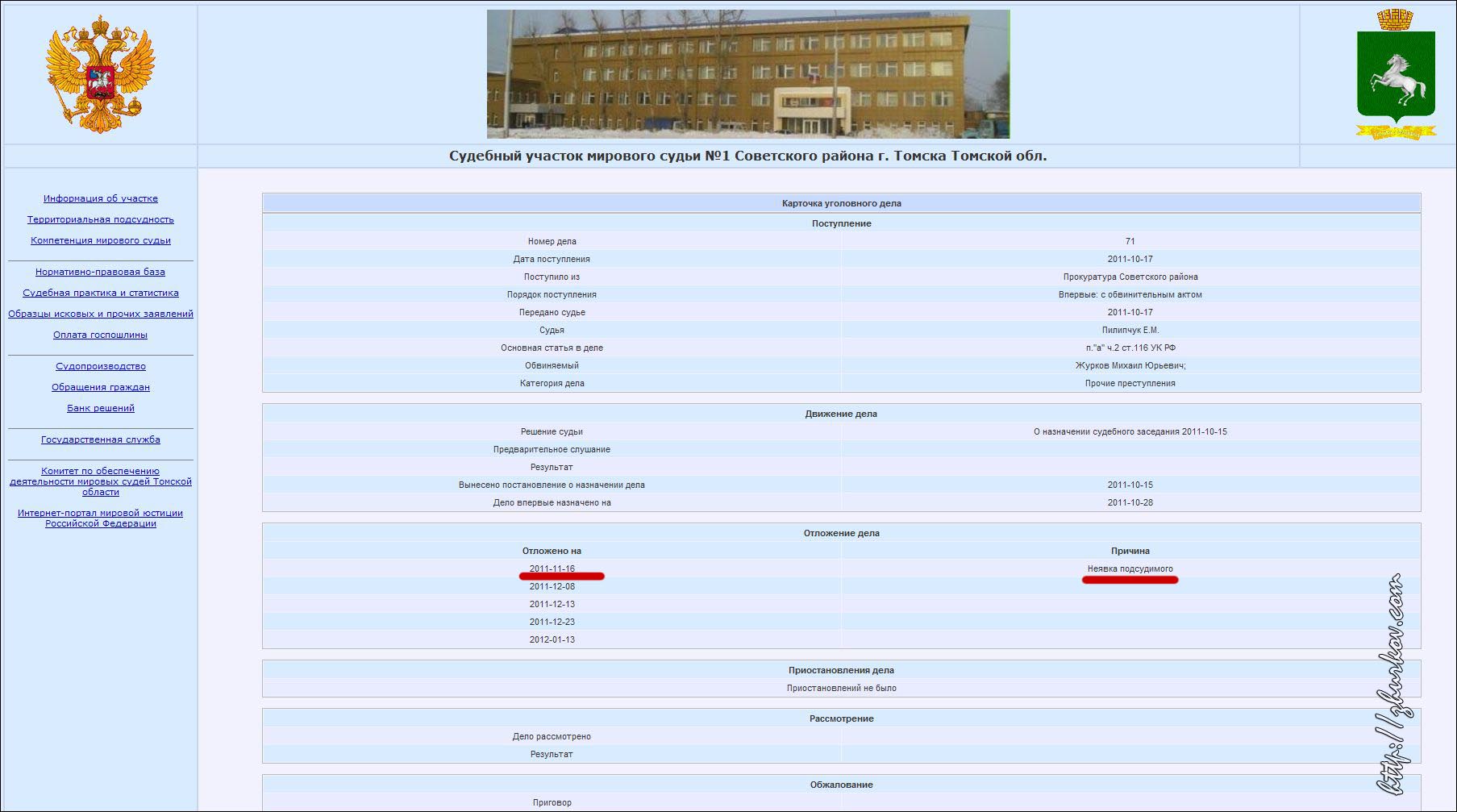 Из открытых источников (сайта Одноклассники) известно, что некая Евгения Ткаченко, именуемая в определенных кругах как "Джонни", очень походит на вышеуказанную судью, окончила ТГУ, как и Пилипчук, в 1994 году (скриншот). Как видно из информации, размещенной на вышеуказанном сайте, она, скорее всего, знает, как похудеть, иногда занимается спортом, любит гидромассаж и понежиться в Средиземном море, а также имеет многочисленных родственников, проживающих в Израиле, которые всем сами и сообщают эти душещипательные подробности о "Джонни" с ее согласия. К сожалению, является ли она указанной судьей, достоверно не известно, может быть, этот профайл зарегили "злые языки"?В интернетах обычные люди, или, может быть, опять некие "злые языки" про данную судью пишут весьма нелестные отзывы - на двух разных конференциях наткнулся на такие комментарии ее "успешной" деятельности (скриншоты): на Томских форумах, на форуме Законодательной Думы ТО. Забегая вперед, скажу, что сейчас я лично не вижу оснований не доверять этим, пусть и анонимным, сообщениям в сети. День первый: допрос свидетелей (аудио) Что касается дела, то по тому, как пошел процесс, моему новому адвокату сразу стал виден обвинительный уклон этого "правосудия". На первой нашей встрече 16.11.2011, продлившейся дольше всего (около 4 часов), был произведен допрос всех имевшихся свидетелей. Зал заседаний был настолько мал, что все свидетели еле вошли, т.е. об "открытости" судебного заседания можно говорить лишь для галочки. Правда, адвокат вел аудиозапись заседания, поэтому если есть желающие ознакомиться с процессом, то они могут всегда это сделать.Сразу же возникли противоречия в показаниях не только самой "потерпевшей" Калининой, которая сказала, что не помнит, сколько ударов было, т.к. была в некой "отключке", хотя ранее она неоднократно подписывалась под "не менее 3х ударов", но и главного свидетеля - Бондарчук, ибо в показаниях, данных ментам (а также в СК РФ), Бондарчук сообщала, что побоев не видела, о них знает только со слов "потерпевшей". Тут же она вдруг с места в карьер заявила, что наоборот якобы все видела своими глазами, как я избиваю Калинину кулаками по голове, причем даже показала, как это было, жестами, и зачем-то добавила, что якобы Калинину после этого "тошнило" (судя по всему, это отголоски истории с клеветническим письмом:) Здесь кусок аудиозаписи этой части допроса. У меня полезли глаза на лоб - думаю, ну-и-нууу, что творится-то... Ее начали спрашивать, как же так получилось-то, что на следствии одно, а тут другое, на что она заявила, что не видит разницы между тем, когда речь идет о пересказе чьих-то слов и тем, когда рассказывает, о том, что увидела своими глазами. Вот этот момент допроса. Из этого само собой напрашивается 2 вывода: 1) в администрации работают банально тупые, 2) врет. Забегая вперед, скажу, что в итоге суд/обвинение склонился к первой трактовке, типа разные люди бывают. В один момент заметил, что Калинина что-то внимательно высматривает на столе в бумагах адвоката, оказалось, рассматривала расшифровку аудиозаписи, о которой мы еще не сообщали... Вранье было настолько очевидным, было столько несостыковок, что, как только закончился допрос свидетелей обвинения, вдруг вскакивает Калинина и заявляет, мол, "я хочу прекратить этот суд", т.к. якобы она меня простила и все забыла, и не хочет больше р