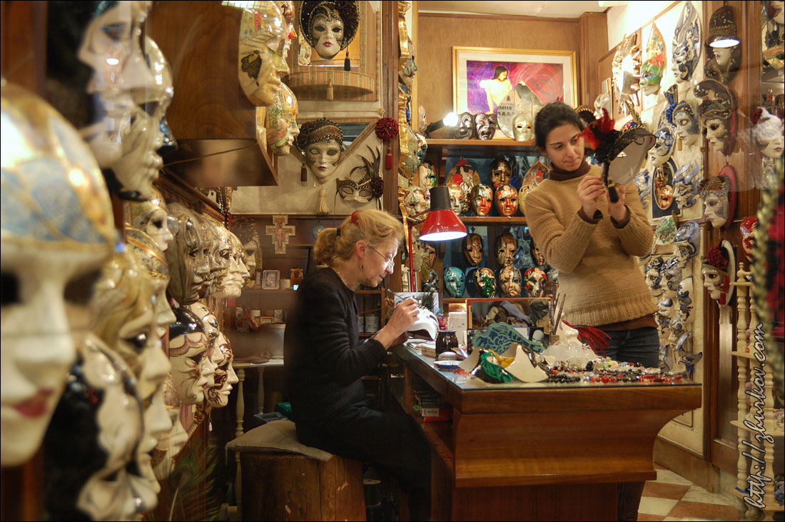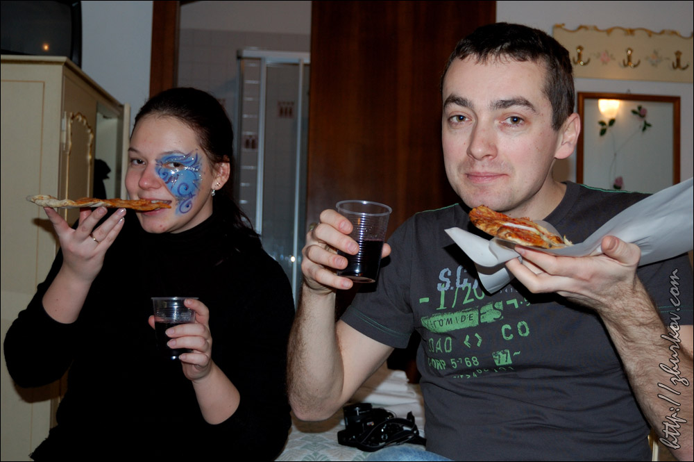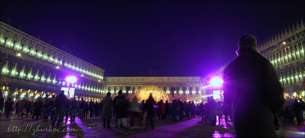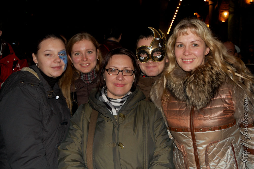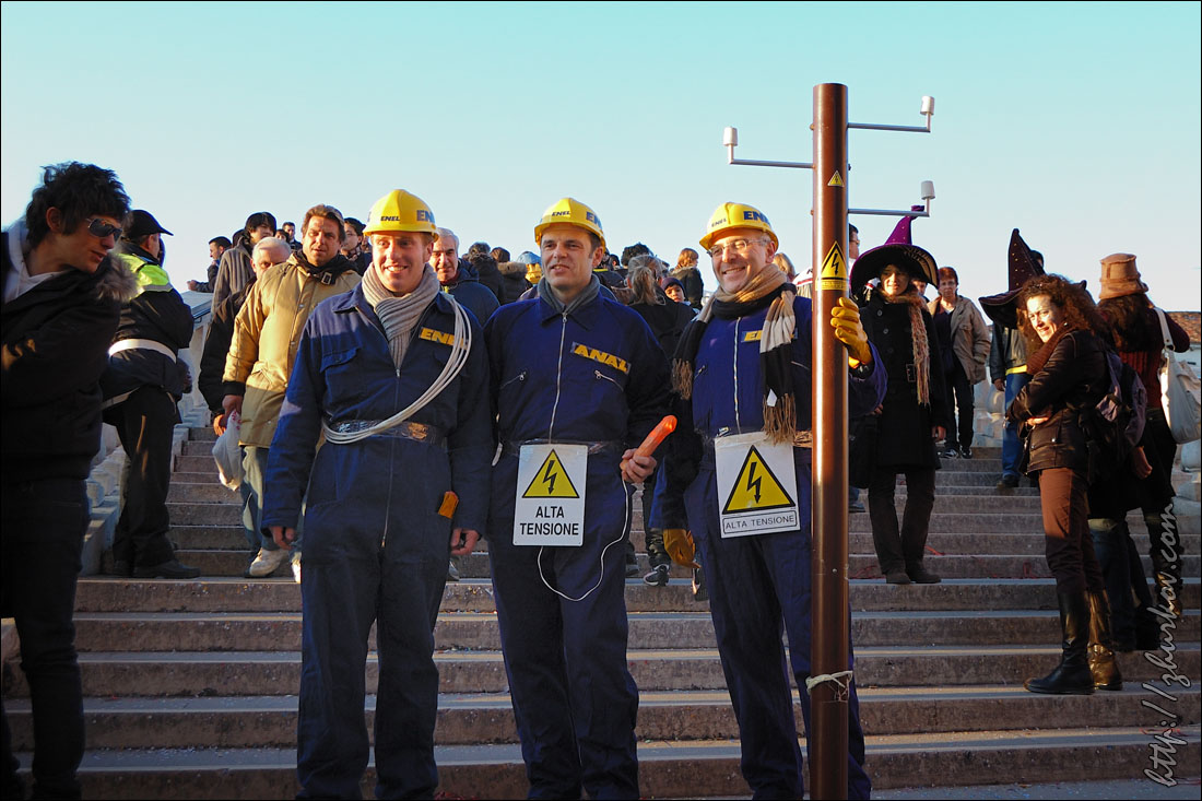 Маски специально позируют фотографам, которые обступают их со всех сторон.Вдоволь нафотографировавшись, пошли в поисках чего-нибудь перекусить, но что-то мне показалось, что с питанием в Венеции сложновато, купленная пицца оказалась совсем не такой, какую я покупал в Риме (квадратная, нарезается прямоугольниками), здесь она была круглая, как привыкли видеть мы в наших пиццериях, на вкус - конечно, лучше нашей, но в Риме мне пицца понравилась больше. На улицах Венеции тоже можно встретить Маски, иногда целые семьи наряжаются в карнавальные костюмы и дефилируют по городу. Недалеко от ж/д вокзала на мосту Скальци (Ponte degli Scalzi, 1934) встретили таких вот оригинальных "электриков", пошловато обыгрывающих название известной итальянской энергетической компании Enel, с близкой мне как высоковольтнику табличкой "Alta tensione":)) Вечером прилетела вторая девушка из нашей небольшой компании, и мы пошли гулять по вечерней Венеции. Где-то наткнулись на сувенирные лавки, в которых на виду у всех раскрашивали маски. Для тех, кто хочет почувствовать праздник, но не хочет приобретать маску недалеко от площади Сан-Марко также можно было сделать карнавальную маску-макияж, что и было опробовано:)) На самой же площади начался заключительный праздничный концерт. Несмотря на огромное количество народа, там мы встретились с другой группой DAAD-шников, которые тоже поехали в эти дни на карнавал:)) И опять, как в Стокгольме, встретились с ними совершенно случайно:))