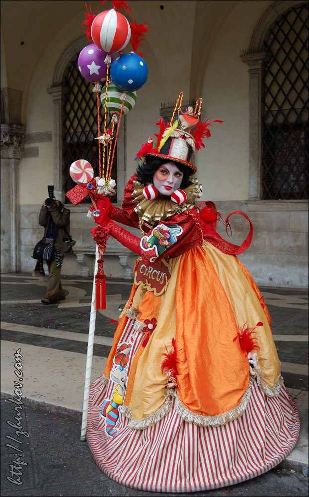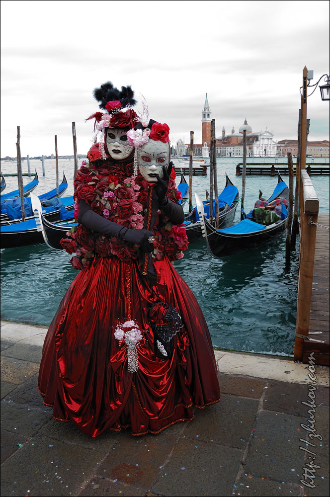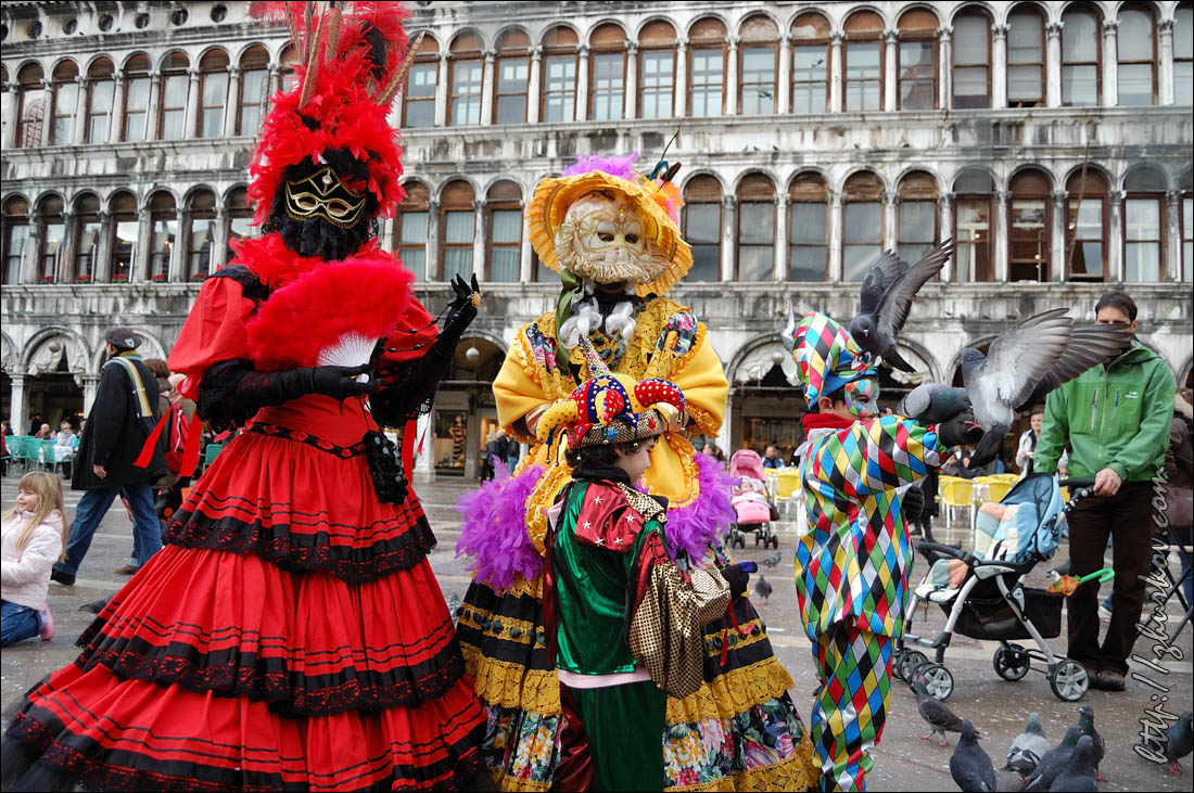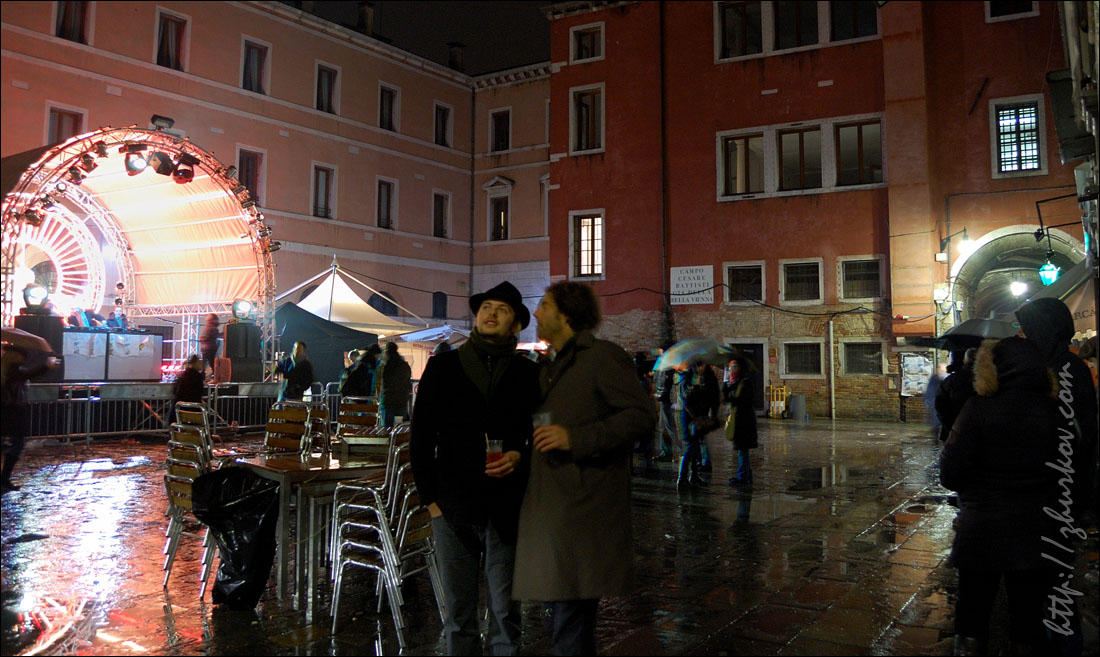 Маски специально позируют фотографам, которые обступают их со всех сторон.Вдоволь нафотографировавшись, пошли в поисках чего-нибудь перекусить, но что-то мне показалось, что с питанием в Венеции сложновато, купленная пицца оказалась совсем не такой, какую я покупал в Риме (квадратная, нарезается прямоугольниками), здесь она была круглая, как привыкли видеть мы в наших пиццериях, на вкус - конечно, лучше нашей, но в Риме мне пицца понравилась больше. На улицах Венеции тоже можно встретить Маски, иногда целые семьи наряжаются в карнавальные костюмы и дефилируют по городу. Недалеко от ж/д вокзала на мосту Скальци (Ponte degli Scalzi, 1934) встретили таких вот оригинальных "электриков", пошловато обыгрывающих название известной итальянской энергетической компании Enel, с близкой мне как высоковольтнику табличкой "Alta tensione":)) Вечером прилетела вторая девушка из нашей небольшой компании, и мы пошли гулять по вечерней Венеции. Где-то наткнулись на сувенирные лавки, в которых на виду у всех раскрашивали маски. Для тех, кто хочет почувствовать праздник, но не хочет приобретать маску недалеко от площади Сан-Марко также можно было сделать карнавальную маску-макияж, что и было опробовано:)) На самой же площади начался заключительный праздничный концерт. Несмотря на огромное количество народа, там мы встретились с другой группой DAAD-шников, которые тоже поехали в эти дни на карнавал:)) И опять, как в Стокгольме, встретились с ними совершенно случайно:))