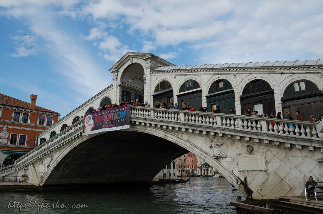 Мост имеет длину 28 м и высоту 7,5 м, что обеспечивает проход людей и судов без разведения моста. Название происходит от латинского rivus altus - глубокая вода, позволяющая навигацию судов с тяжелым грузом. В настоящее время на мосту расположены обычные сувенирные лавки. По всему городу висят указатели, как пройти к Риальто. Все вокруг ходили в масках, чтобы почувствовать себя соучастником карнавала тоже пришлось раскошелиться и купить маску:) Все нужное для карнавала продается в многочисленных магазинах, даже самые простые маски были совсем не дешевые (~15€), не говоря уж о масках и костюмах ручной работы. Больше всего масок, конечно же, на площади Сан-Марко (Piazza San Marco) - каких только карнавальных костюмов тут не увидишь, все фотографируются вместе с Масками, но не все Маски дают это делать вместе с ними:)