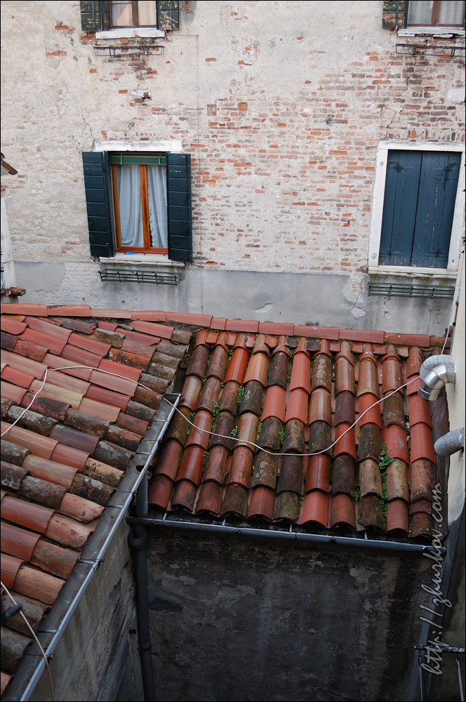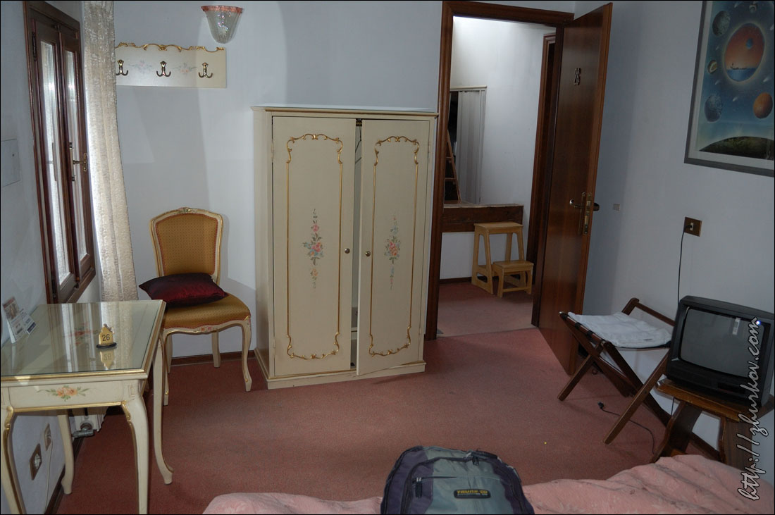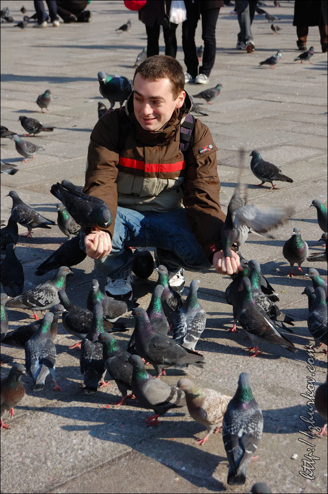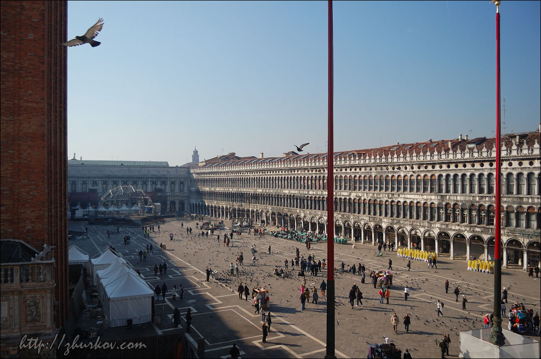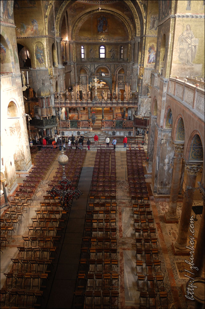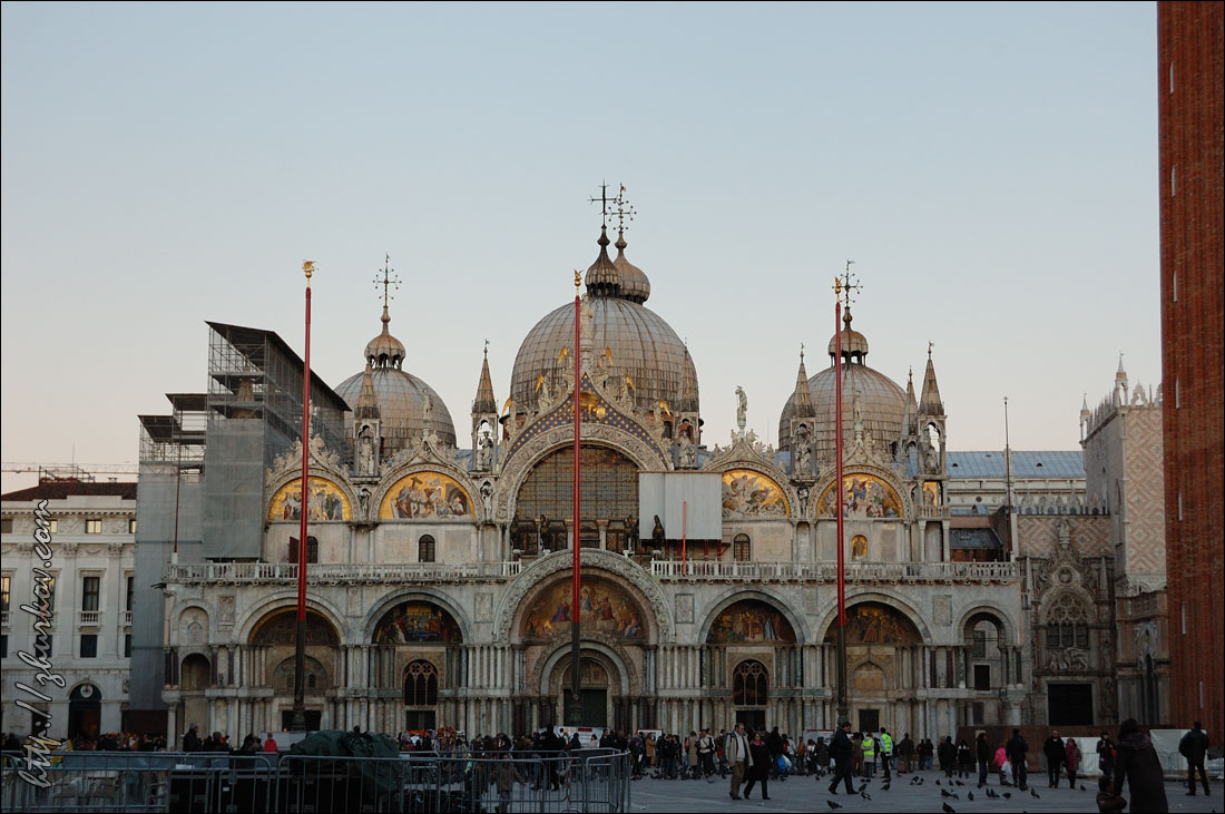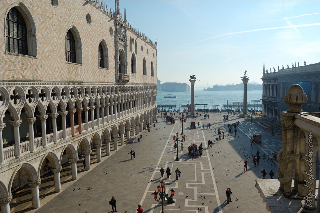 Концерт нам показался унылым - выступали какие-то музыкальные коллективы из Венеции, короче, это была не наша музыка, и мы оттуда ушли, не дожидаясь окончания.В отеле отметили хорошо проведенный день местным вином, купленным на разлив, и пиццей:) На следующий день пошли опять на Сан-Марко, покормили голубей кукурузой, которая тут же продается за символическую цену:) Голуби совершенно ничего не боятся, видно, что откормленные, похоже, что и воспитанные (не гадят), в общем, веселое было занятие:) Посетили красивый собор Сан-Марко (Basilica di S. Marco), расположенный с восточной стороны площади, оттуда открывается хороший вид на нее. Внутри посмотрели музей, вход стоил 4€, фотографировать там не разрешалось, и просто по пятам ходили надзиратели и косо смотрели на фотоаппараты. Основной достопримечательностью там считается Квадрига Святого Марка (IV век до н.э.) - четыре коня, которые когда-то украшали арку Нерона в Риме, в XIII веке квадригу установили на соборе в Венеции, потом Наполеон ее увез к себе в Париж, и она украшала арку на площади Каррузель, но в 1815 г. ее вернули на место. Сейчас на самом соборе установлена копия этой квадриги. С балкона собора также хорошо виден расположенный рядом Дворец дожей (Palazzo Ducale, 1309-1424), площадь перед ним - Пьяцетта (Piazzetta), справа - Библиотека Сансовиниана. Дож - это титул главы Веницианской республики, соответственно, в этом дворце когда-то располагалось все руководство.