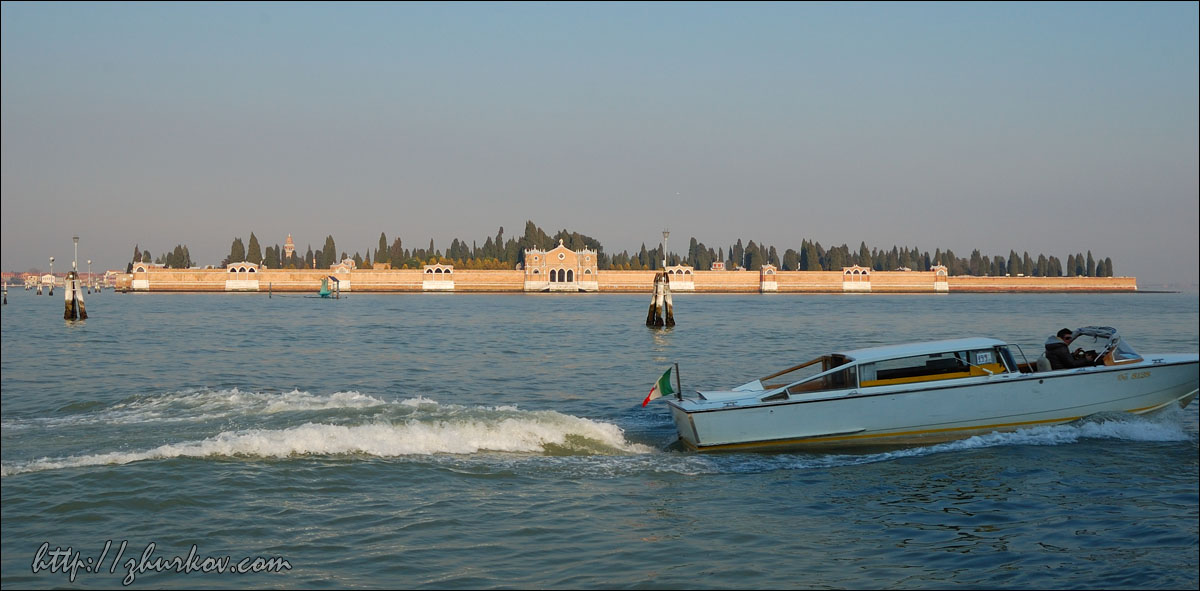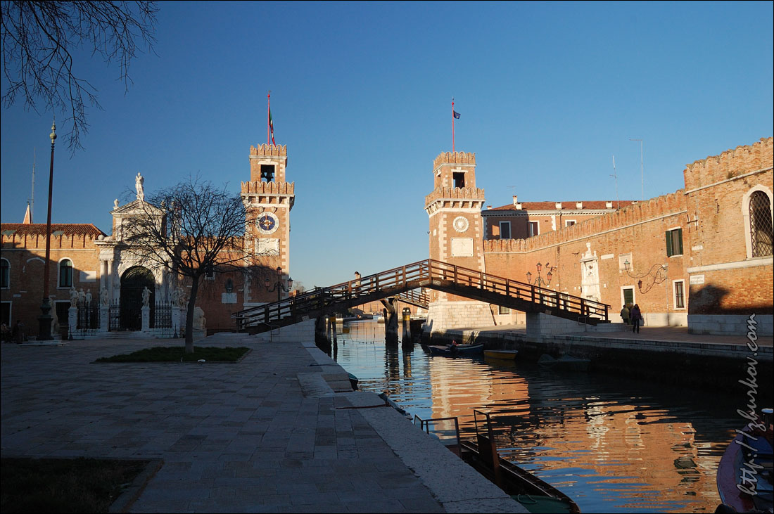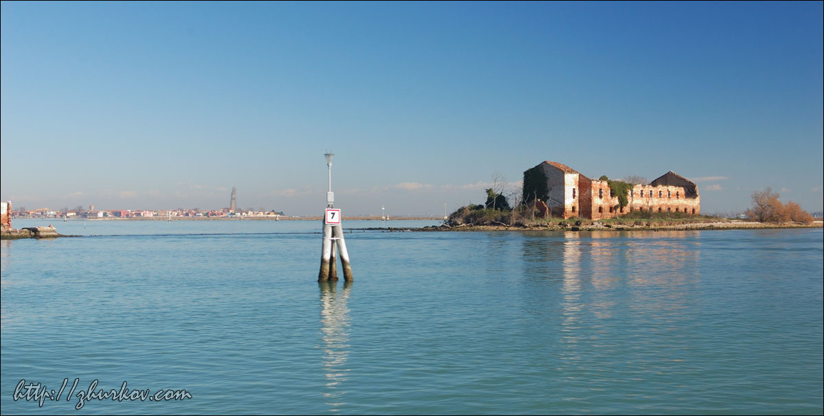 Еще говорят, что остров известен производимыми тут кружевами, но плетут ли их сейчас, или в сувенирных магазинах продаются китайские кружева, - не уточнял.Островок небольшой, обойти его можно за час. После него девченки поехали на Торчелло, а я в Венецию, т.к. билет на вапоретто истекал. На обратном пути вапоретто проезжает мимо руин на острове Мадонна-дель-Монте (Isola Madonna del Monte), когда-то тут был монастырь, потом был построен храм, который снесли и в 19-м веке устроили пороховые склады, чьи руины все и наблюдают. Остров частично затоплен, является частной собственностью, странно, что все там в таком запустении. Для постройки кораблей в Венеции был основан Арсенал (Arsenale di Venezia), впоследствии он стал крупнейшим промышленным предприятием, здесь строился итальянский флот, отливали пушки и производили порох. В настоящее время также относится к военным, во всяком случае, охраняли военные, свободного доступа на территорию нет. Если приглядеться, то можно увидеть сходство стен Венецианского Арсенала с