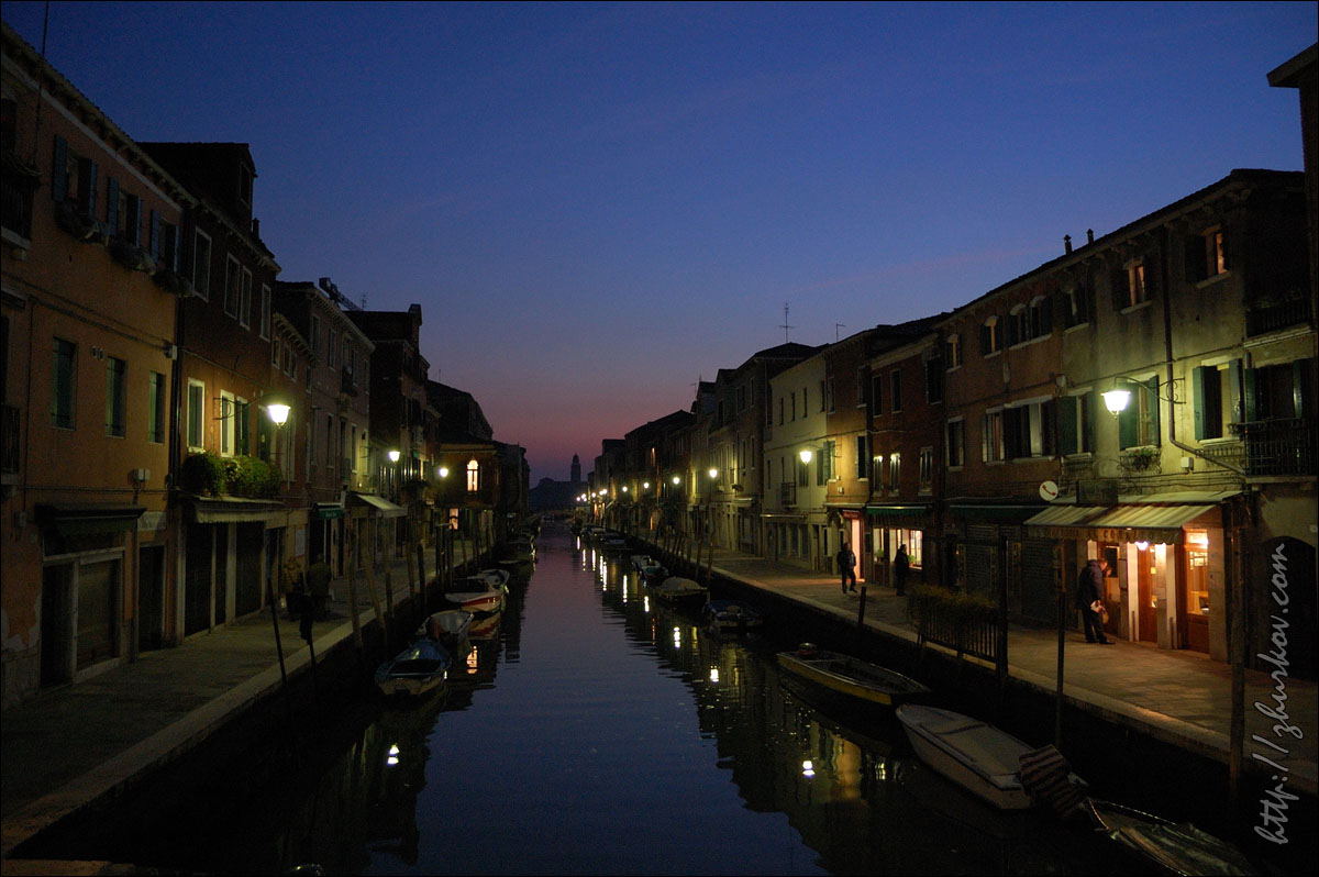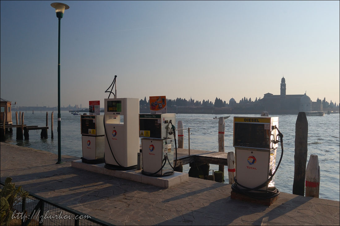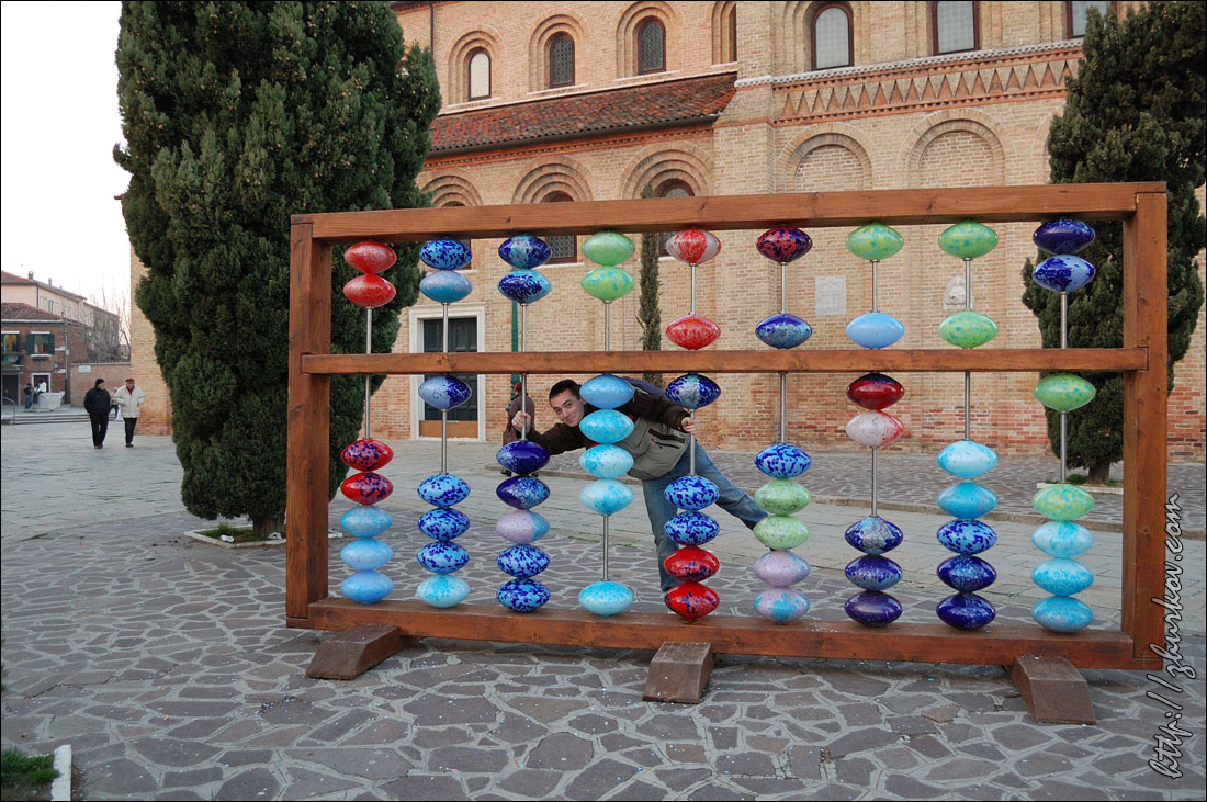 Здание готическое и очень красивое, ажурное, много мелких деталей, если присмотреться, то можно заметить, что 2 колонны сделаны из красноватого мрамора, говорят, между ними объявляли смерные приговоры, ведь в этом здании располагался суд и полиция. Внутрь собора мы не заходили, хотя, судя по путеводителю, там тоже есть на что посмотреть. На Пьяцетте, служившей раньше пристанью, расположены две колонны из красного мрамора - колонна со статуей Св. Теодора (греческий покровитель Венеции) и колонна с Крылатым львом - символом Венеции, между этими колоннами проводились публичные экзекуции и, вроде как, ходить между ними плохая примета, но почти все ходят:) Библиотека - здание в классическом стиле, внутри расположены собрания старинных произведений, книги и рукописи. Внизу находится весьма дорогое кафе. Обязательно надо было посмотреть островную Венецию, первым выбор пал на ближайший остров Мурано (Murano). Чтобы добраться до него надо садиться на вапоретто (маршрутный теплоход), туристический билет на сутки стоил 16€, для жителей Венеции проезд же гораздо дешевле.По пути к Мурано катер проезжает необычный почти квадратный остров, обнесенный кирпичной стеной, - остров Сан-Микеле (Isola di San Michele), это остров-кладбище Венеции. На Мурано увидели вот такую бензоколонку для заправки основного транспорта здесь - лодок, автомобильное движение в островной Венеции запрещено, да, собственно, и ездить автомобилям здесь попросту негде. Остров известен, прежде всего, тем, что там производят изделия из стекла. Муранское стекло является элитным товаром, т.к. сделано по оригинальной технологии, это штучный товар ручной работы. Хотя на вид, на мой взгляд, ничего особенного, немного вульгарно, мне такое не нравится. Сходили на бесплатное мини-шоу, где перед зрителями в несколько человек работал стеклодув и смастерил стеклянную фигурку. Здесь же продаются всякие безделушки из муранского стекла. На Мурано повсюду установлены разные штуки из цветного стекла, которые еще и подсвечиваются ночью.